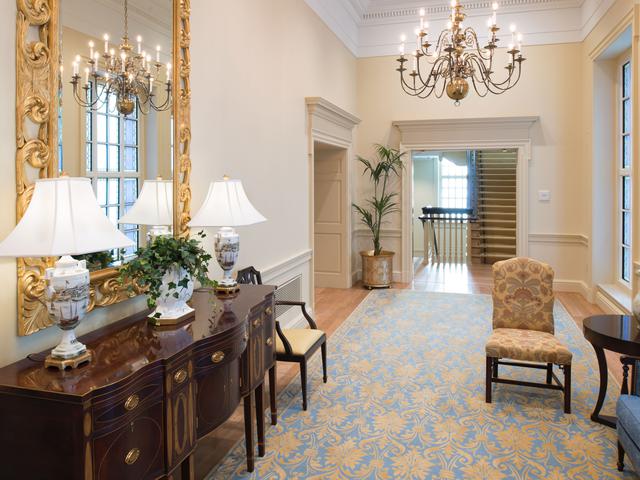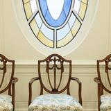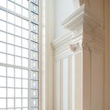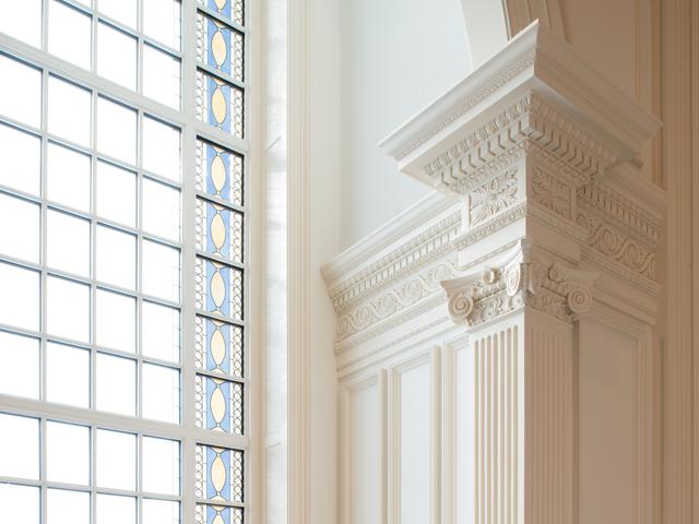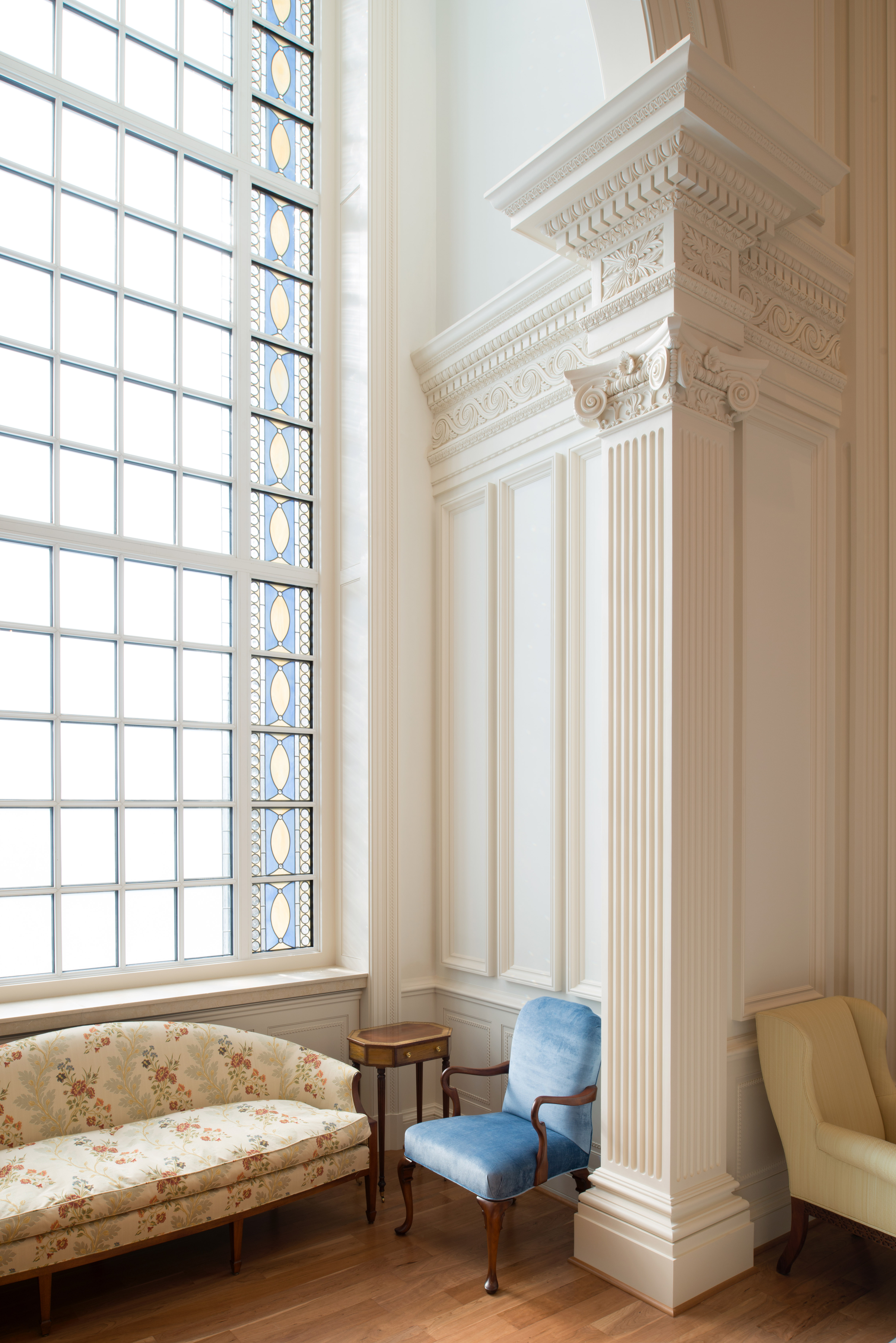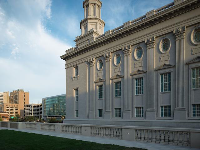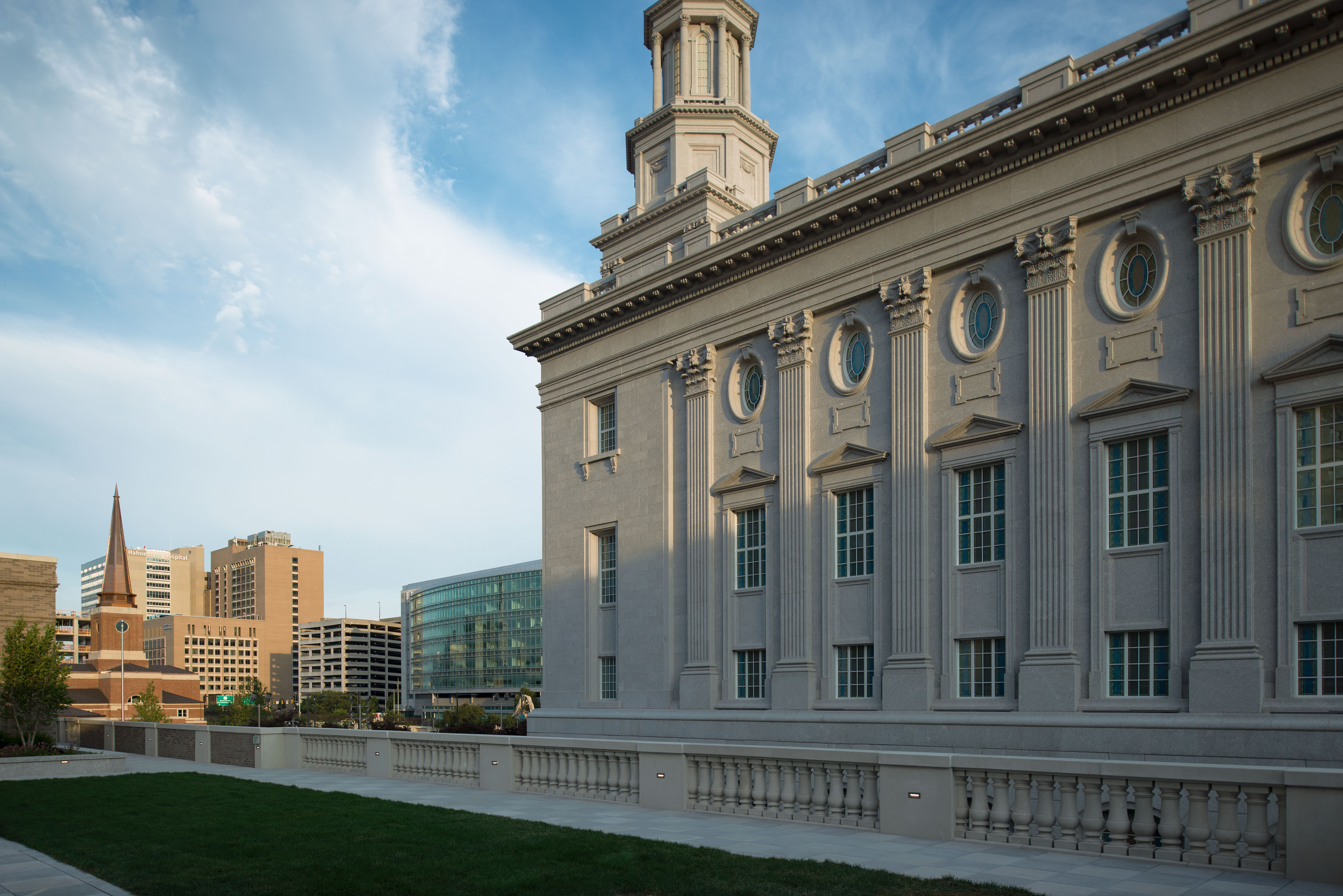 The 61,000-square-foot temple features classic Georgian architecture designed to blend with the historic Philadelphia architecture. The exterior is clad in granite from Maine, and the interior features stone from Egypt and Italy. The building includes original art glass and an oil-painting wall mural of landscapes important in both American and Church history, including the Susquehanna River and the Delaware River. The temple stands 208 feet tall and is crowned with a gilded statue of Moroni, a Book of Mormon prophet who is significant to Latter-day Saints for his role in the Restoration of the gospel of Jesus Christ.