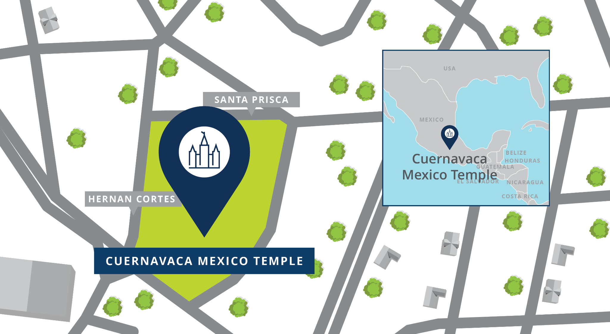 This temple will be built on a 5.36-acre site located southeast of the corner of Calle Hernán Cortes and Calle Santa Prisca in Colonia Vista Hermosa, Cuernavaca, Morelos, Mexico. Plans call for a single-story temple of approximately 19,000 square feet.