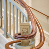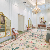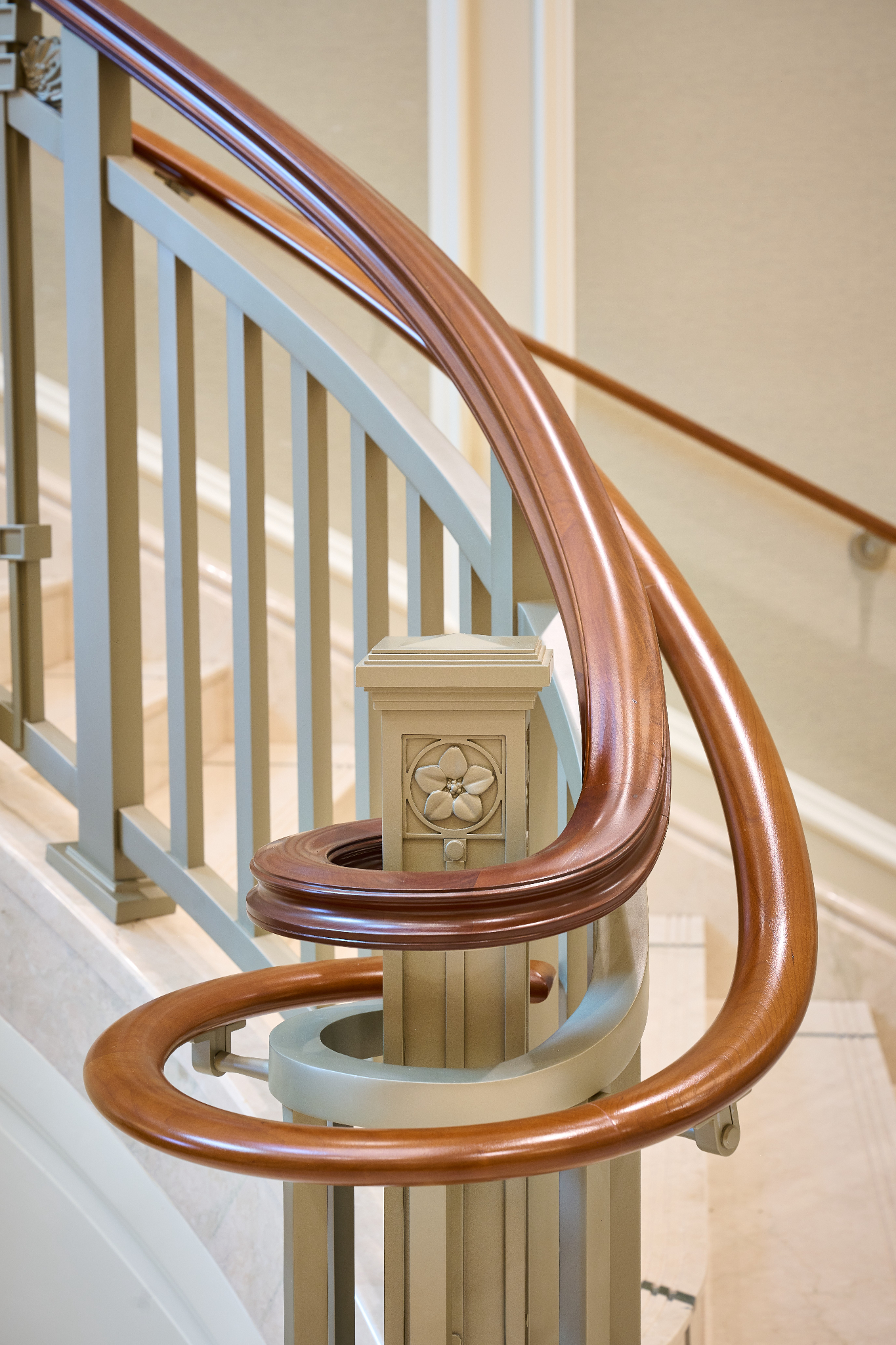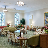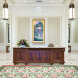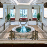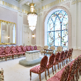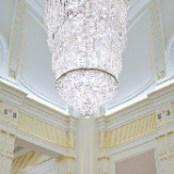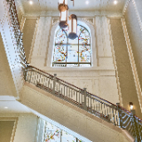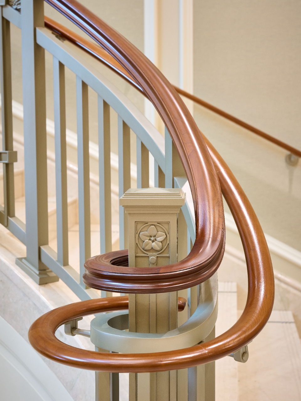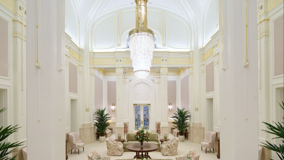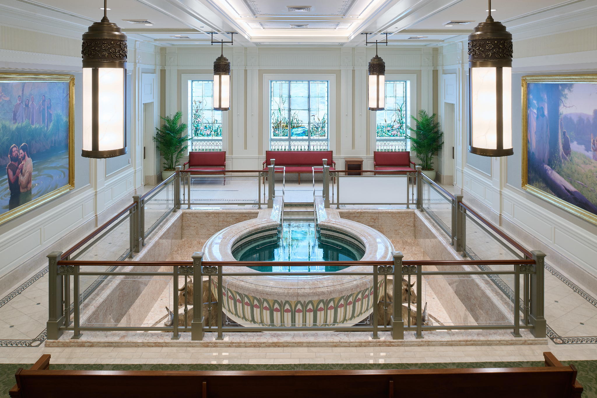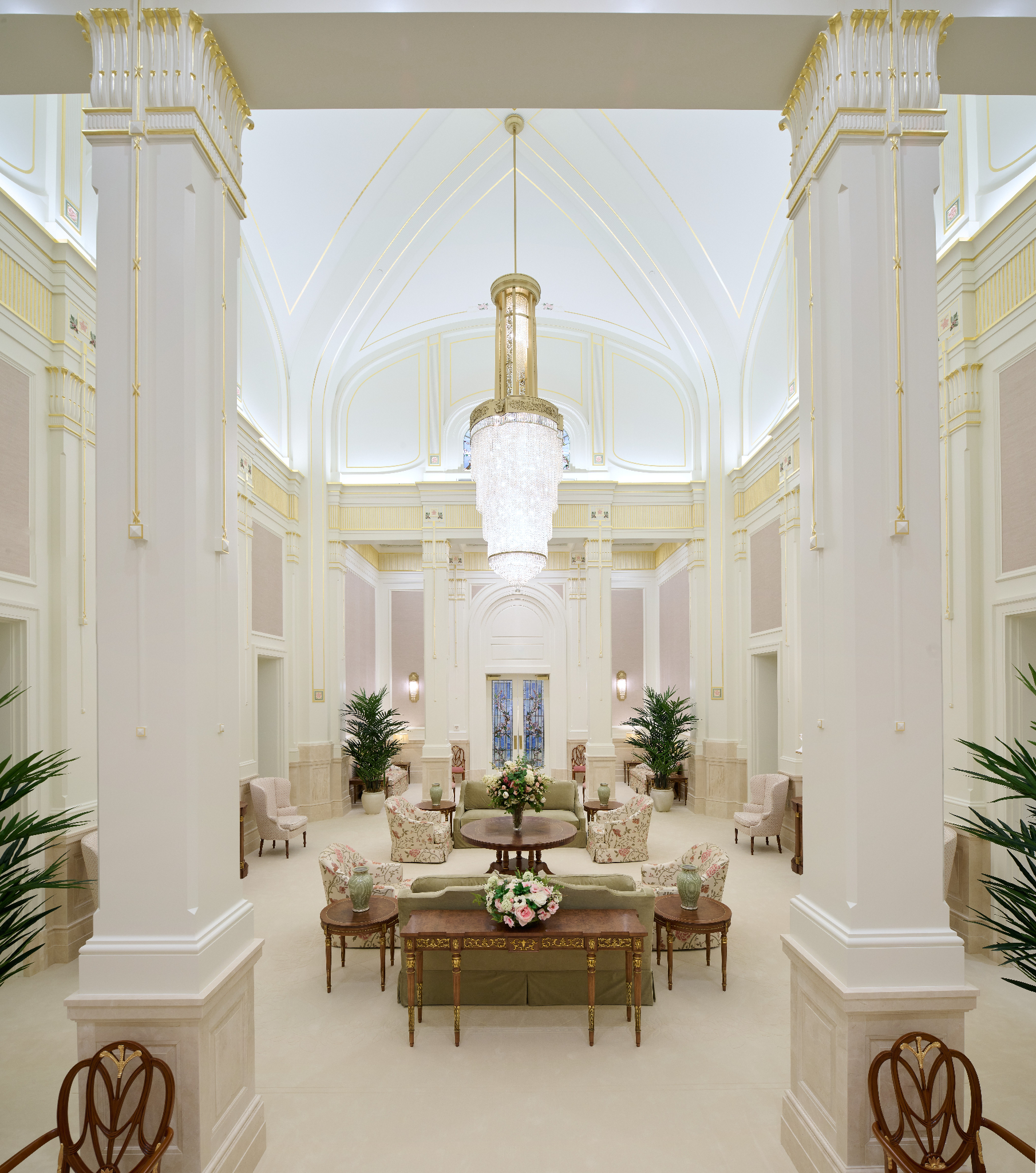 Similar to the exterior, the interior is simple, with natural materials. The design and finishes complement the ordinances and the significant patron areas. The use of marble wainscots and wood columns is common throughout the temple. The detail of the columns, coffered ceilings, and marble wainscot is more articulated as one moves through the ordinance rooms, culminating in the celestial room. The woodwork is painted, and the wall coverings are subtle, allowing the attention to remain on what takes place in the various rooms. The secondary spaces are simpler yet lovely.