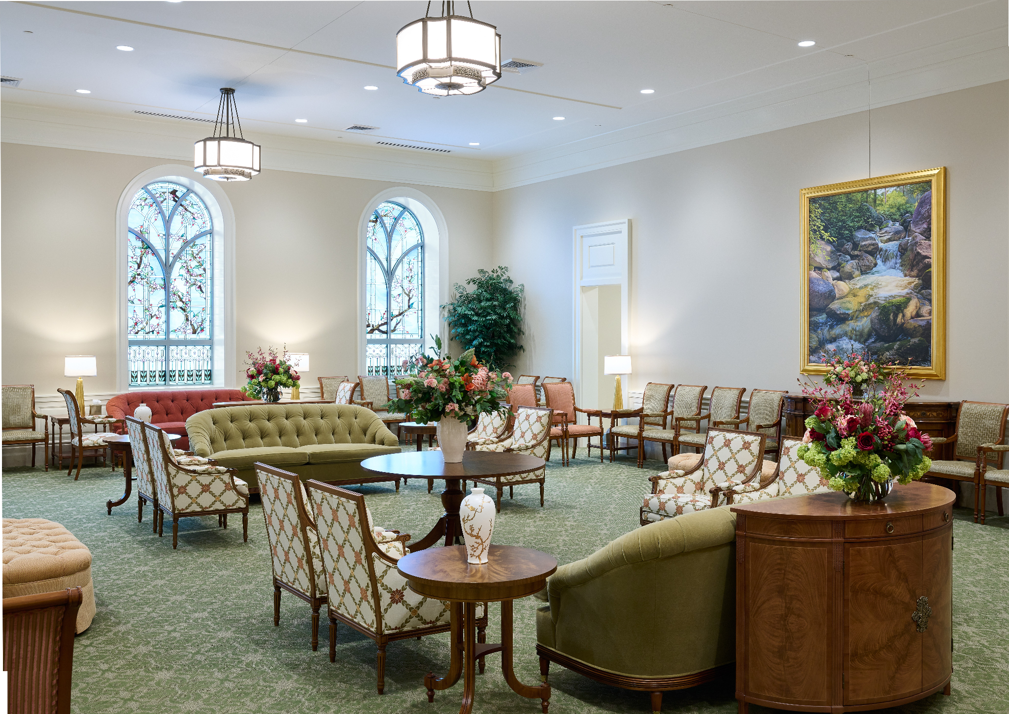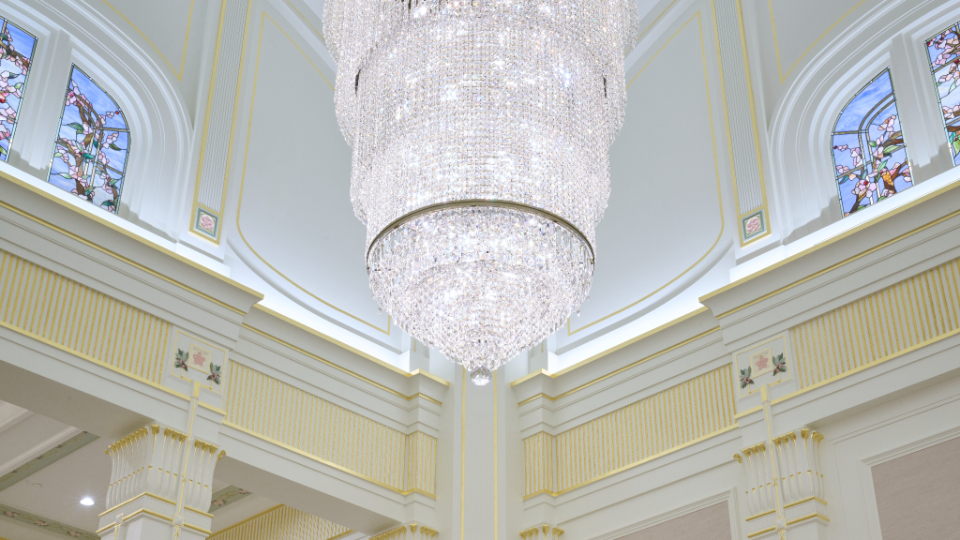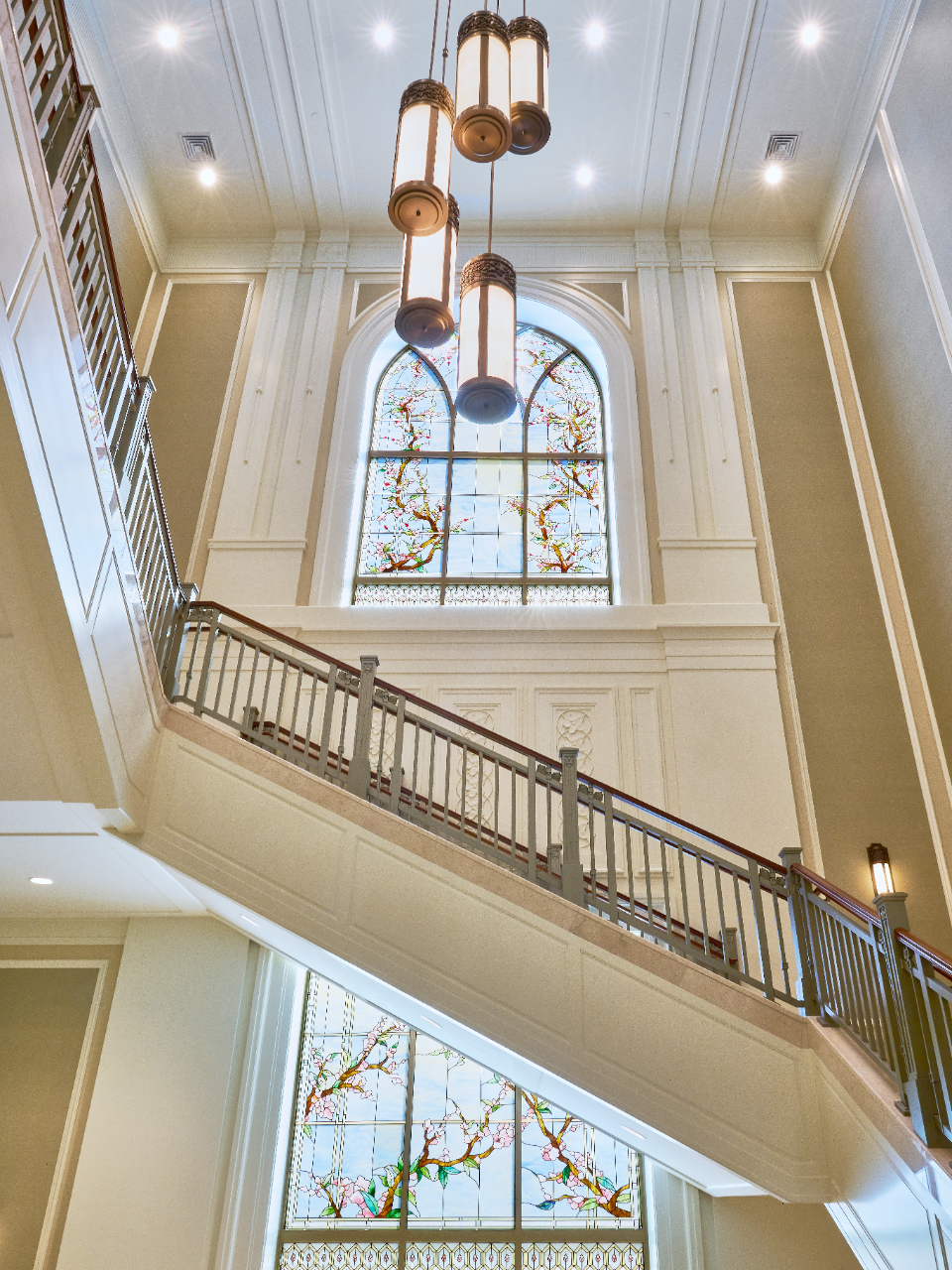 By design, the Orem Utah Temple is unique to its location; however, the images in the art glass and cherry blossom design element pay homage to the history of the site and the culture of the surrounding area.