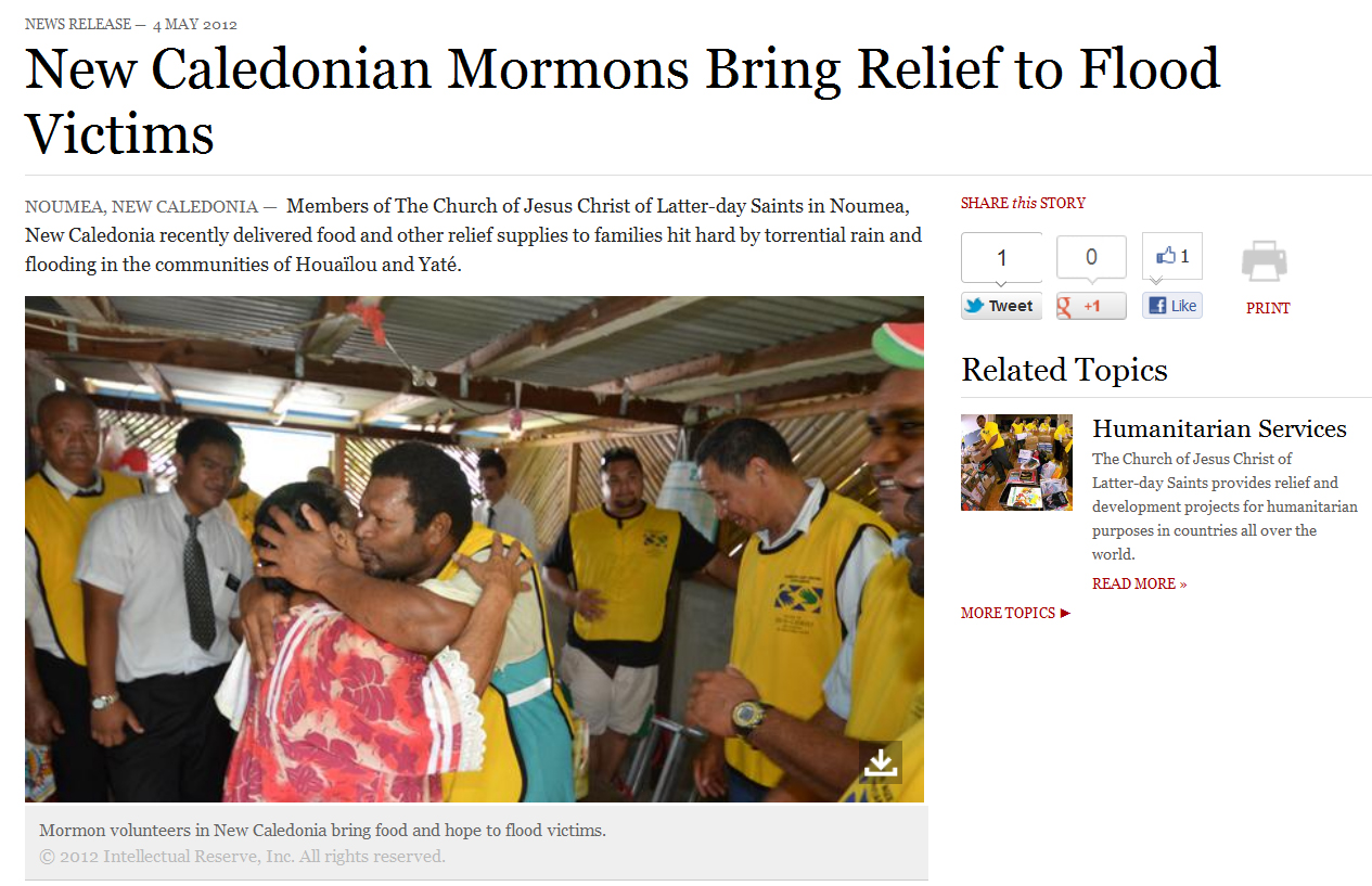 Mormon Helping Hands volunteers are members of The Church of Jesus Christ of Latter-day Saints (Mormons). Members from the community of Noumea, New Caledonia, continue to respond with food and other relief supplies to the residents of the communities.