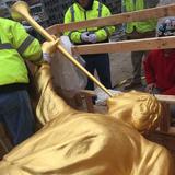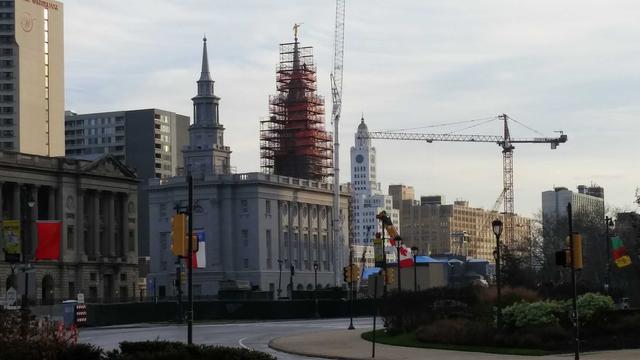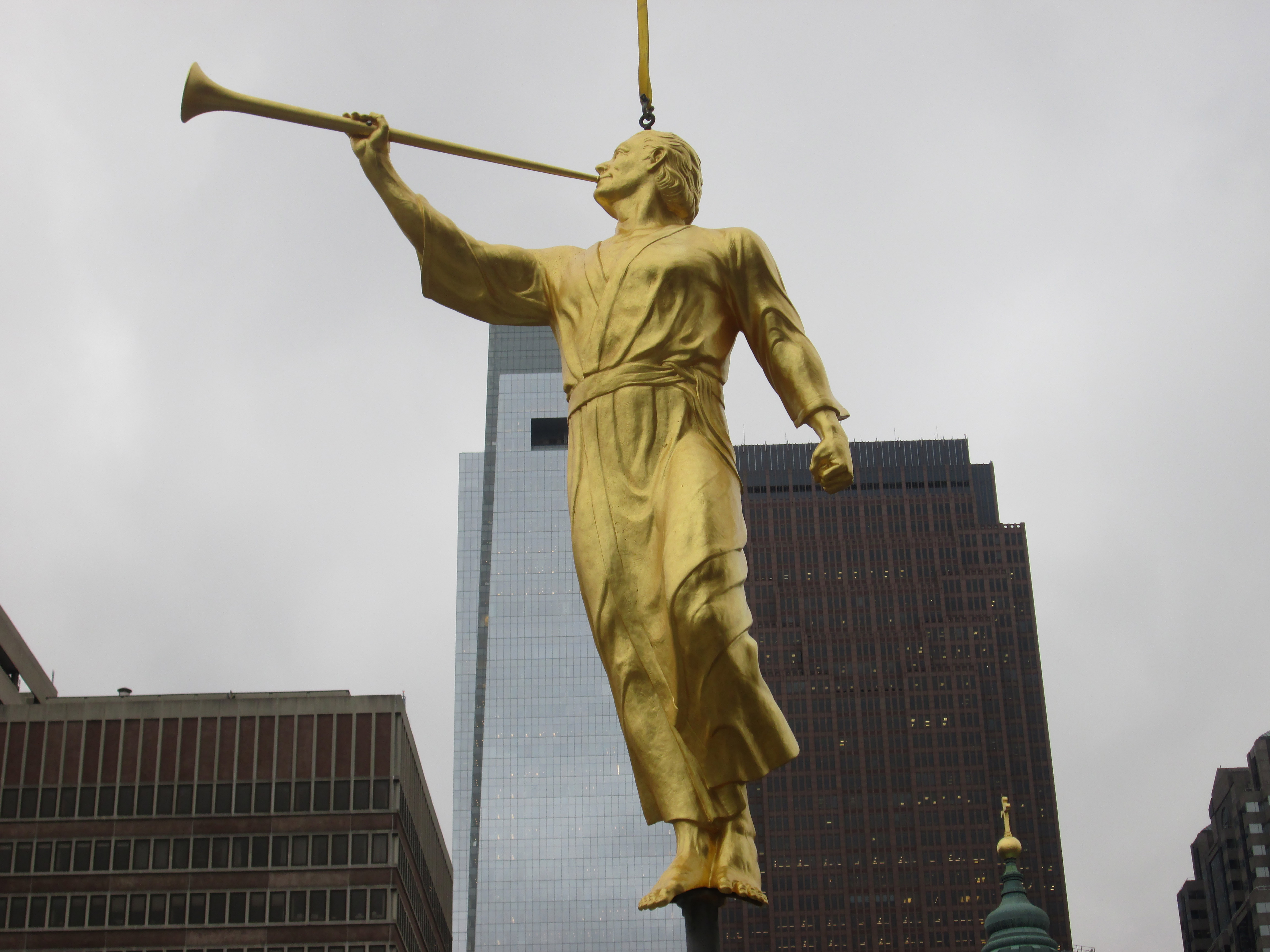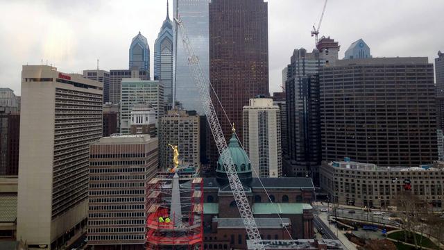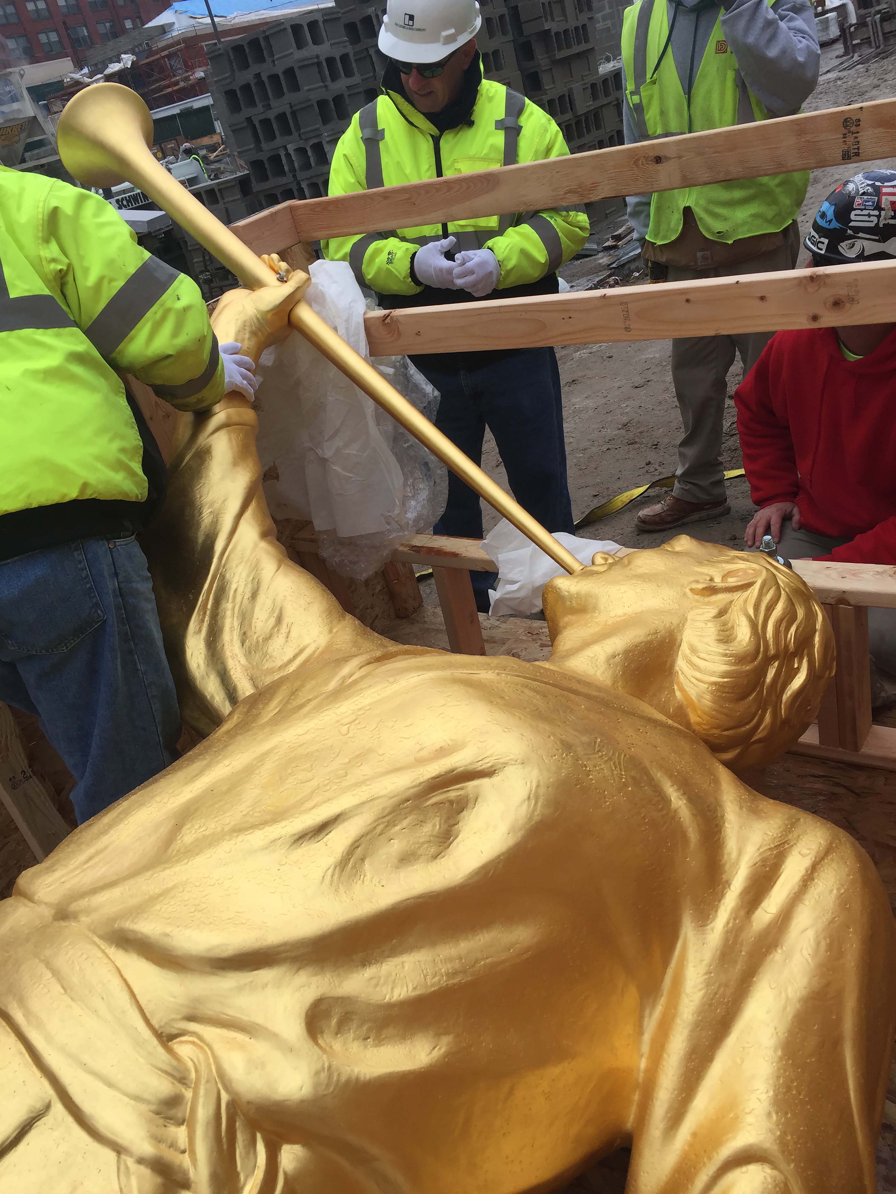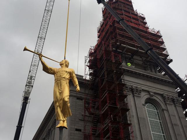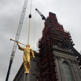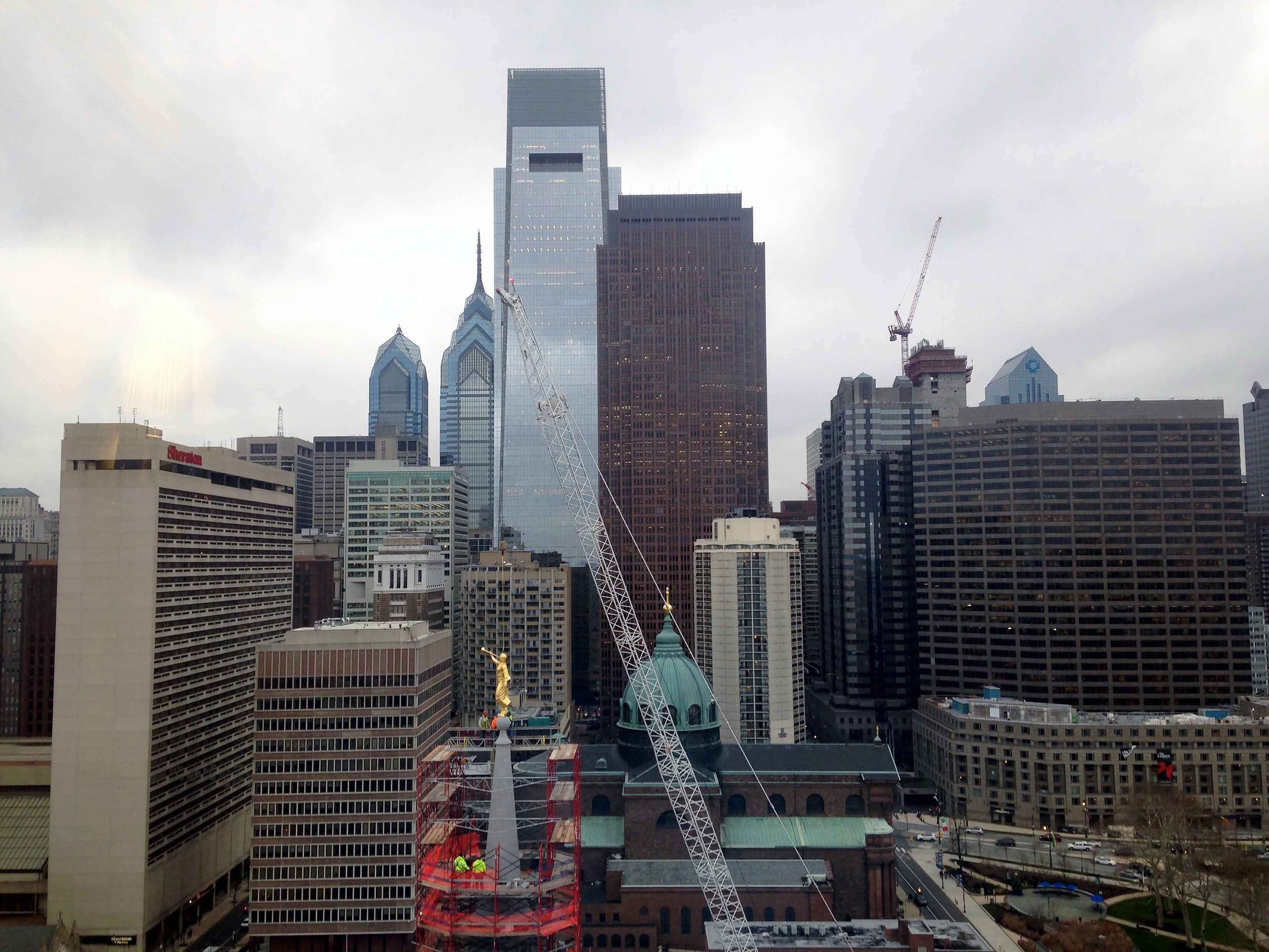 The Church of Jesus Christ of Latter-day Saints placed an angel Moroni statue atop the highest spire of its temple in downtown Philadelphia on December 30, 2015. This is a major milestone in the construction of the first Mormon temple in Pennsylvania.