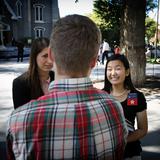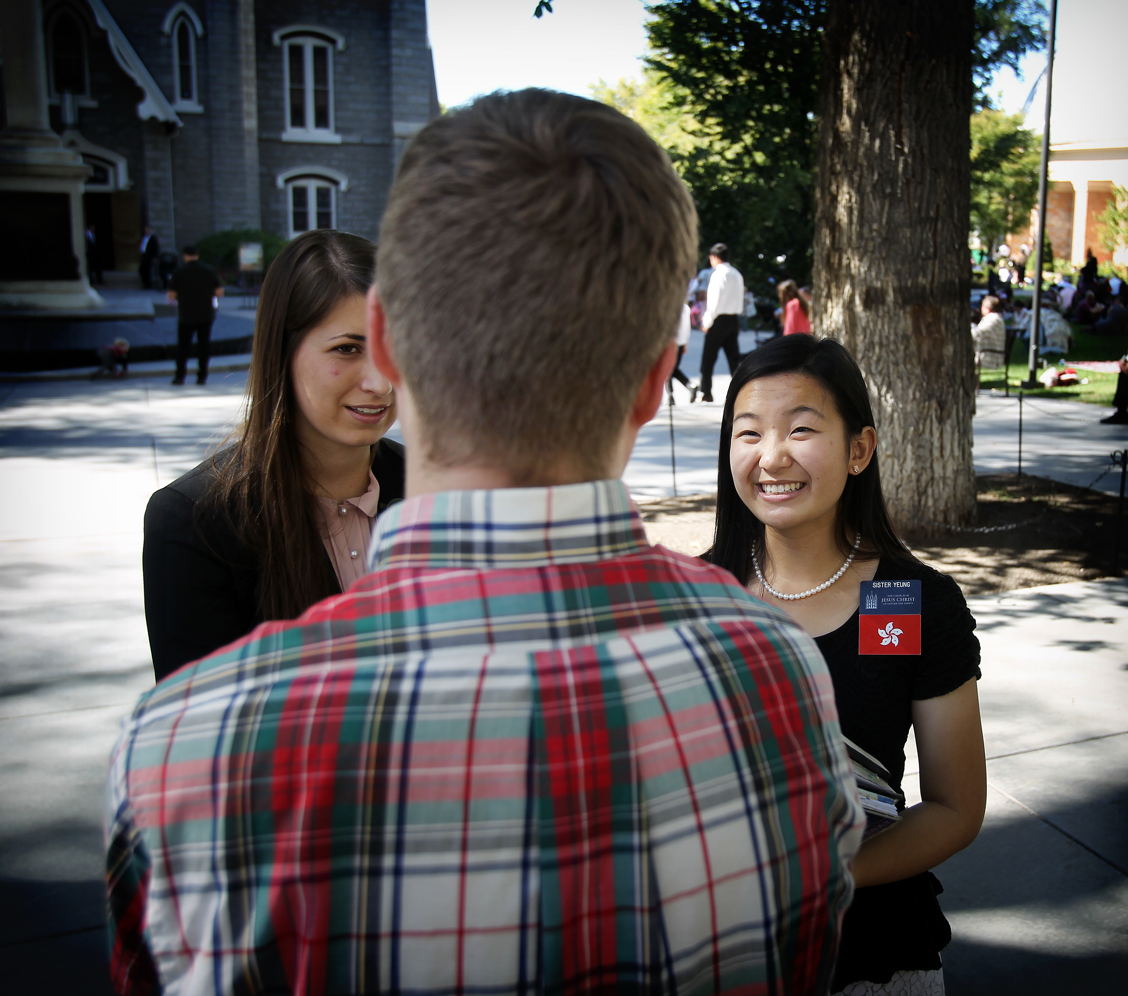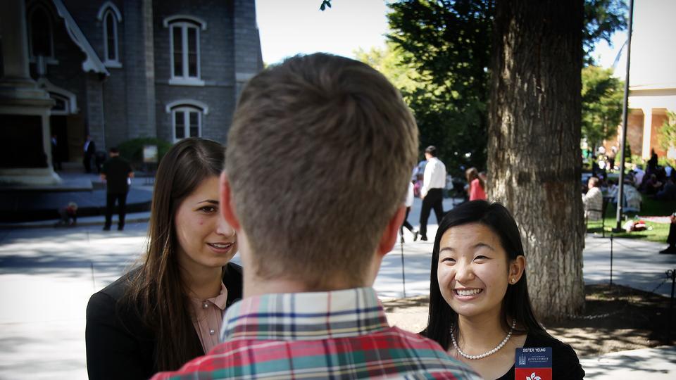 Sister missionaries assist those on Temple Square during general conference weekend. They also provide tours of Temple Square throughout the year.
