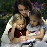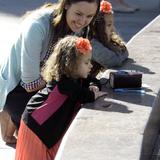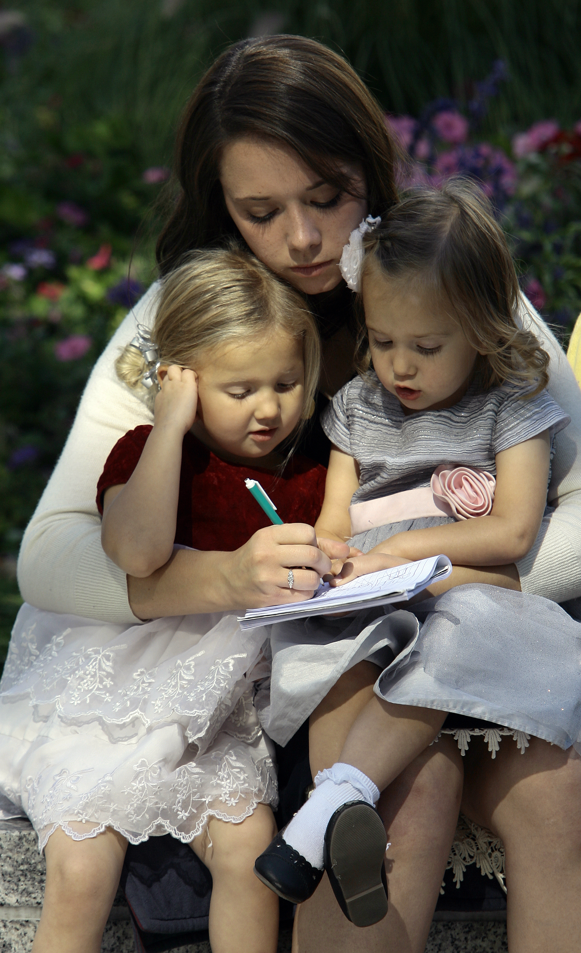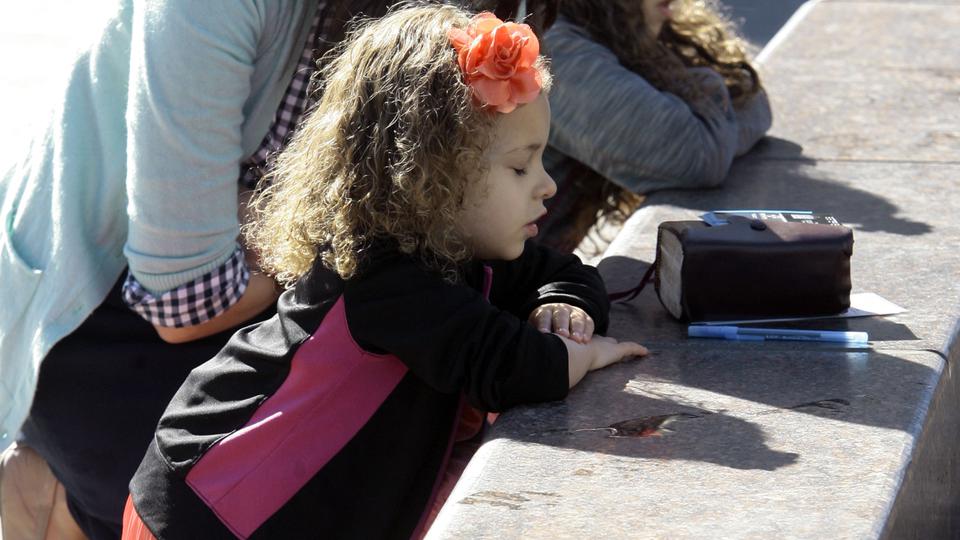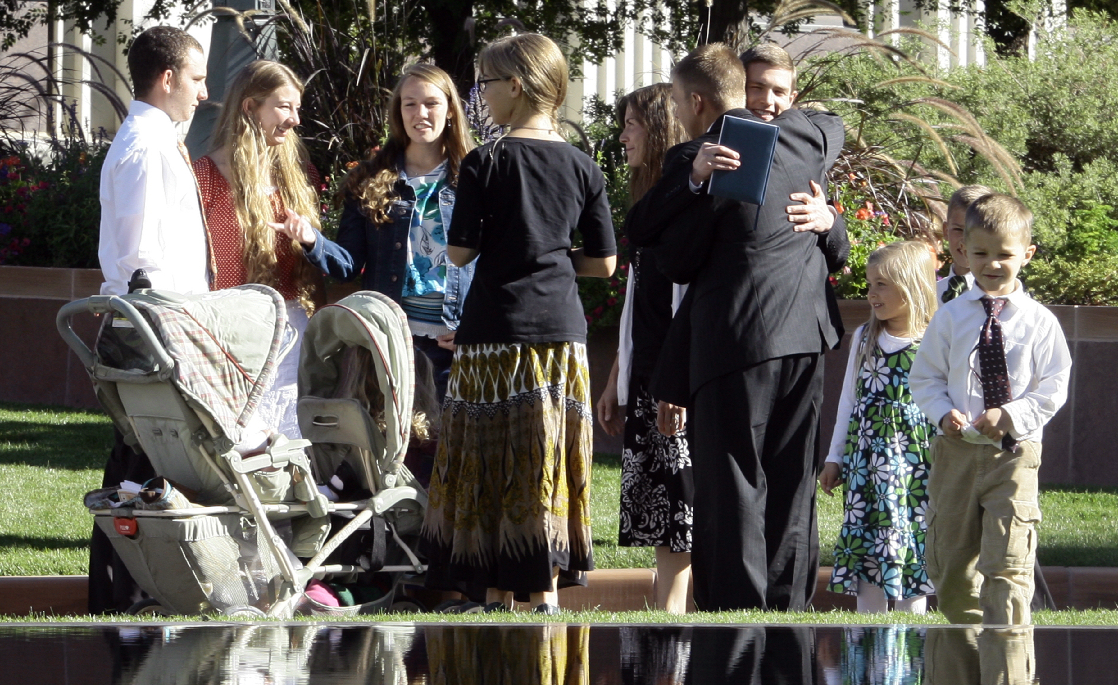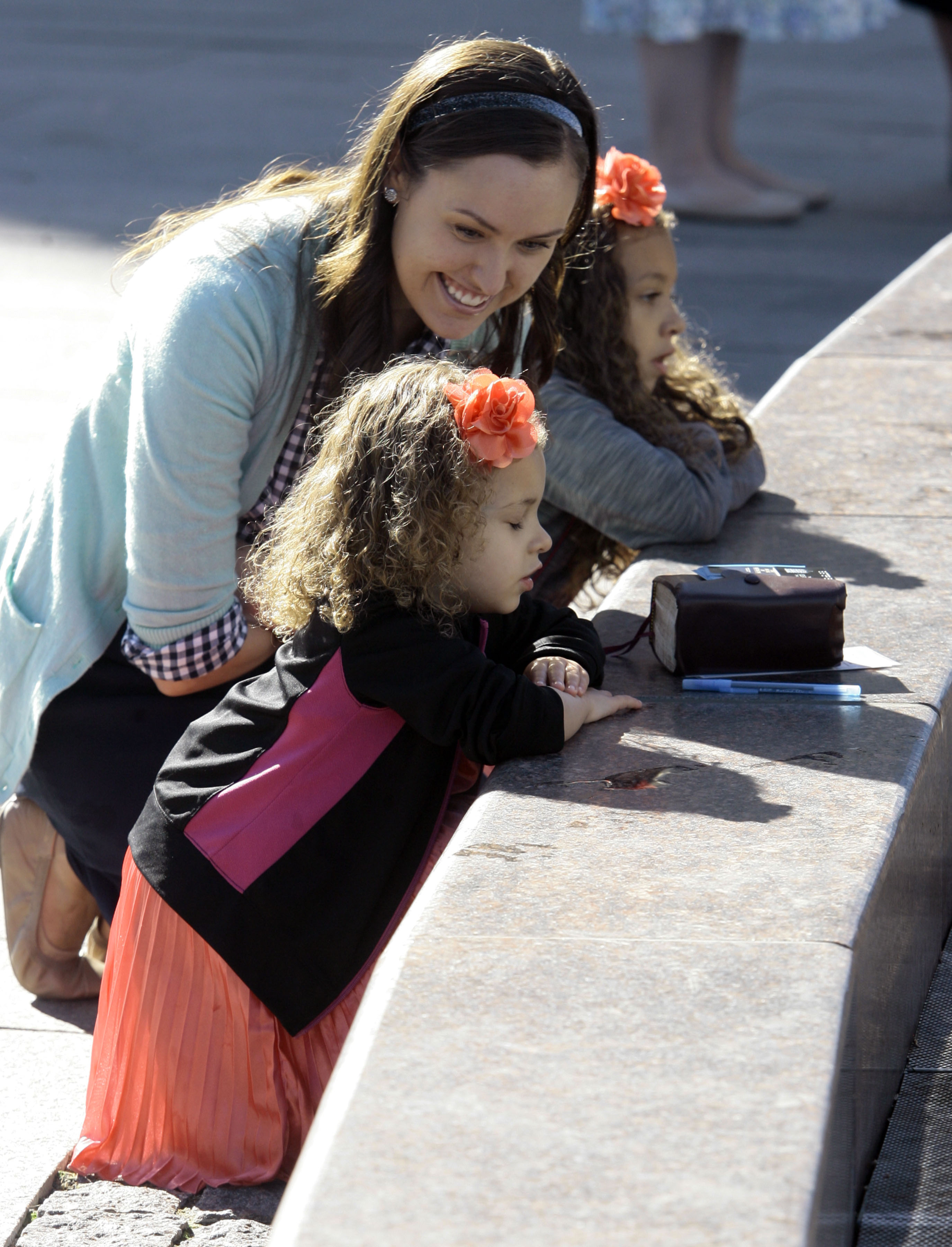 Two young girls reverently kneel with a sister missionary at the reflection pool in front of the Salt Lake Temple as their grandmother watches nearby.