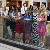 A large lighting fixture inside the Conference Center captures the attention of a group of girls.