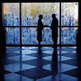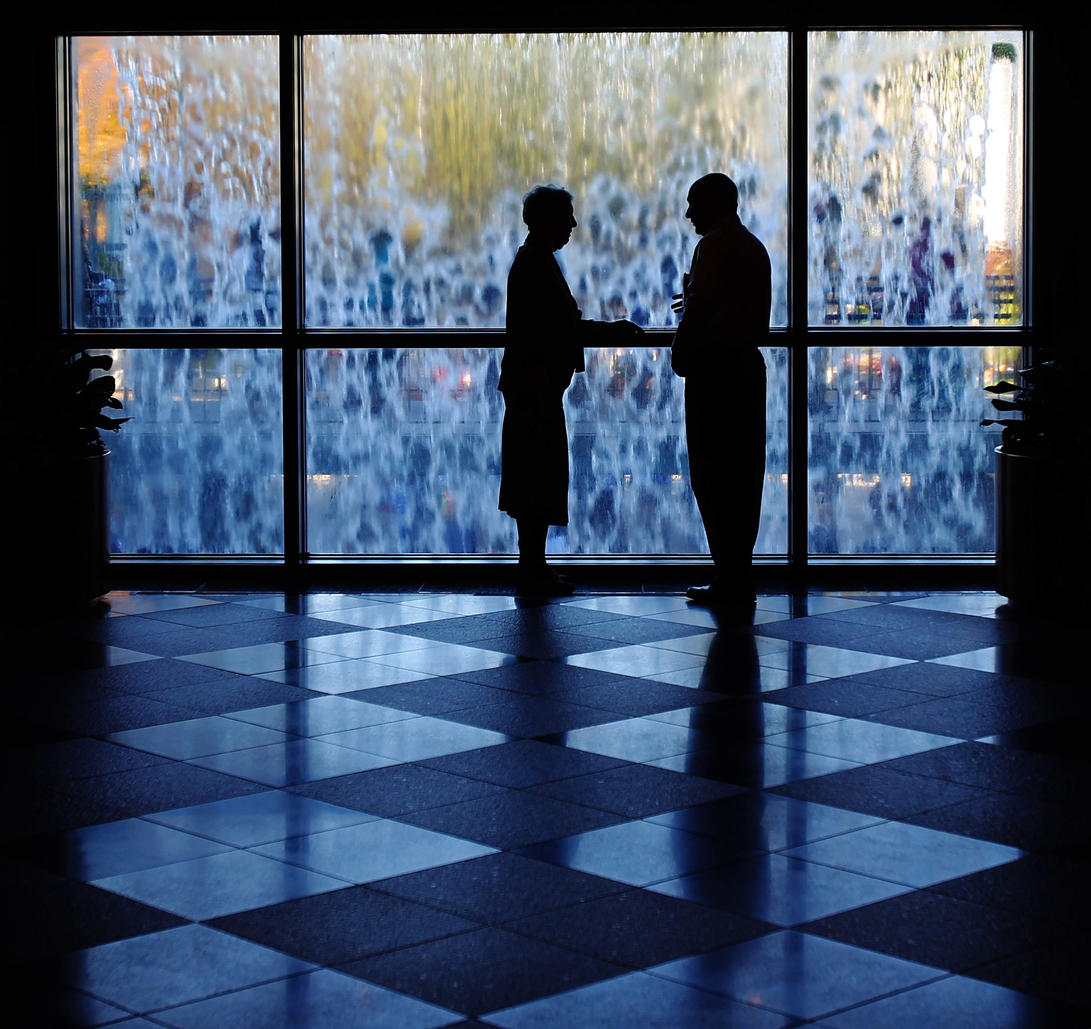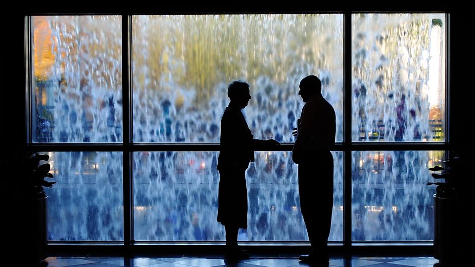 A silhouetted couple share a quiet moment against the backdrop of the Conference Center water feature during general conference weekend.