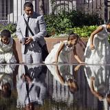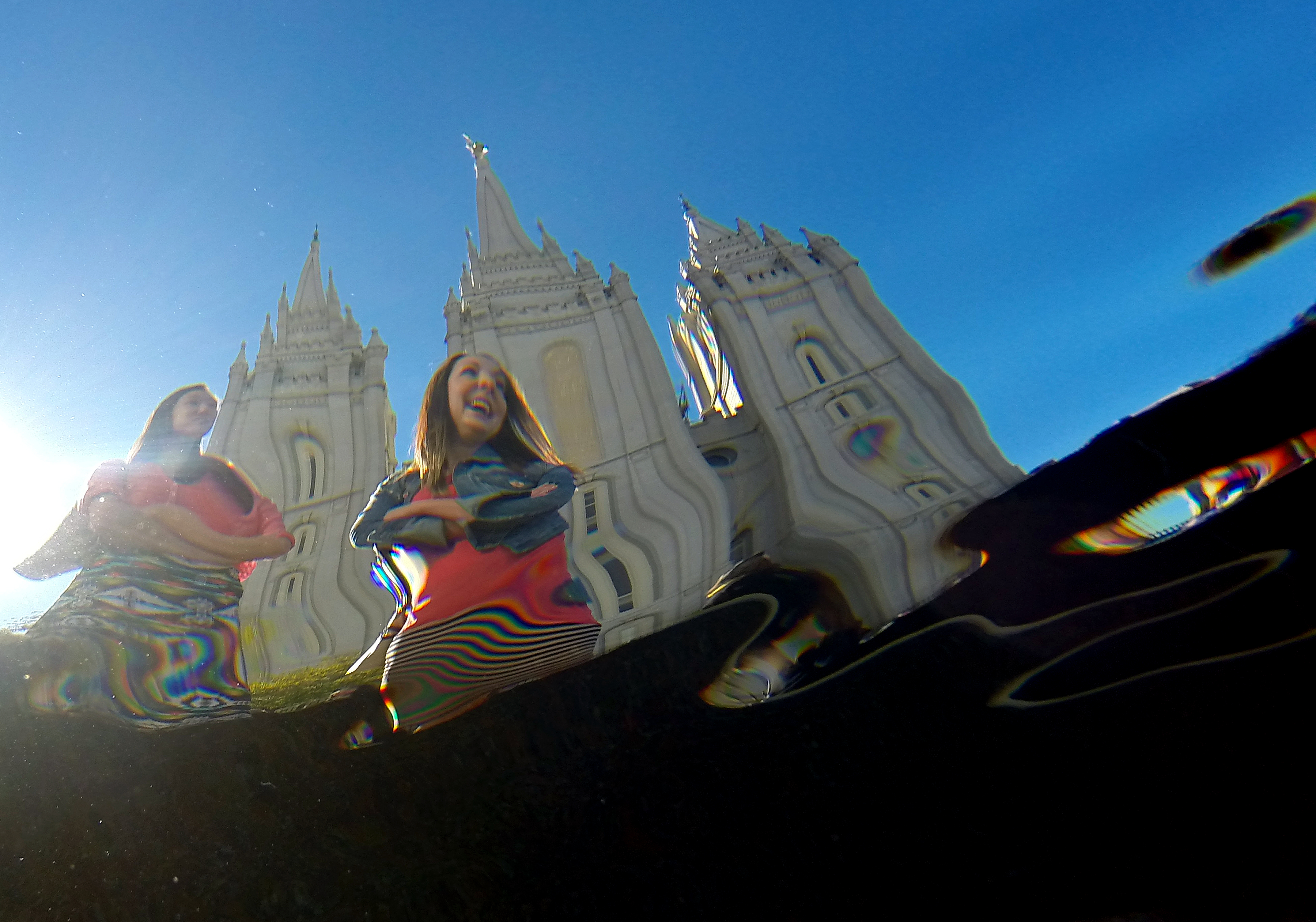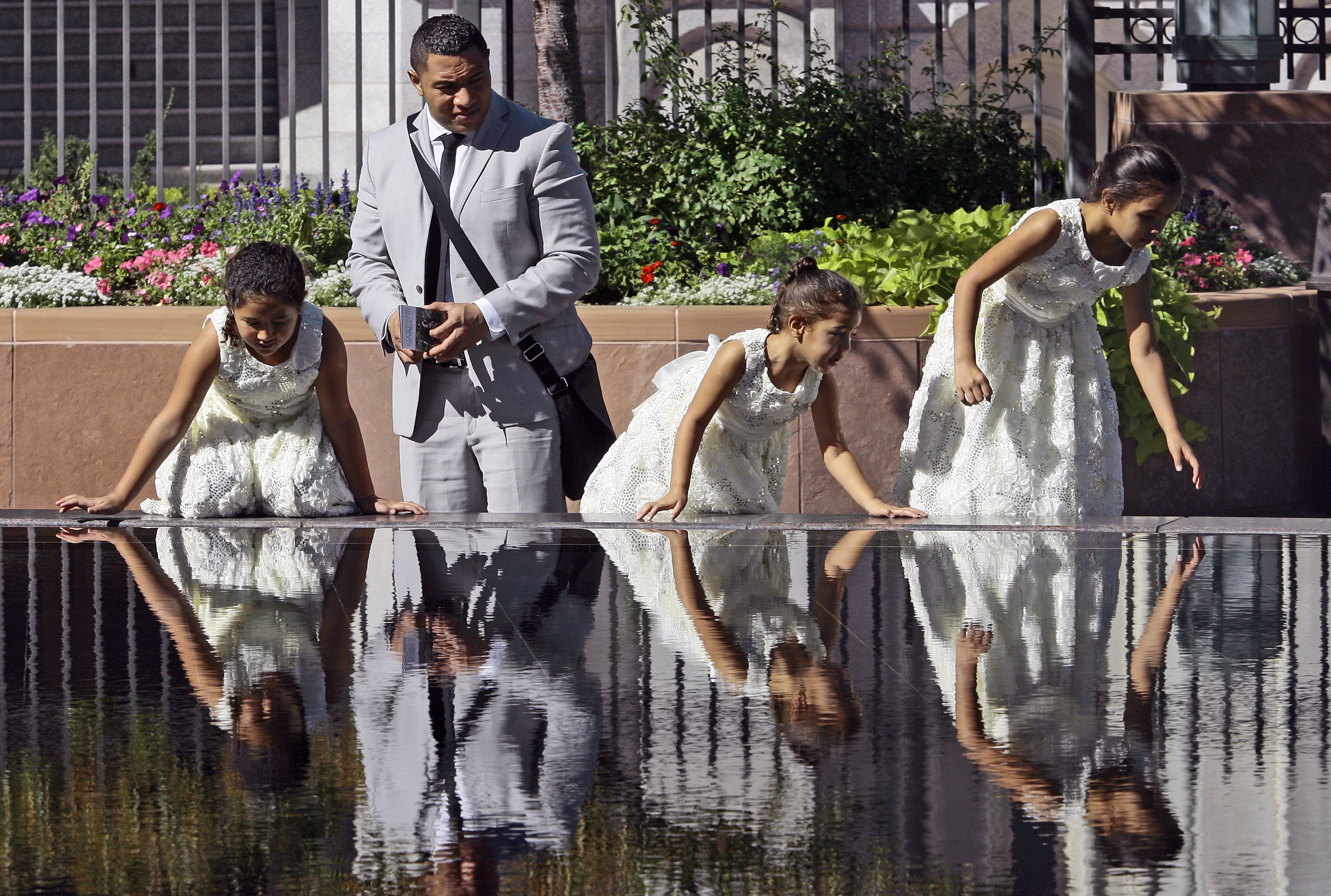 Three sisters dressed in white enjoy the reflection pool near the Salt Lake Temple on Sunday morning during general conference.