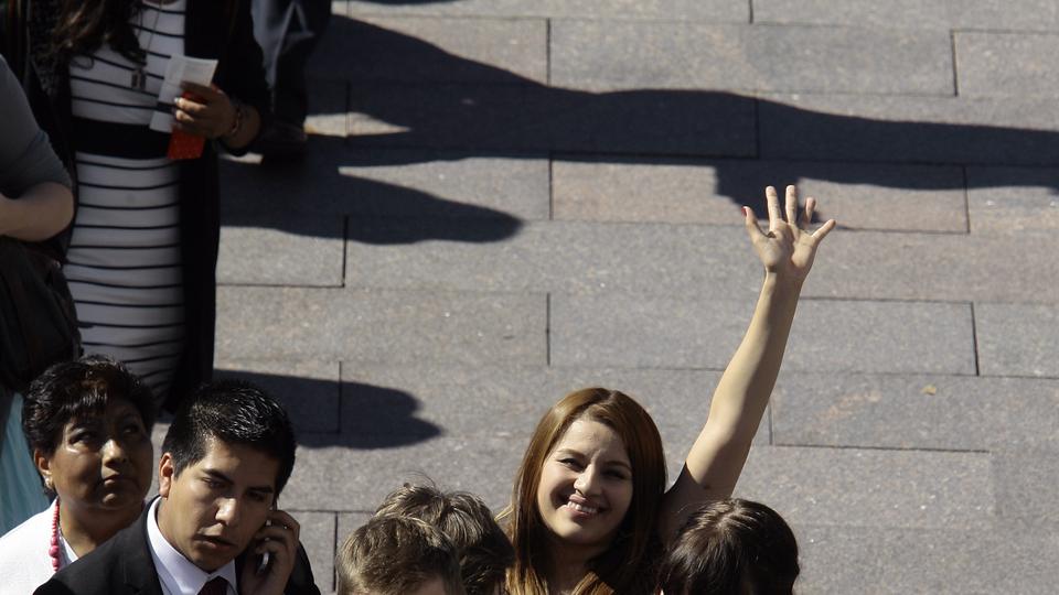 A woman cheerfully waves as she stands in line for standby seating at a general conference session at the Conference Center.