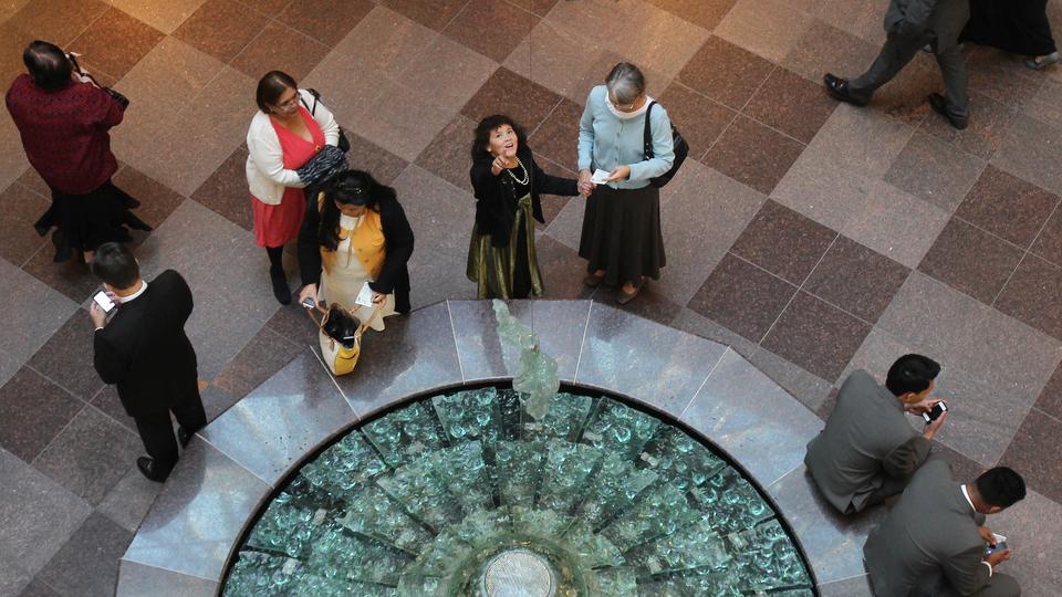 A bird’s-eye view of a water feature inside the Conference Center. A girl points to the skylight directly above.
