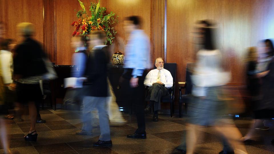 A man observing the rush of conference goers inside the Conference Center October 2014 represents the energizing and serene qualities that can be experienced at general conference.