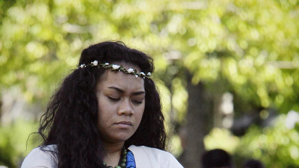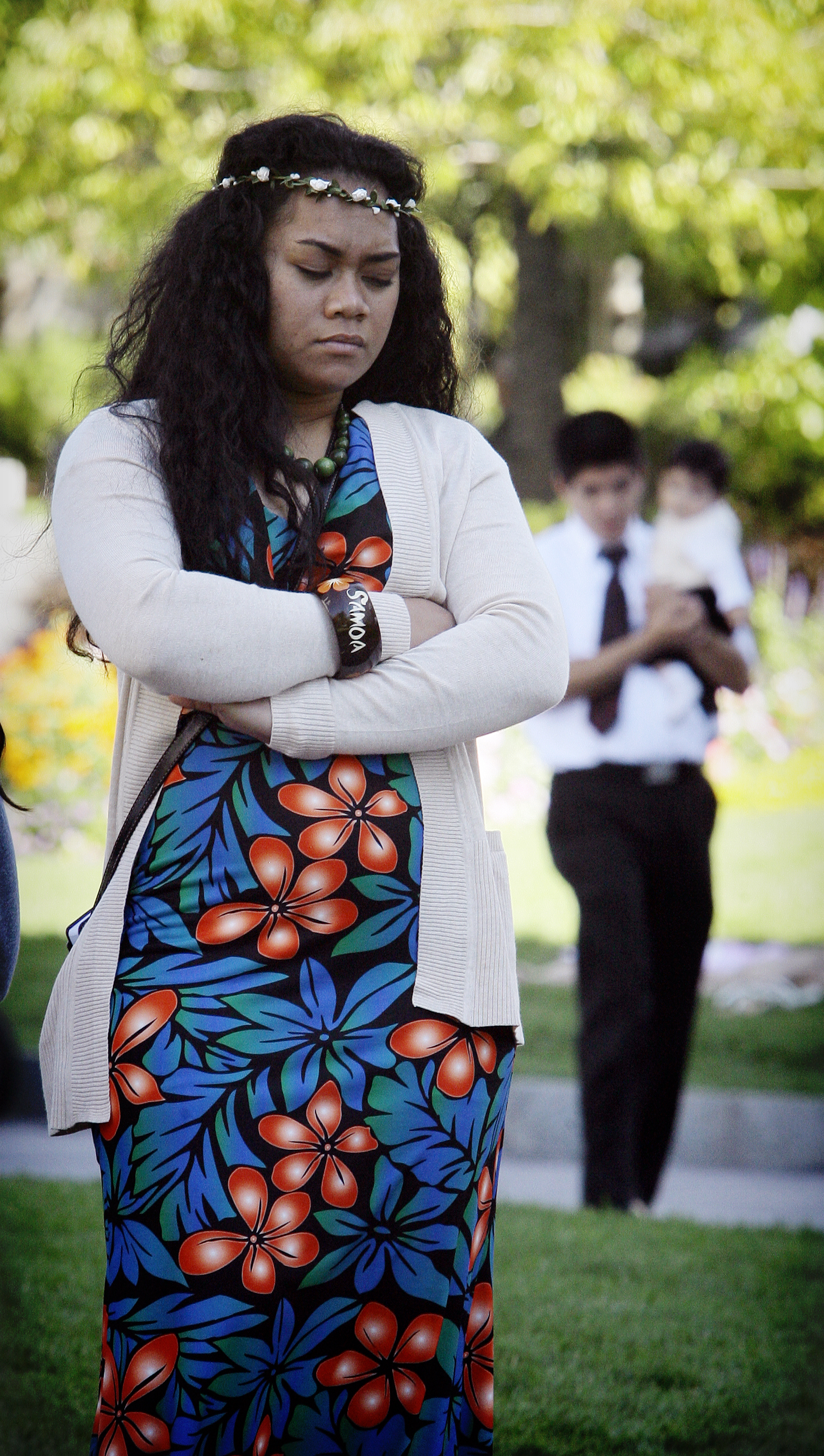 This woman who is wearing a colorful dress representing the Pacific Islands pauses for a prayer on Sunday morning. General conferences began in 1830, when the Church was organized by Joseph Smith in the United States, but now members live throughout the world.