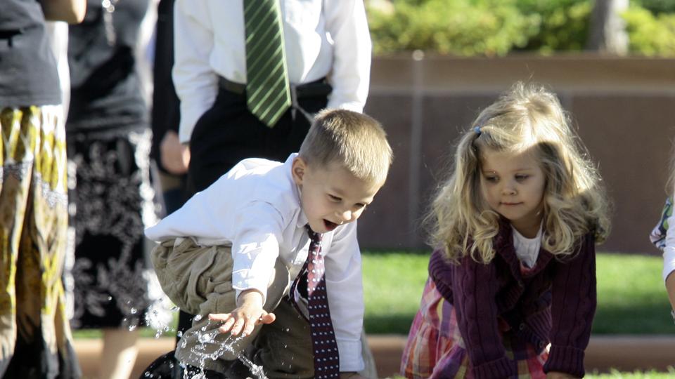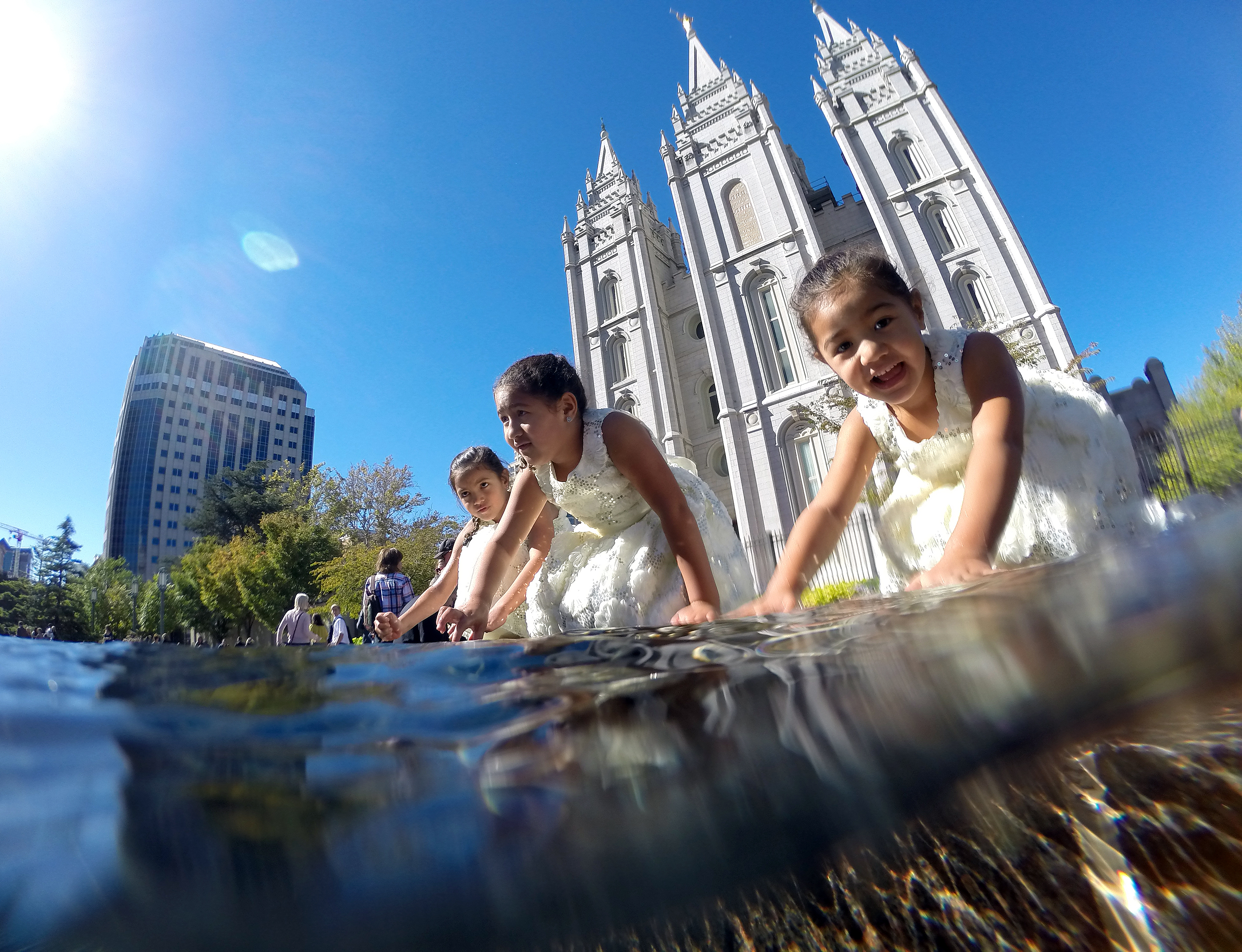 In the warmth of the Saturday afternoon sun, children test the waters of the reflection pool located east of the Salt Lake Temple.
