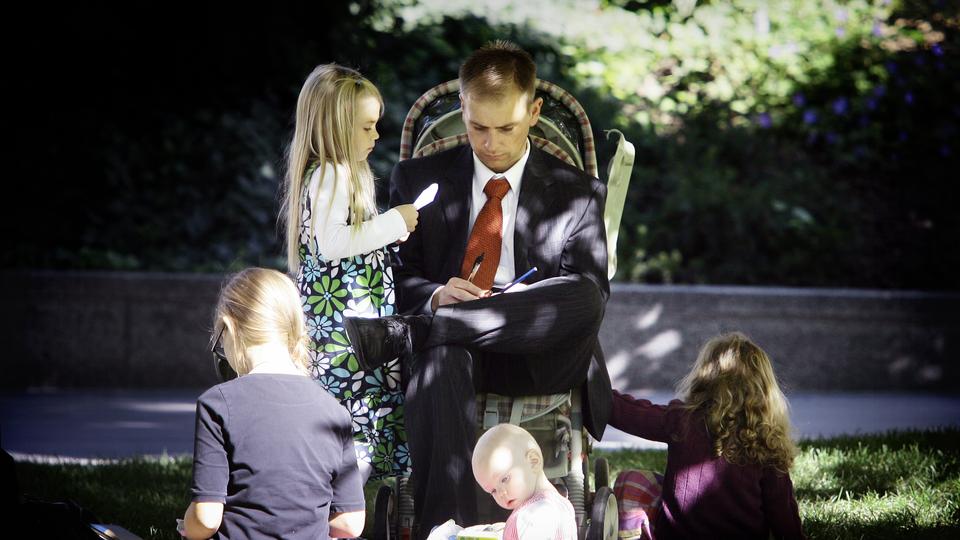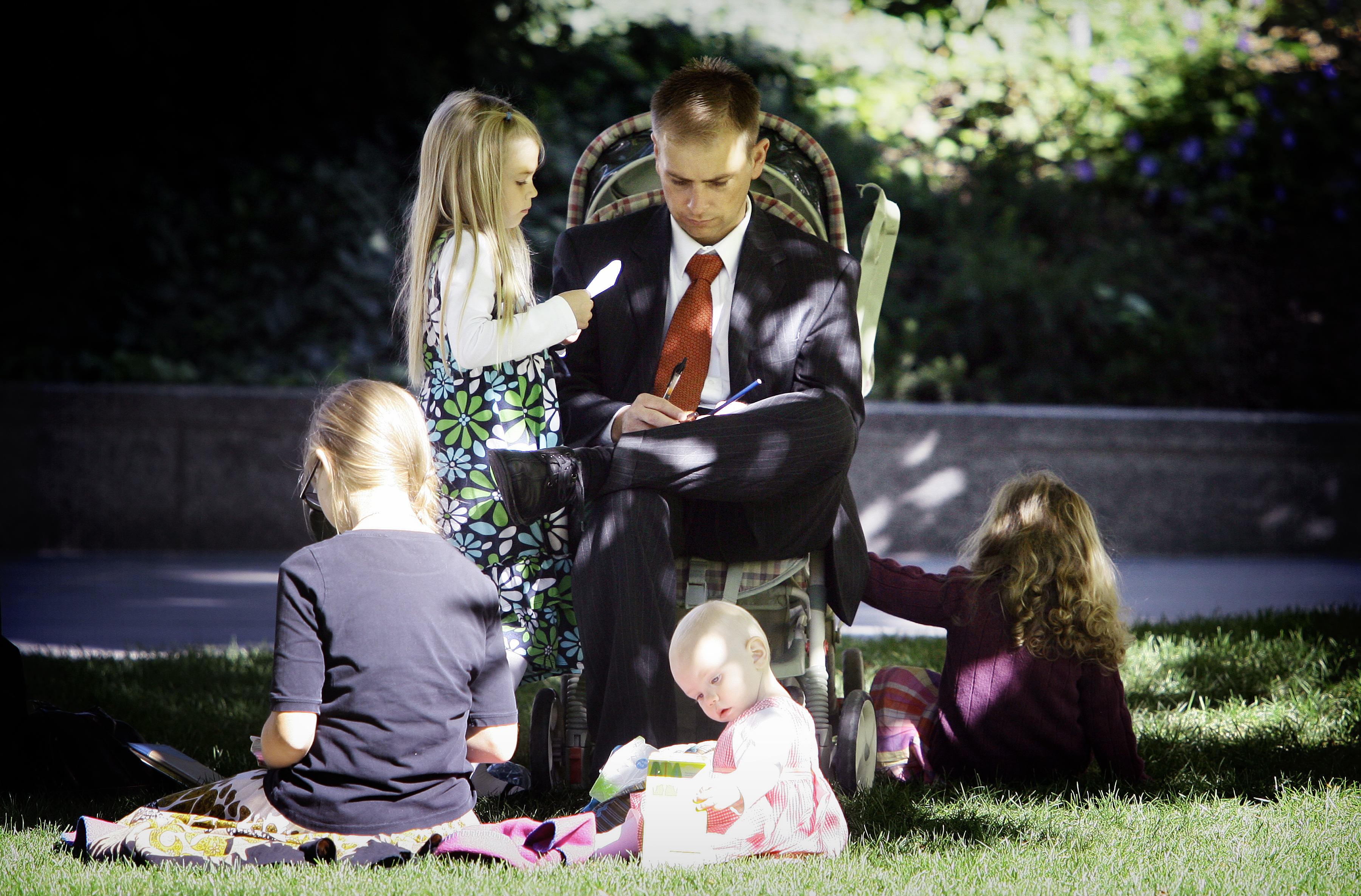 A baby stroller turns into an impromptu chair for a man listening to a general conference session. Families often take advantage of the plush lawns and large shade trees while listening to general conference talks via speakers on Temple Square.