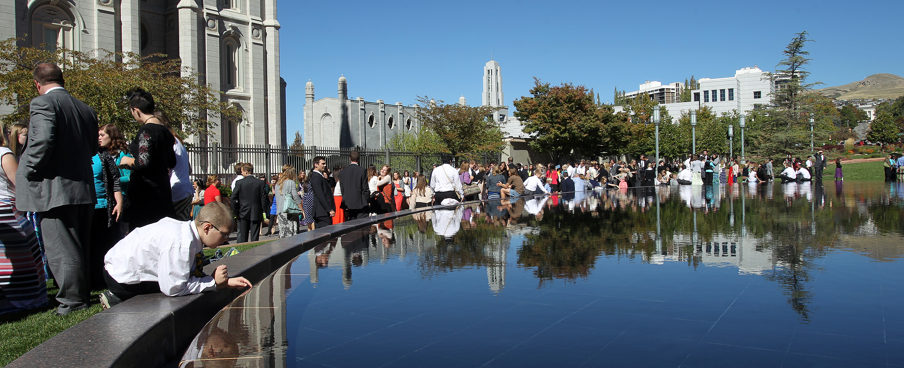 Conference goers gather around the reflection pool on the plaza at Temple Square, a popular attraction during general conference. It is an area that inspires meditation, reflection and prayer.