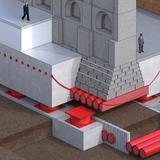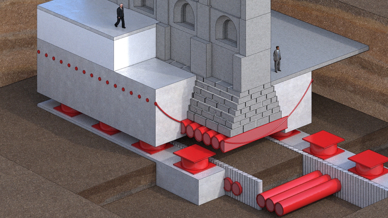 The installation of the base isolation system will require deep excavations around the historic footings and foundation of the temple and will also require the strengthening of the stone spires and walls.