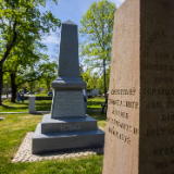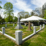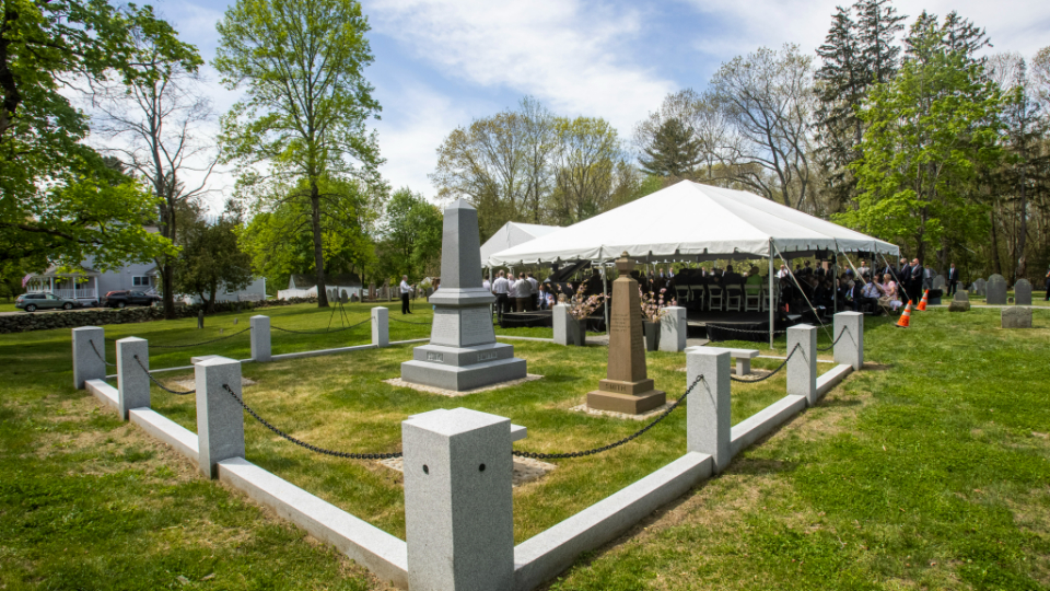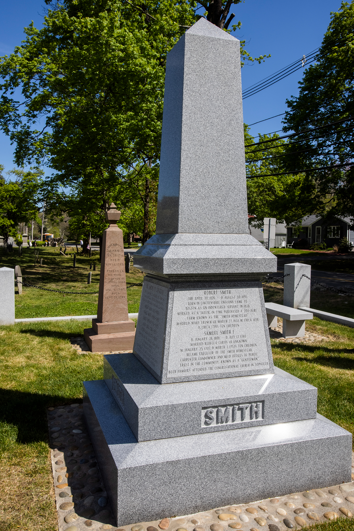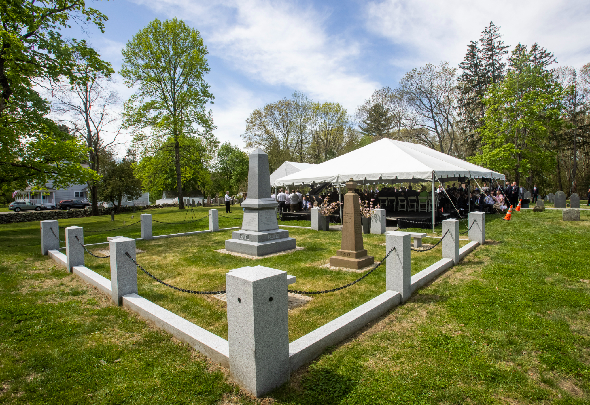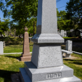 In 1873, apostle George A. Smith erected a monument in the cemetery to mark the burials of Samuel I and Samuel II (both are buried in the cemetery at unknown locations). The new monument was funded by private Latter-day Saint donors and installed in September 2020, but the dedication was delayed due to COVID-19. The monument is fashioned from the same Barre granite as the Joseph Smith Birthplace monument in Vermont. It is wider (five feet) and taller (nine feet, six inches) and heavier (it weighs nearly 14,000 pounds) than its 1873 counterpart (which stands just feet away) and tells a more complete story of the Smith family. Both monuments are enclosed with a fence and gate.