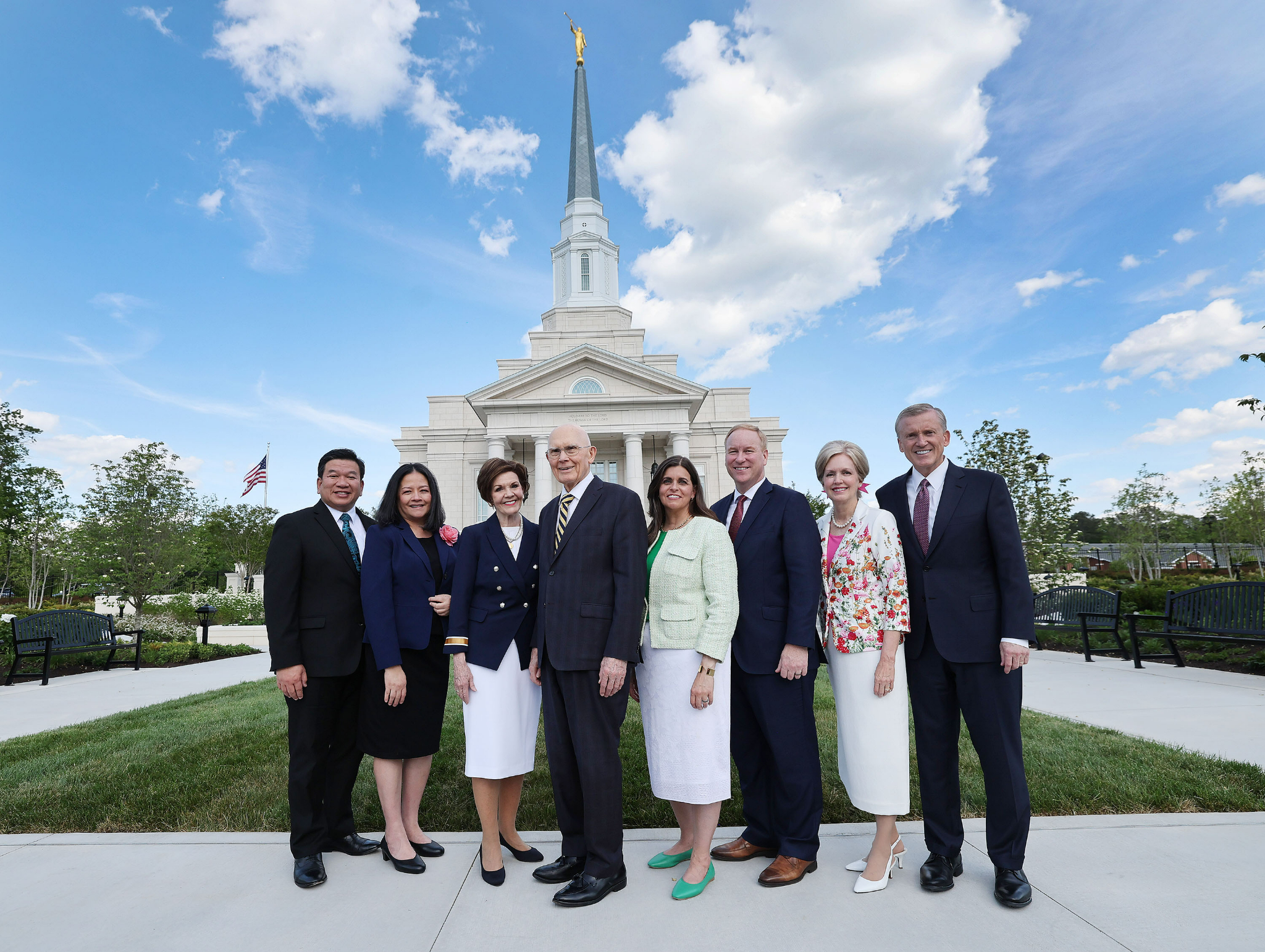 From left: Elder Michael John U Teh, General Authority Seventy; Sister Grace Teh; Sister Kristen M. Oaks; President Dallin H. Oaks of the First Presidency; Sister Angela Bassett; Elder W. Mark Bassett of the North America Northeast Area Presidency and a General Authority Seventy; Sister Nancy Duncan; and Elder Kevin R. Duncan, executive director of the Church’s Temple Department and a General Authority Seventy, at the dedication of the Richmond Virginia Temple on Sunday, May 7. 2023 by Intellectual Reserve, Inc. All rights reserved.