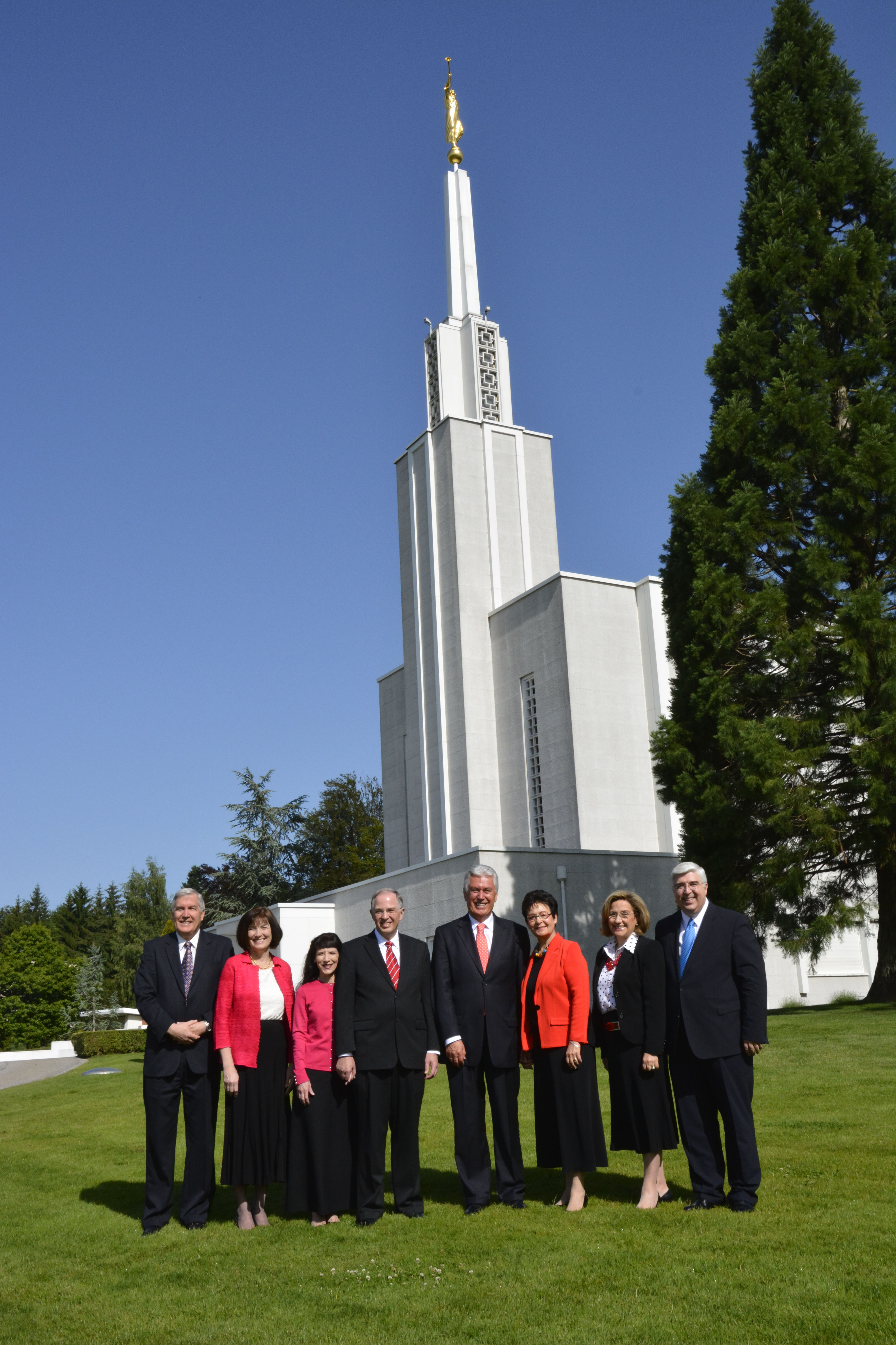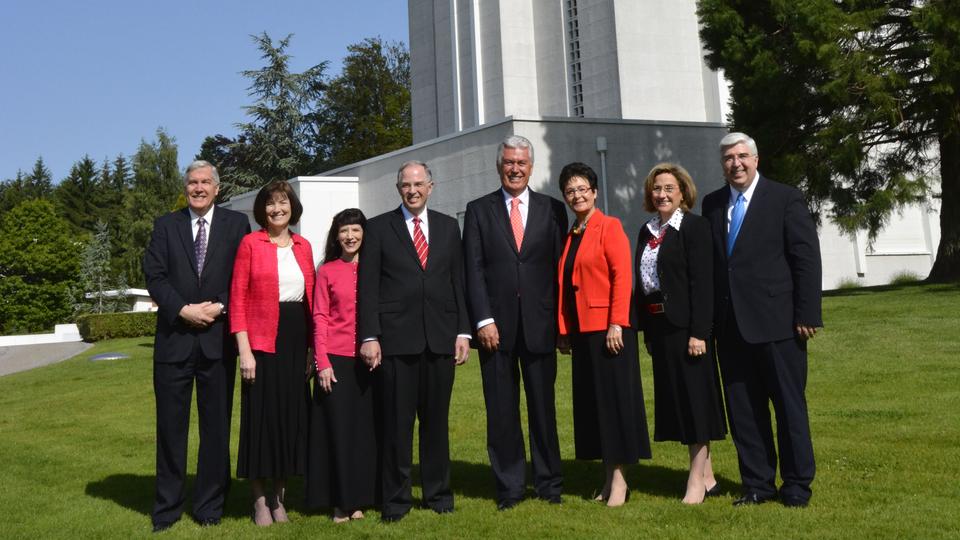 Posing for a picture on the lawn of the Bern Switzerland Temple (from left to right) are Brother Melvyn and Sister Linda S. Reeves, second counselor, Relief Society general presidency; Sister Kathy and Elder Neil L. Andersen of the Quorum of the Twelve Apostles; President Dieter F. and Sister Harriett Uchtdorf; and Elder José and Sister Maria Teixeira.