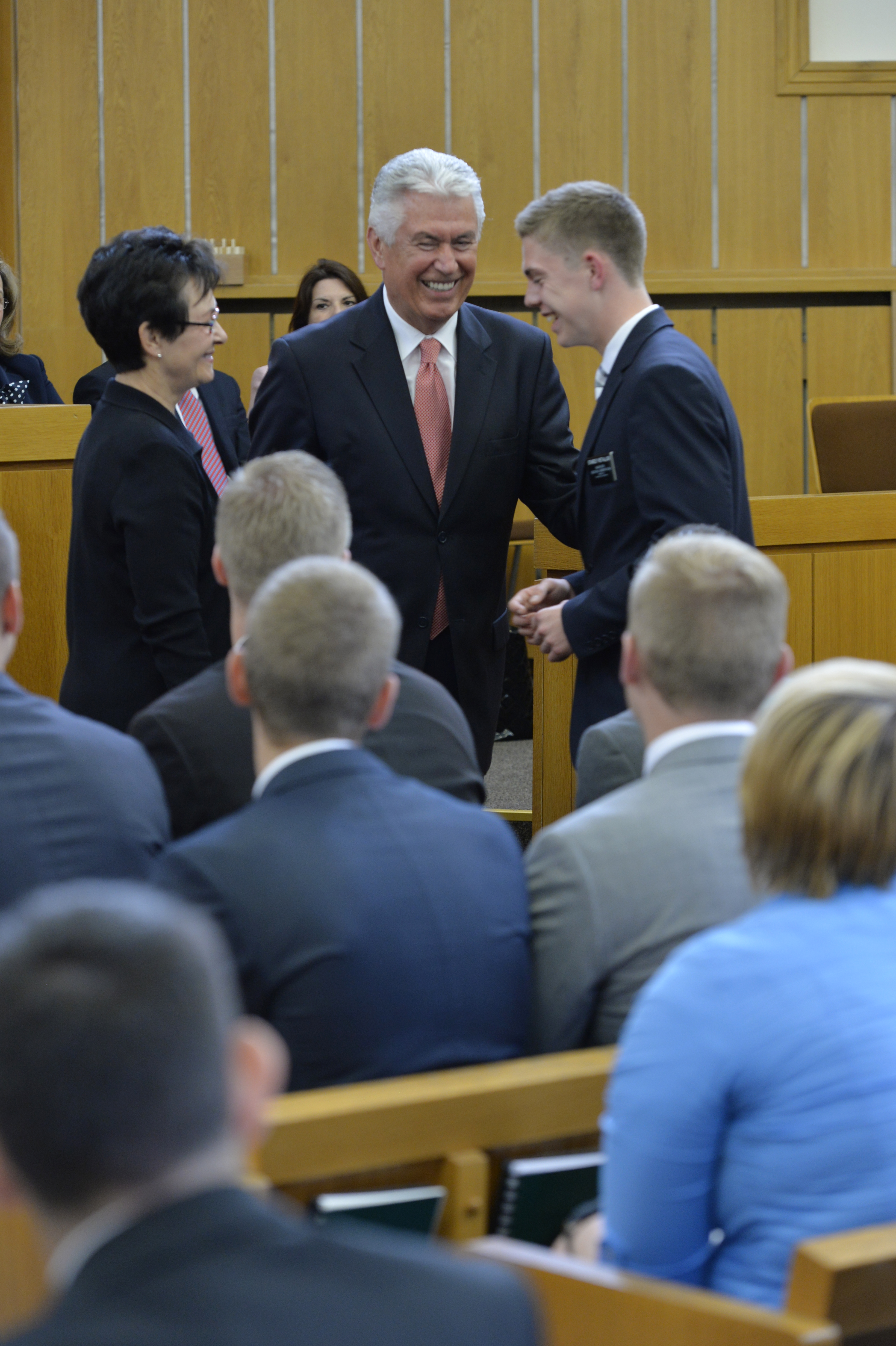 All missionaries serving in Poland gathered to meet with President Uchtdorf and his wife. While in Poland the Uchtdorfs also visited Auschwitz and Birkenau.