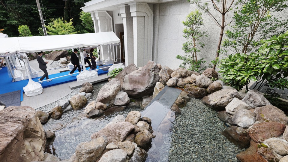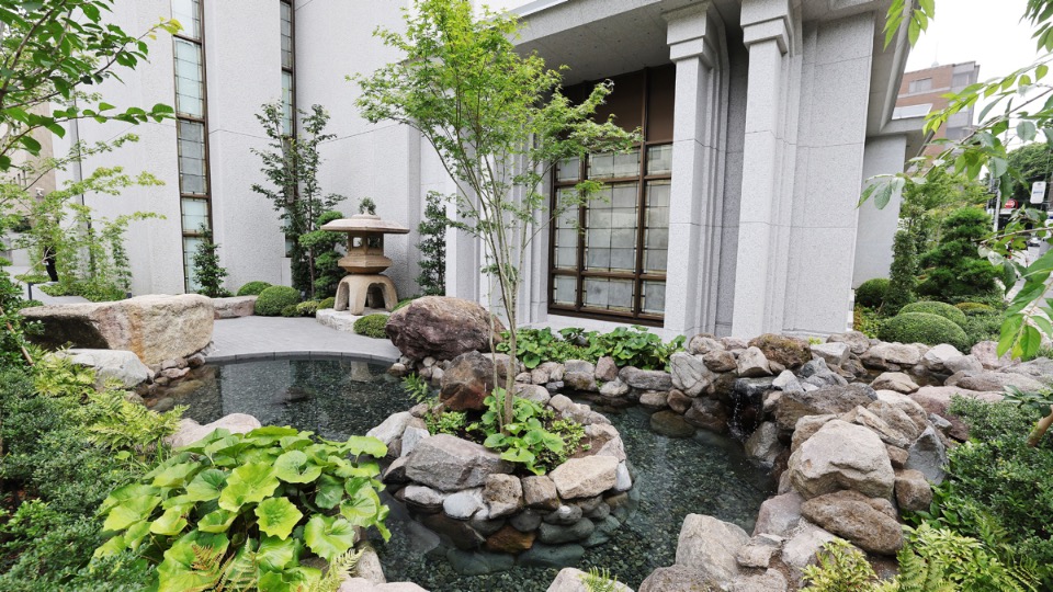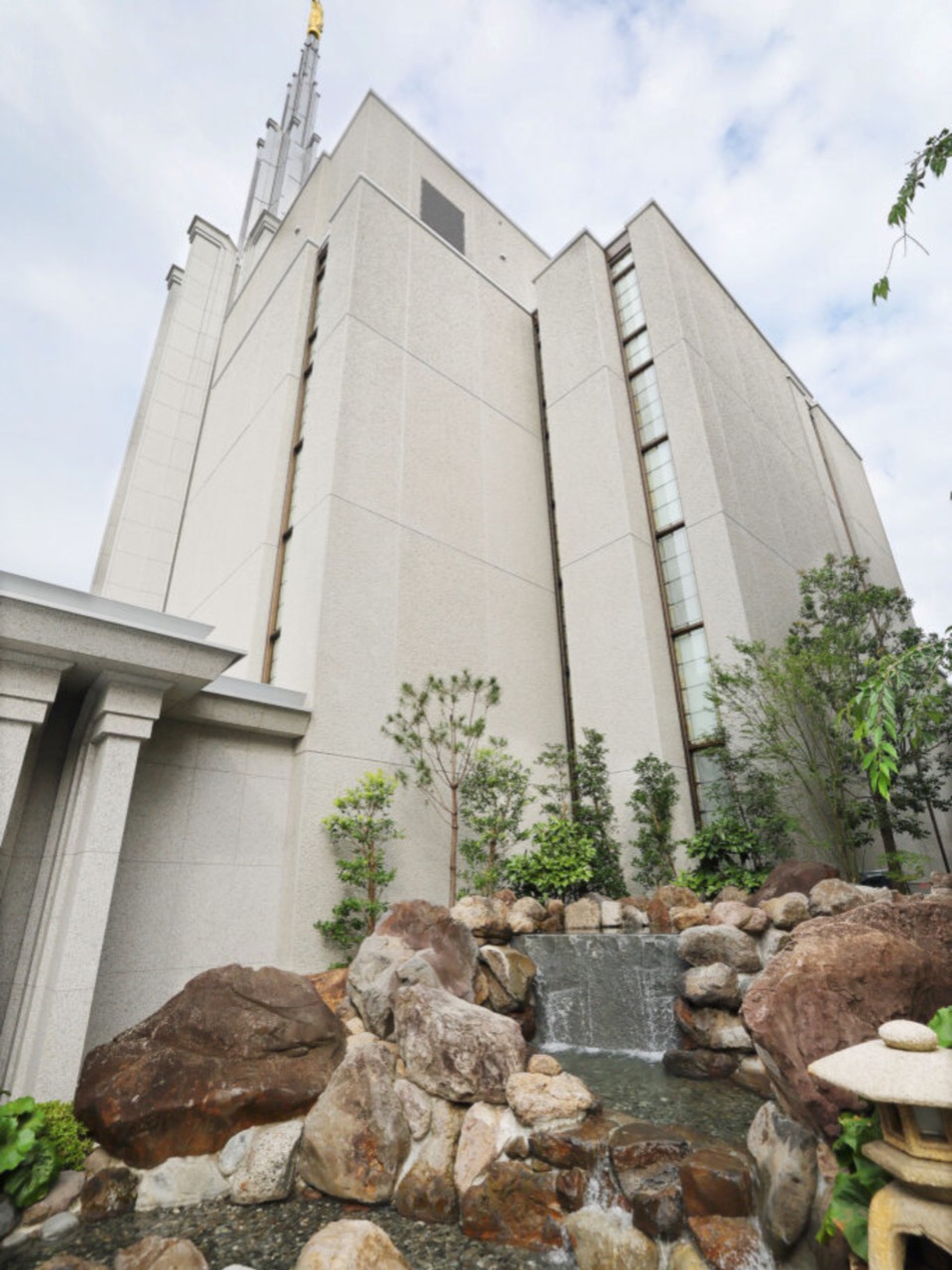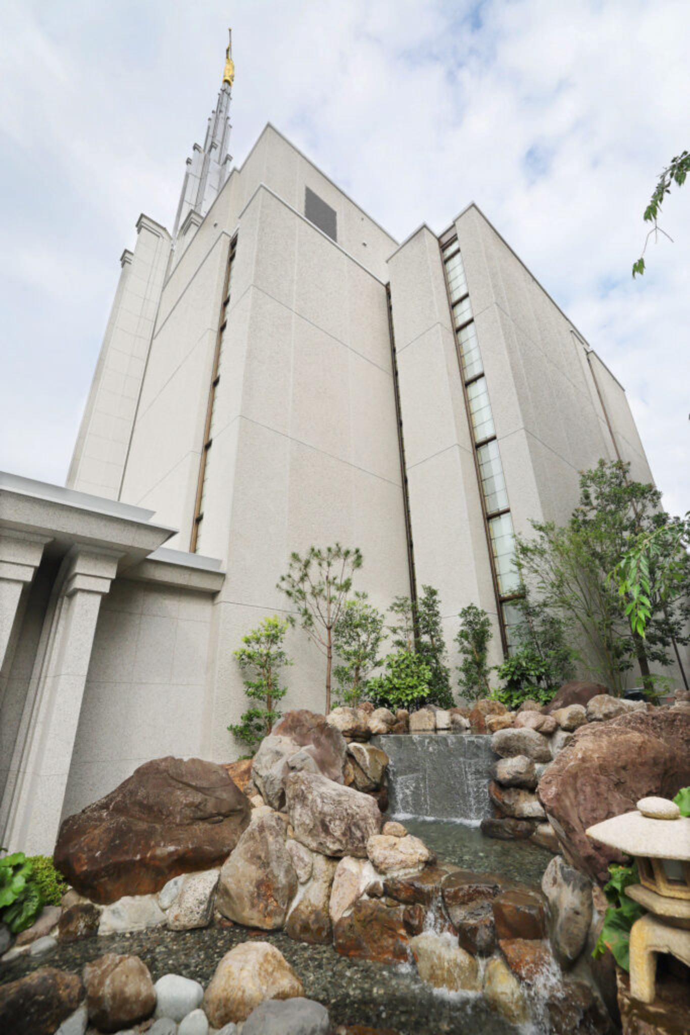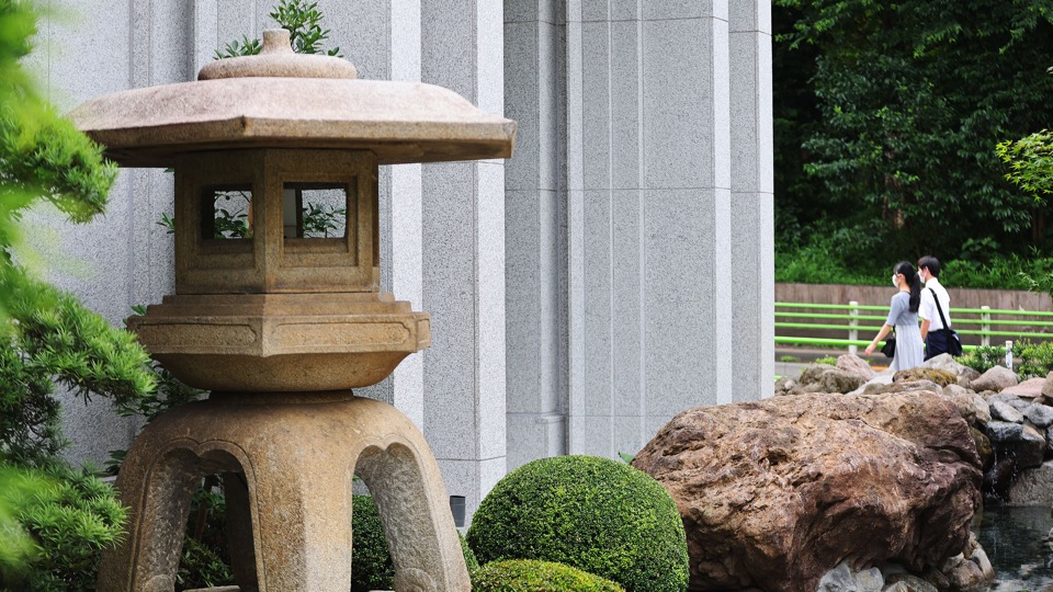The refurbished 53,779-square-foot Tokyo Japan Temple is distinctly Japanese. Several exterior features and much of the foliage encircling the temple are indigenous to the region — including landscaping improvements that include Japanese maples and bamboo. Two Japanese-style shallow ponds and a waterfall round out the exterior highlights.