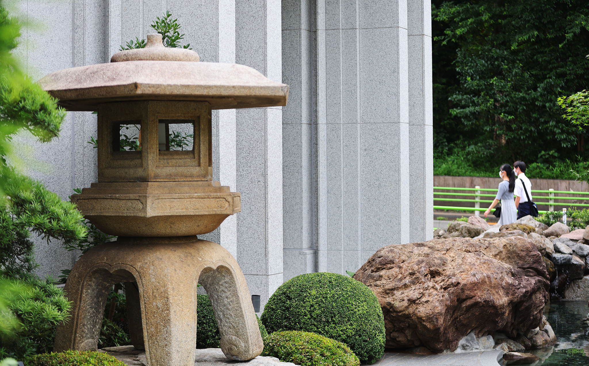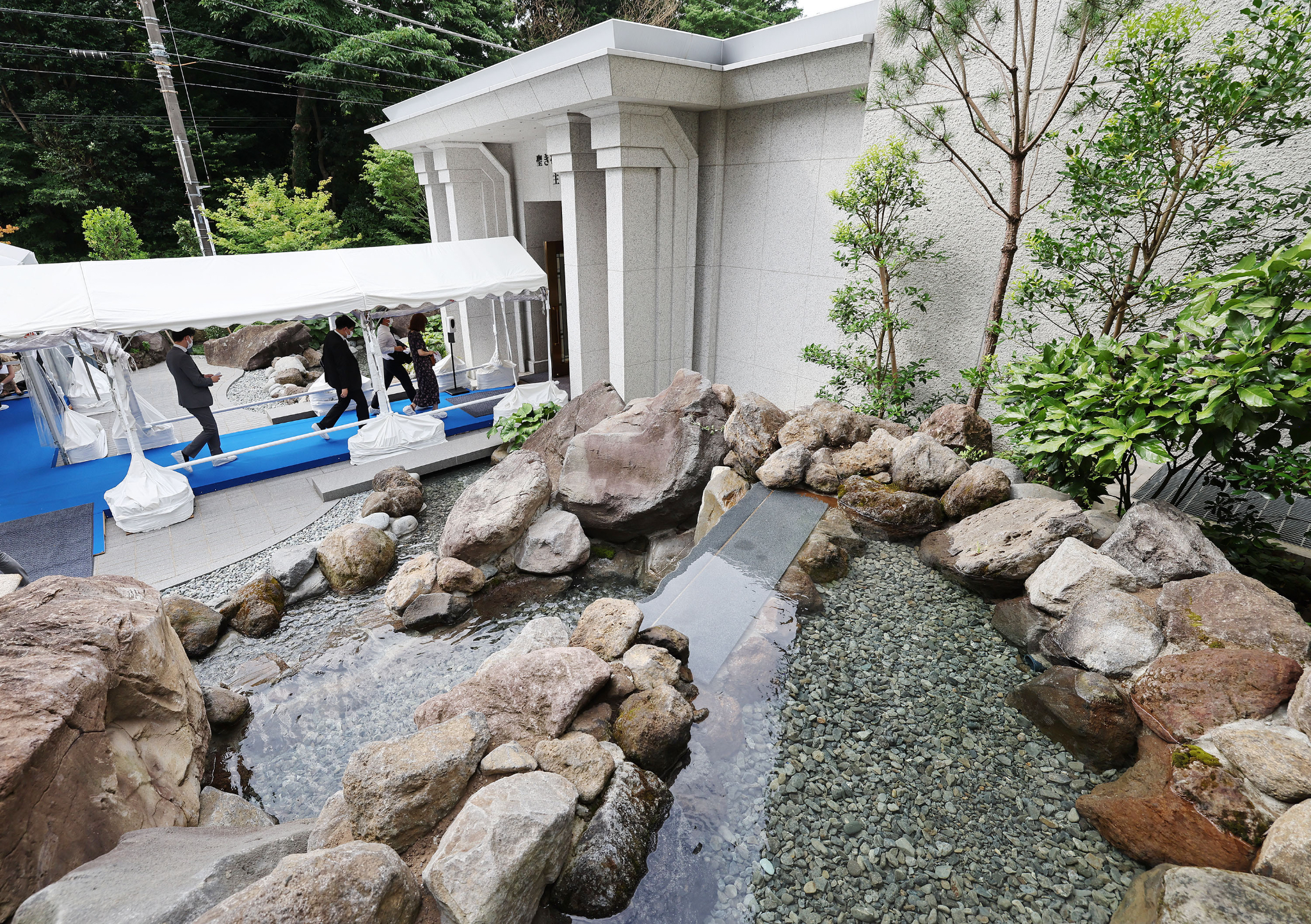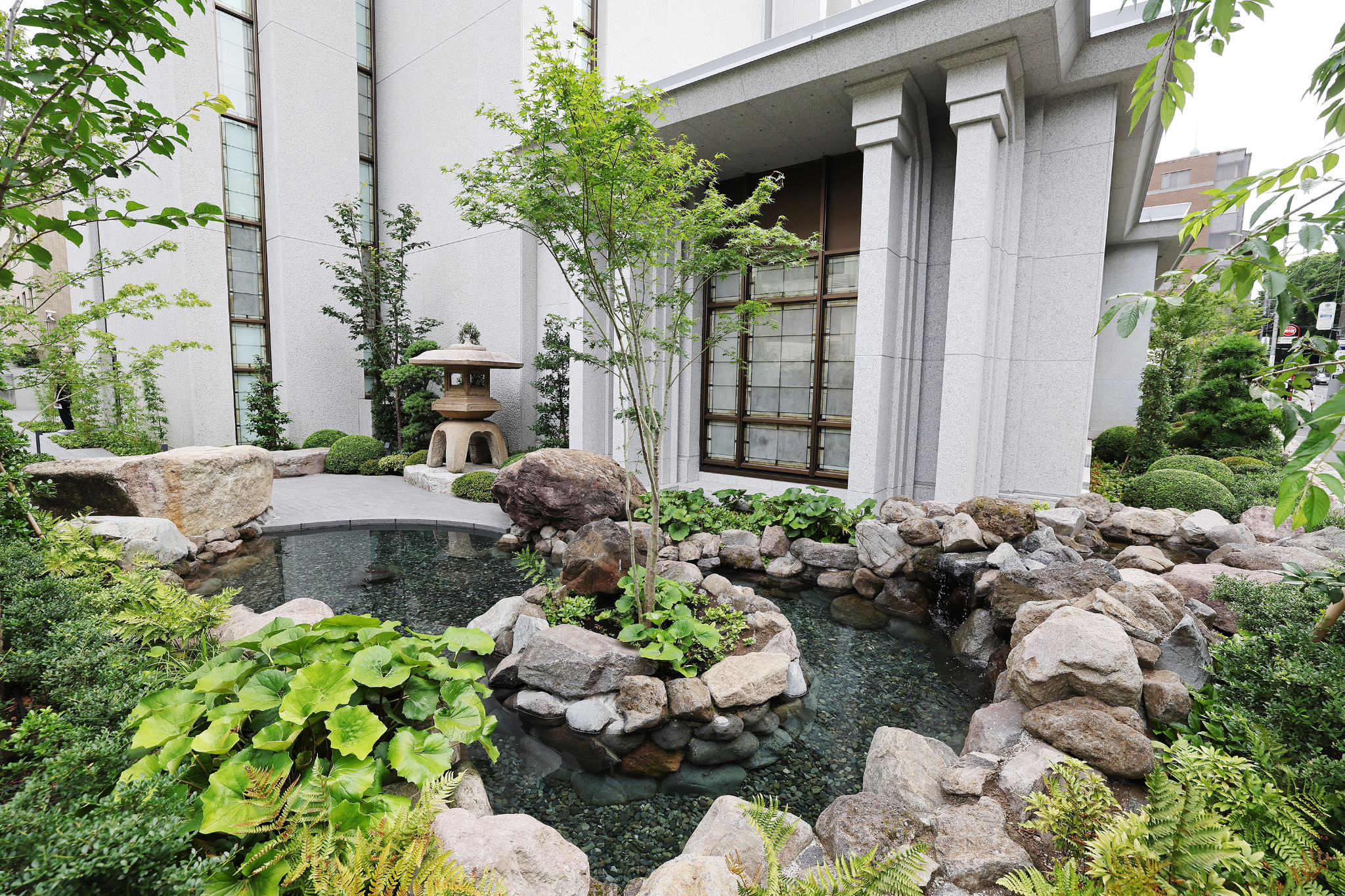 The refurbished 53,779-square-foot Tokyo Japan Temple is distinctly Japanese. Several exterior features and much of the foliage encircling the temple are indigenous to the region — including landscaping improvements that include Japanese maples and bamboo. Two Japanese-style shallow ponds and a waterfall round out the exterior highlights.