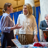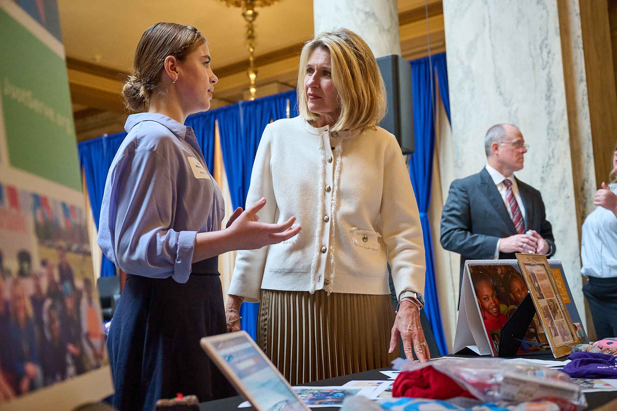 President Camille N. Johnson speaks with Elena Magnusson, JustServe Club leader at Brownsburg Middle School, at the Statehouse in Indianapolis on September 8, 2023. Magnusson started the first middle school JustServe Club in the state. 2023 by Intellectual Reserve, Inc. All rights reserved.Lt. Gov. Suzanne Crouch met with President Johnson and Elder Sikahema before the event.