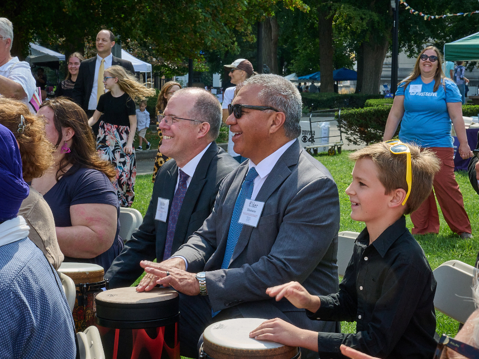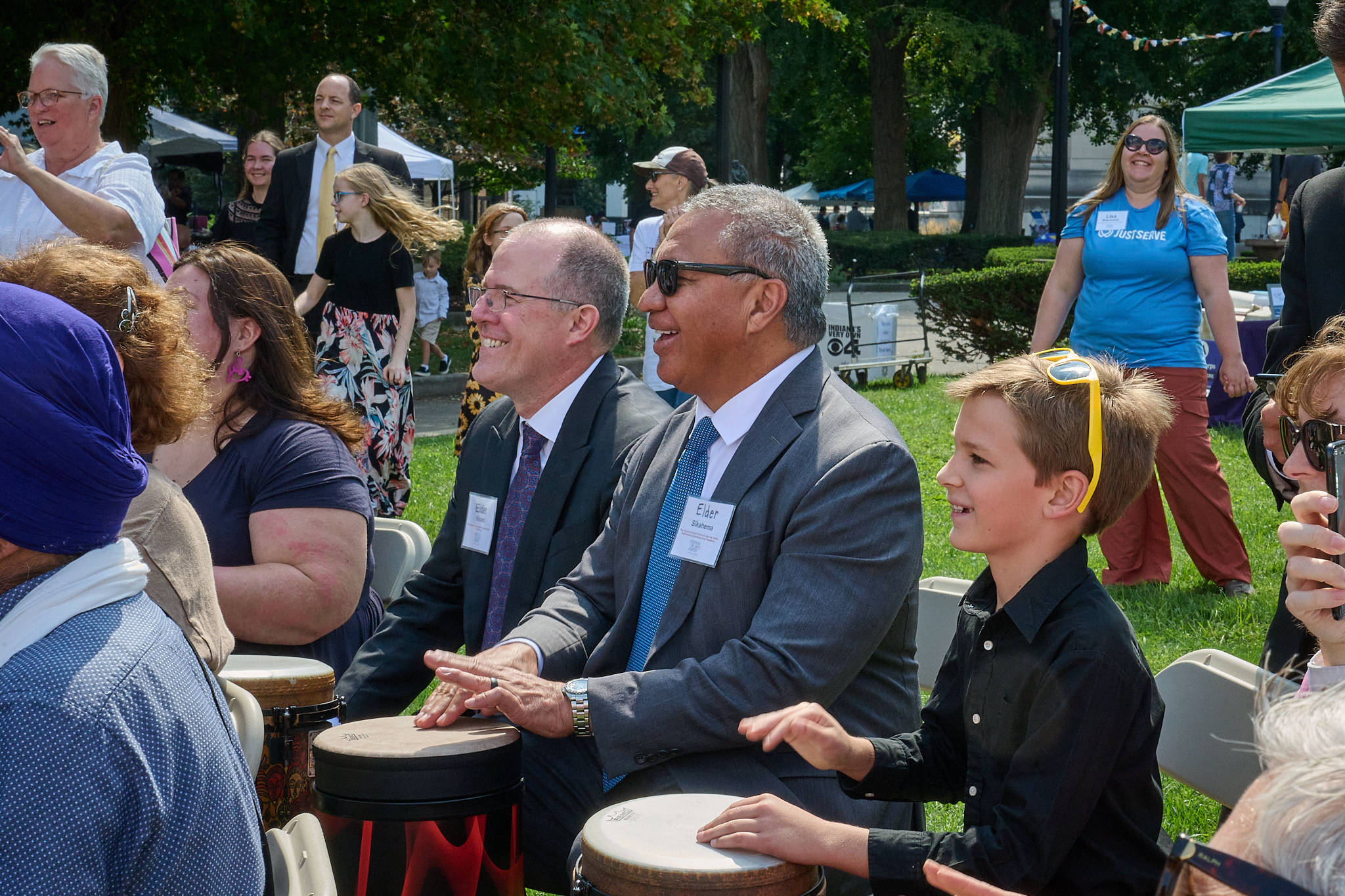 Elder Vaiangina Sikahema (center right), first counselor in the North America Northeast Area Presidency, and Elder David S. Kinard (center left), Area Seventy, participate in a drum circle at the 11th Annual Indy Festival of Faiths in downtown Indianapolis on Sunday, September 10, 2023. 2023 by Intellectual Reserve, Inc. All rights reserved.“What a fabulous unifying experience. All of us were beating to the same rhythm and that’s the point, that we really are answering to the same God,” said President Johnson.