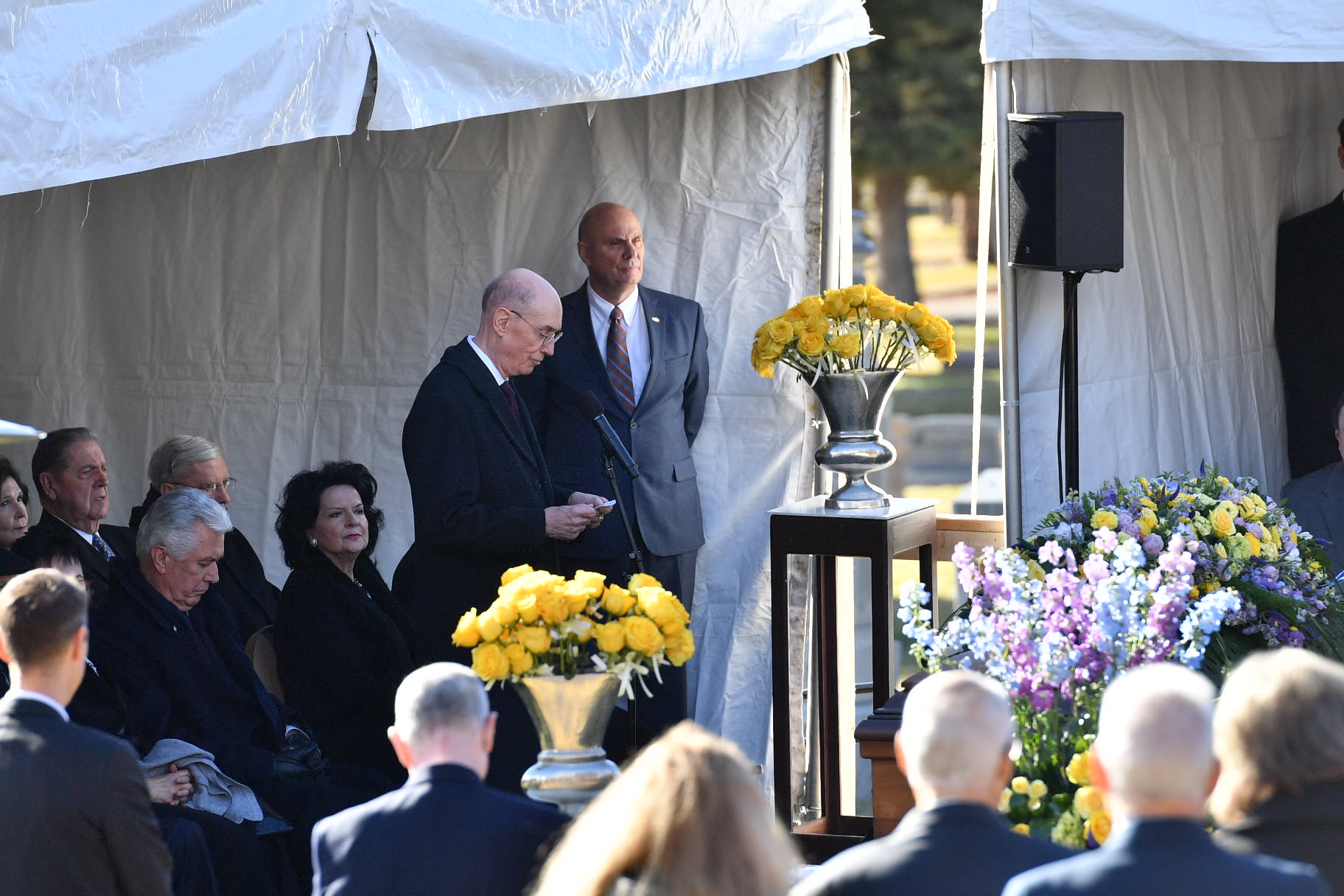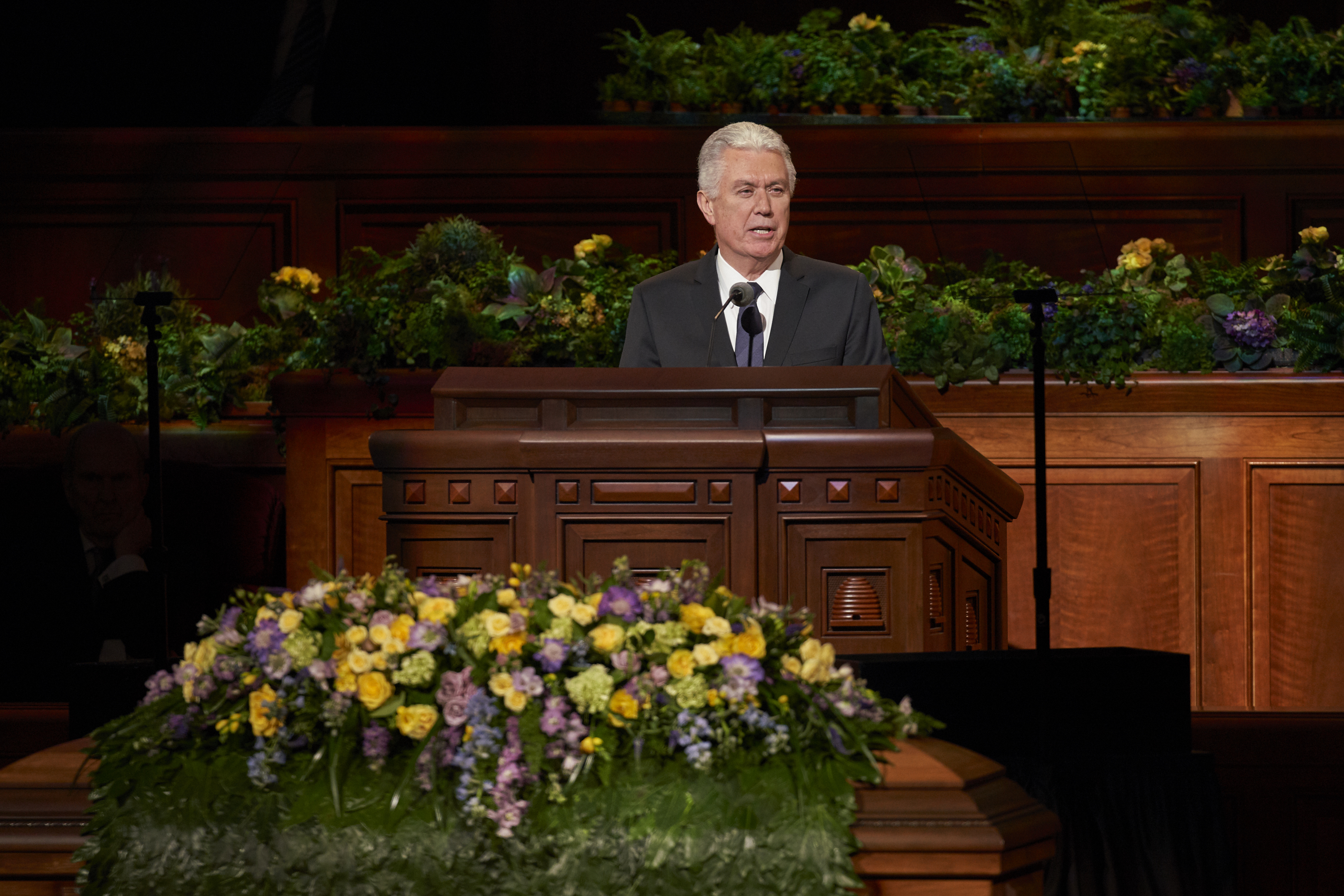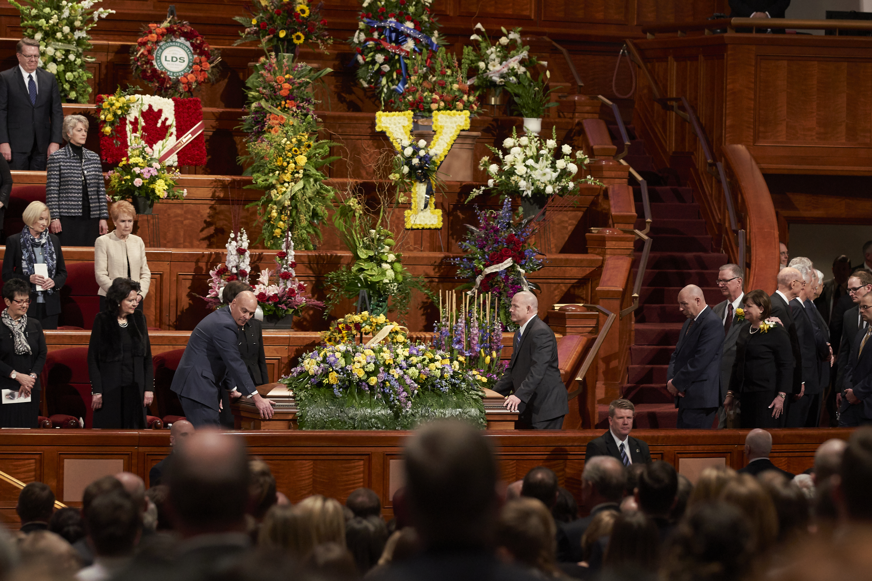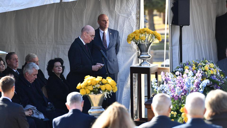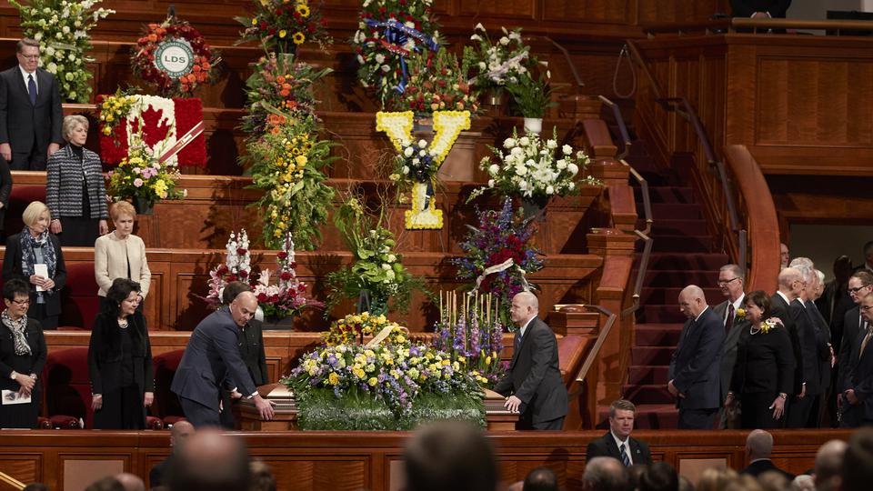 The funeral was conducted by President Eyring. Music was provided by the Mormon Tabernacle Choir. The choir opened the funeral by singing “Consider the Lilies.” Other musical selections included “O Divine Redeemer,” “Dear to the Heart of the Shepherd” and “If the Way Be Full of Trial, Weary Not.”