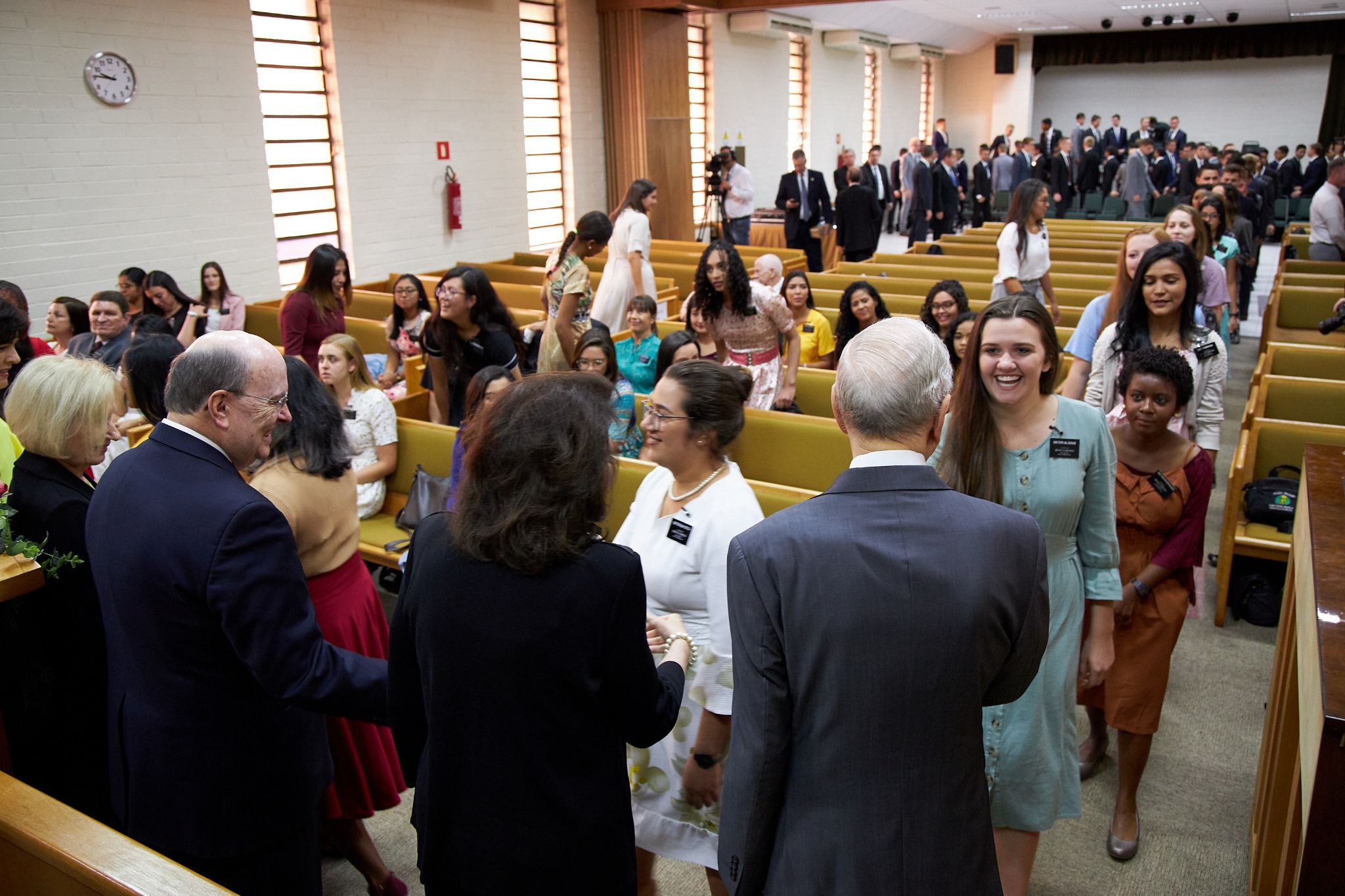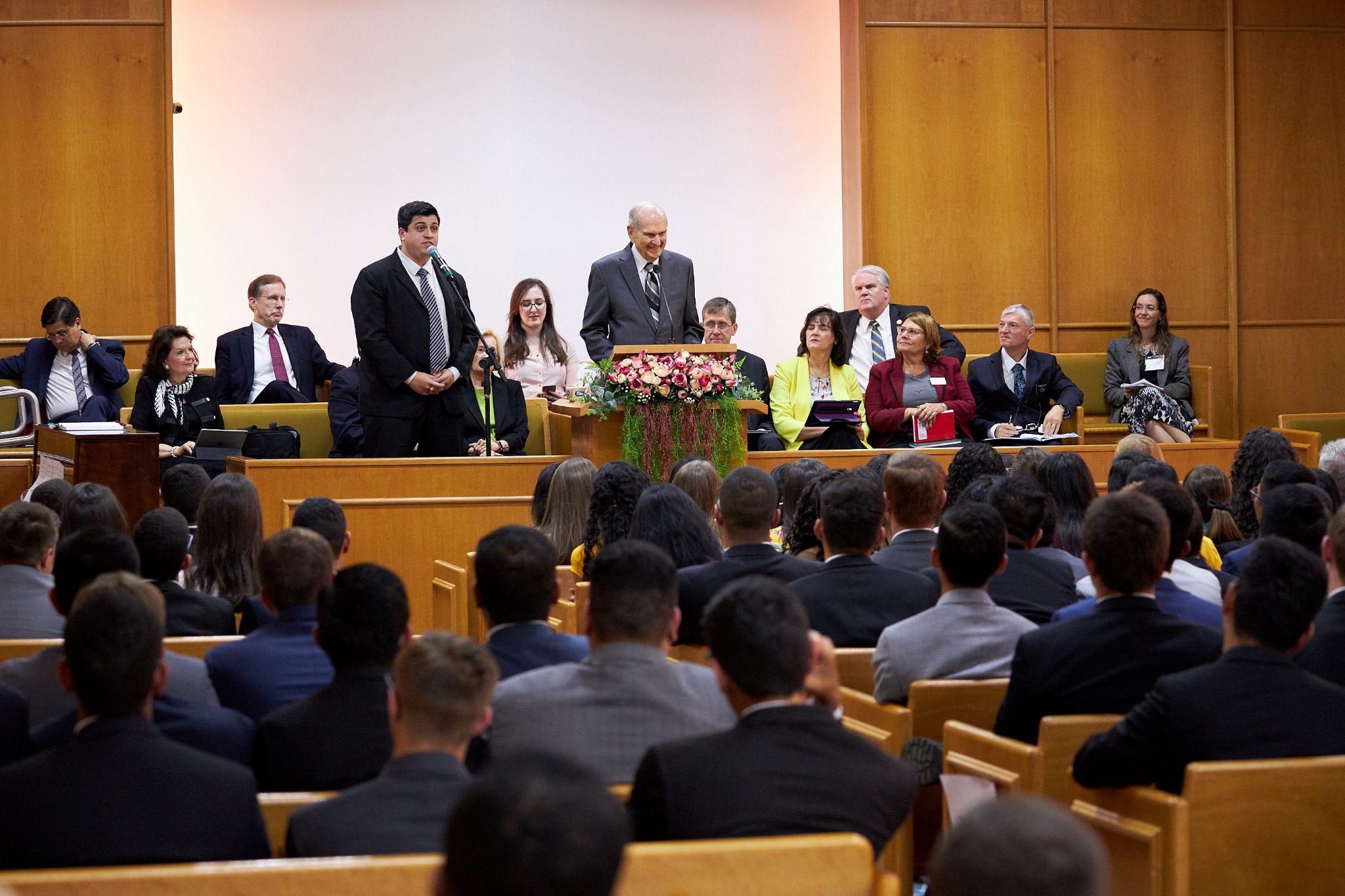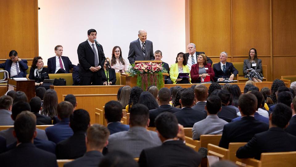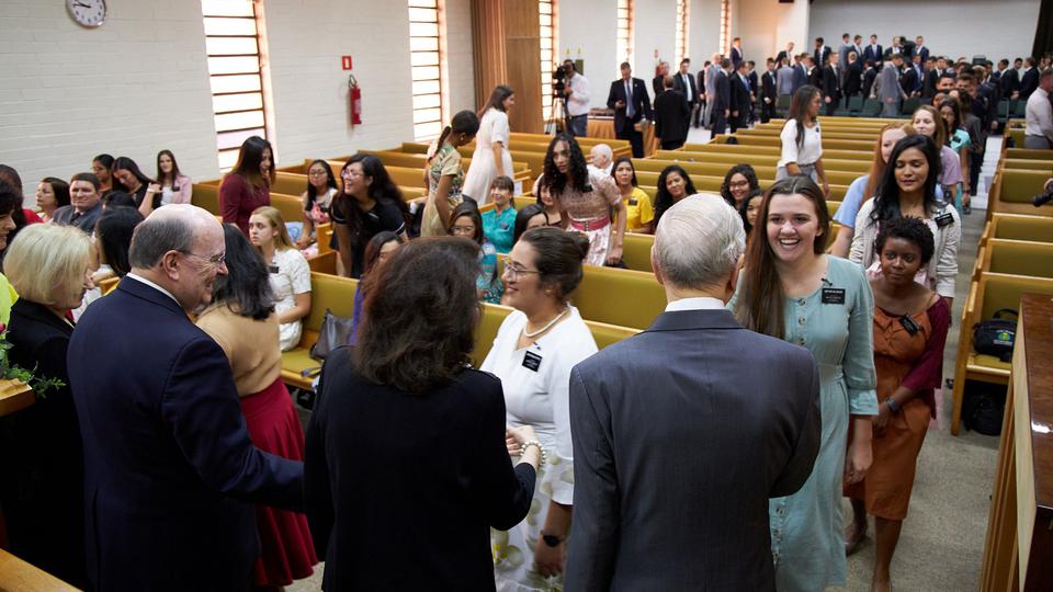 Friday, President Nelson greeted missionaries in the capital of Brasilia. A devotional was held for the young men and women who are serving full-time missions for the Church in an area of the world where membership is growing. The meeting was broadcast to the 35 missions in Brazil.