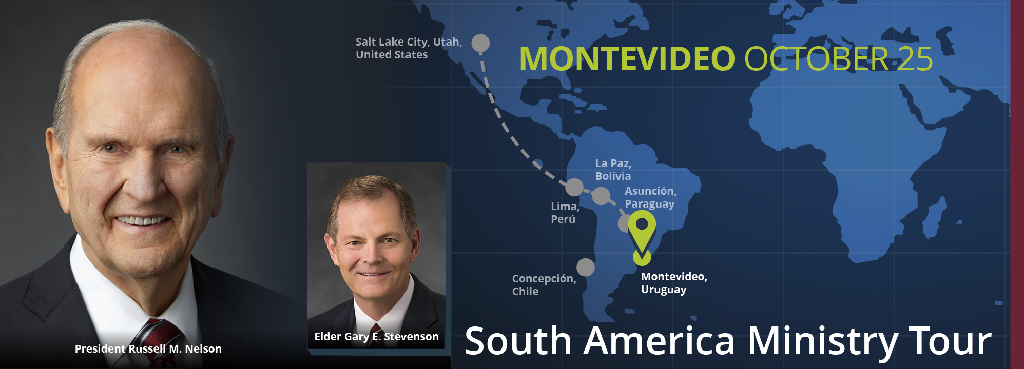 The South America ministry tour runs October 19–28, 2018. The senior Church leaders are meeting with Latter-day Saint members and missionaries, government and religious leaders and friends in Peru, Bolivia, Paraguay, Uruguay and Chile before returning to Salt Lake City. The ministry to the people of South America ends with the dedication of the Concepción Chile Temple on Sunday, October 28.