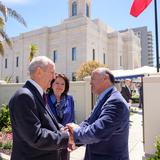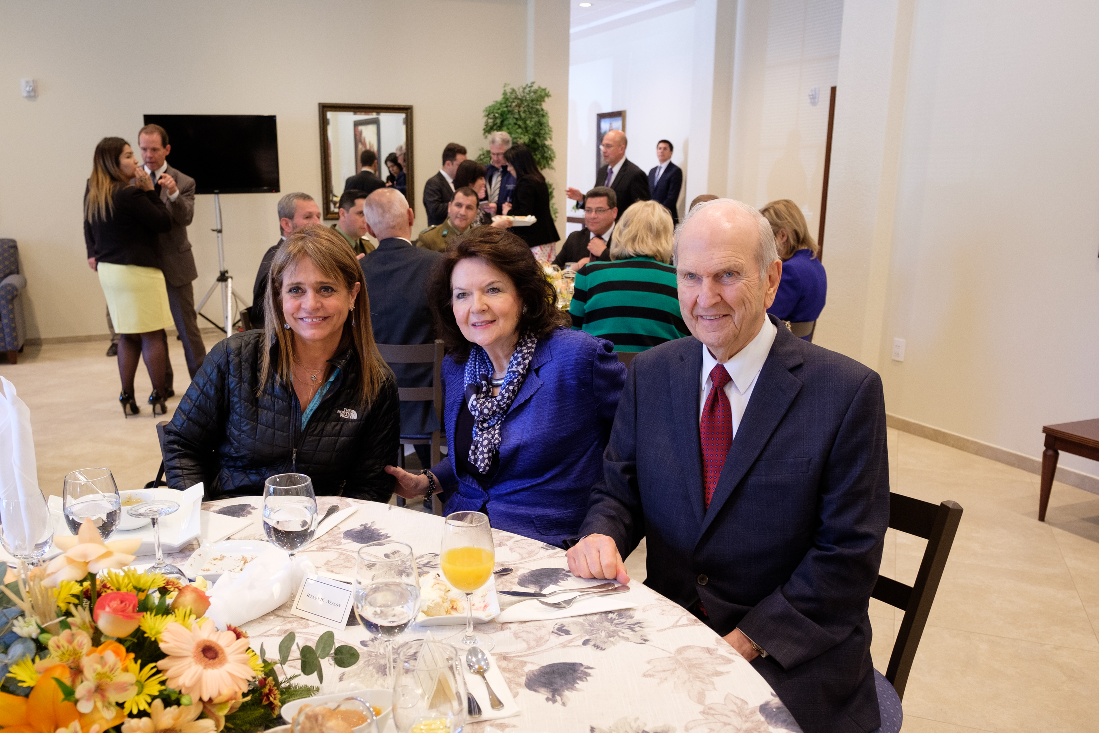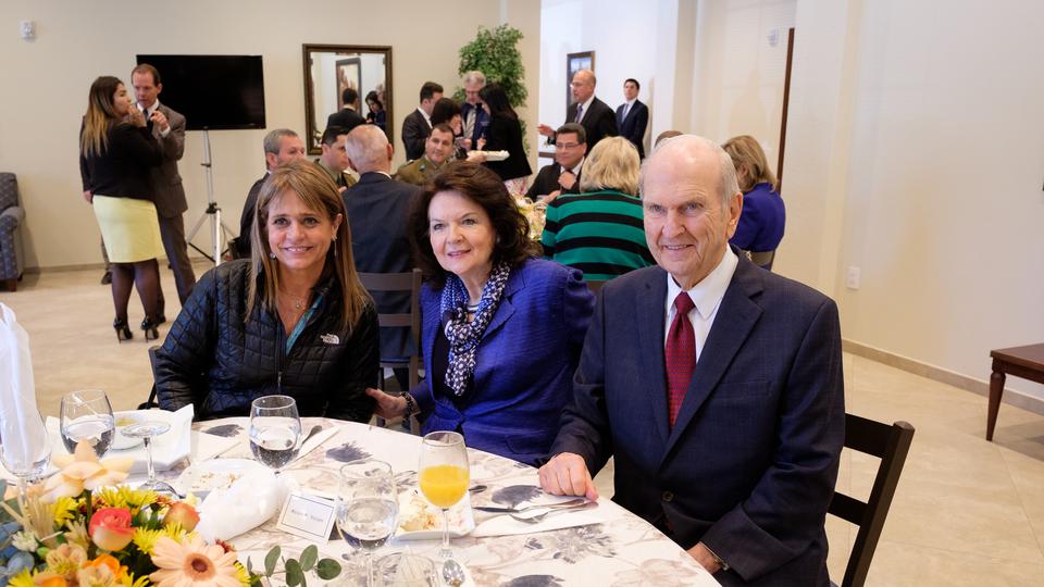Saturday President Nelson held a luncheon on the temple grounds with government leaders and dignitaries. Among those seated at a table with President and Sister Nelson were Jorge Ulloa A., a regional governor over southern Chile; Jaqueline Van Rysselberghe, a senator and national president of the Unión Demócrata Independiente party; and Fransico Javier Irarrázabal, director of COANIQUEM Foundation, whose cousin was a medical student of President Nelson’s when he taught in Santiago.