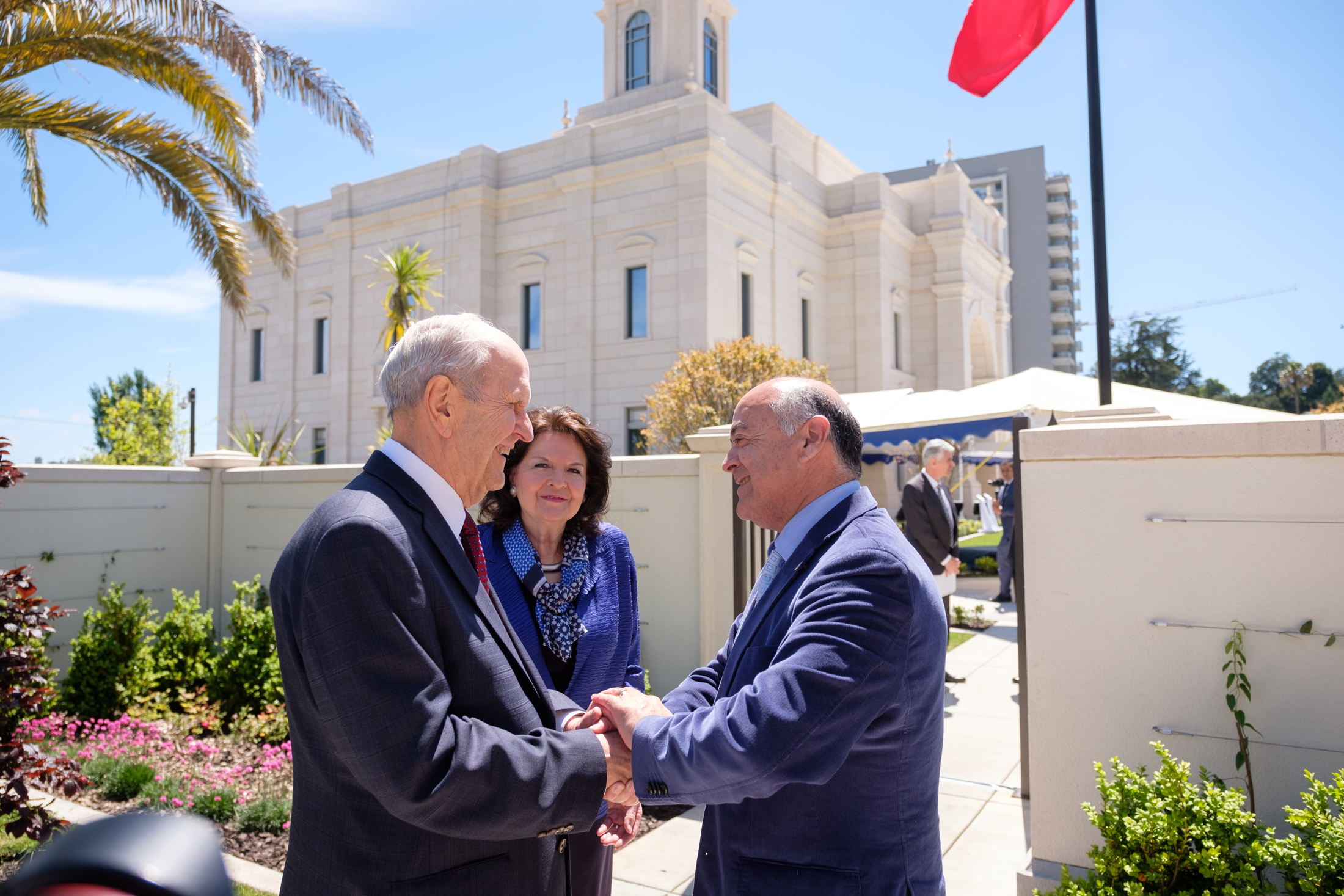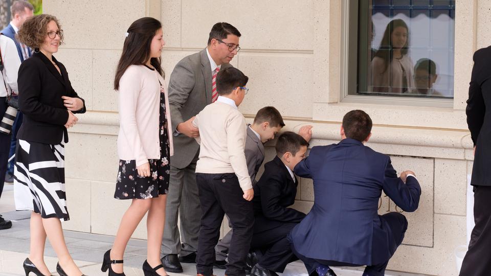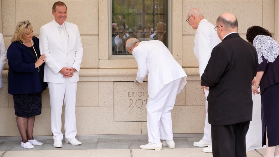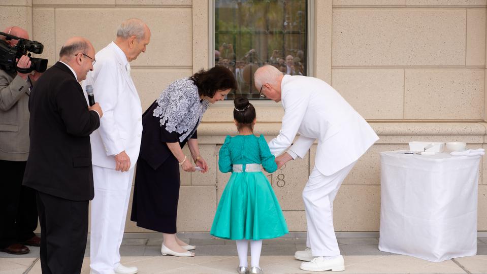 President Nelson; Elder Gary E. Stevenson of the Quorum of the Twelve Apostles; Presiding Bishop Gérald Caussé; Elder Larry Y. Wilson, executive director of the Temple Department; and other Church leaders participated in the morning exterior cornerstone ceremony and the dedicatory prayer inside the temple to complete the first of three dedicatory sessions of the temple, located in south-central Chile.