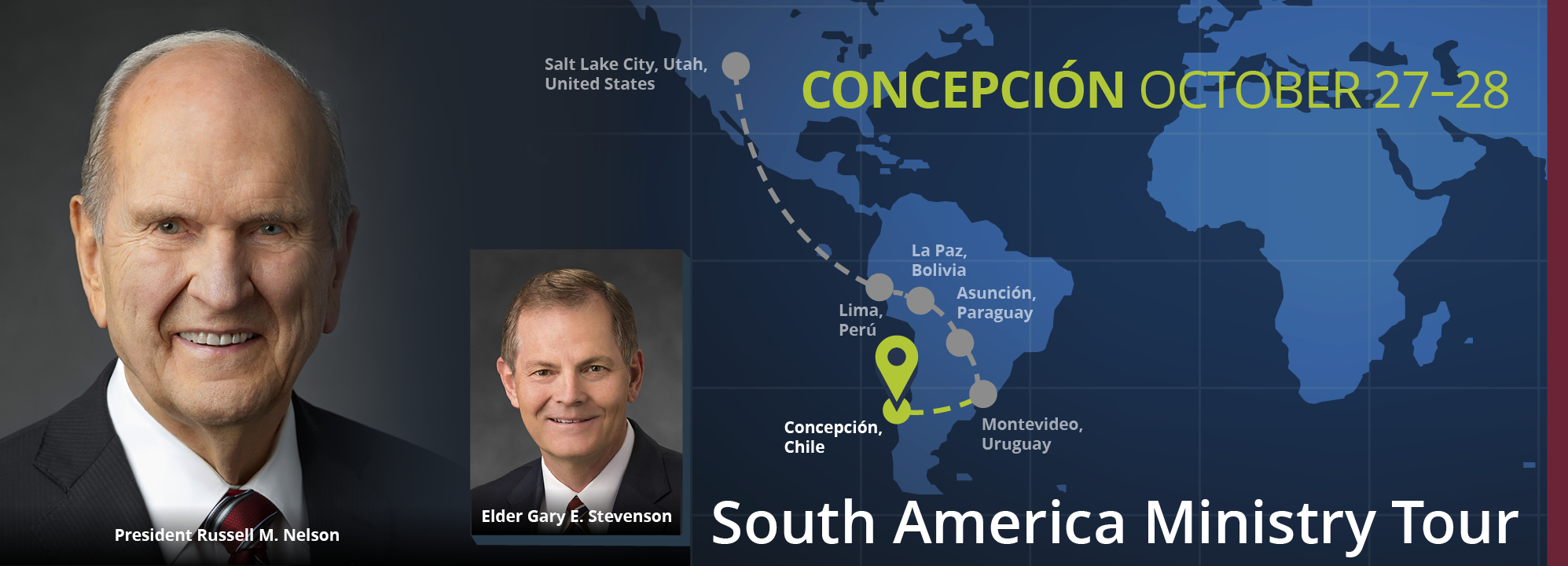 President Nelson and his wife, Wendy, and Elder Stevenson and his wife, Lesa, left Salt Lake City on October 19 for a nine-day, five-country journey to South America. The stop in Concepción, Chile, and the temple dedication is the pinnacle of their trip. President Nelson ministered and offered prophetic counsel in English and Spanish to tens of thousands of Latter-day Saints in Peru, Bolivia, Paraguay, Uruguay and Chile.