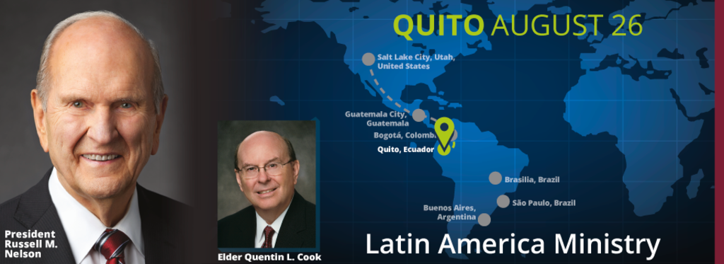 The capital and largest city in Ecuador is the third stop on the prophet’s five-country Latin America ministry, which has included visits to Guatemala and Colombia. President Nelson is traveling with his wife, Wendy, and Elder Quentin L. Cook of the Quorum of the Twelve Apostles and his wife, Mary.