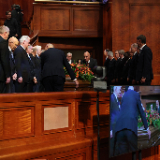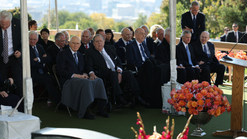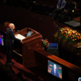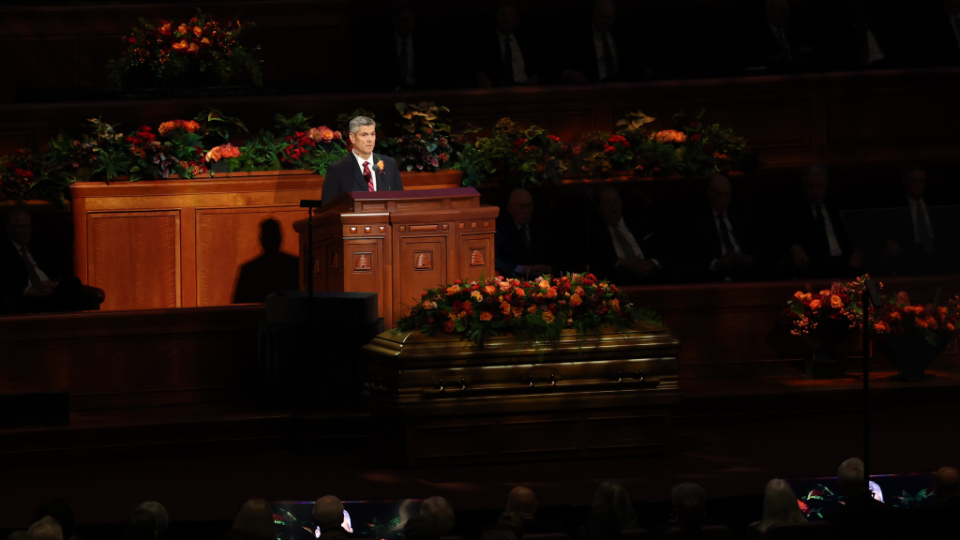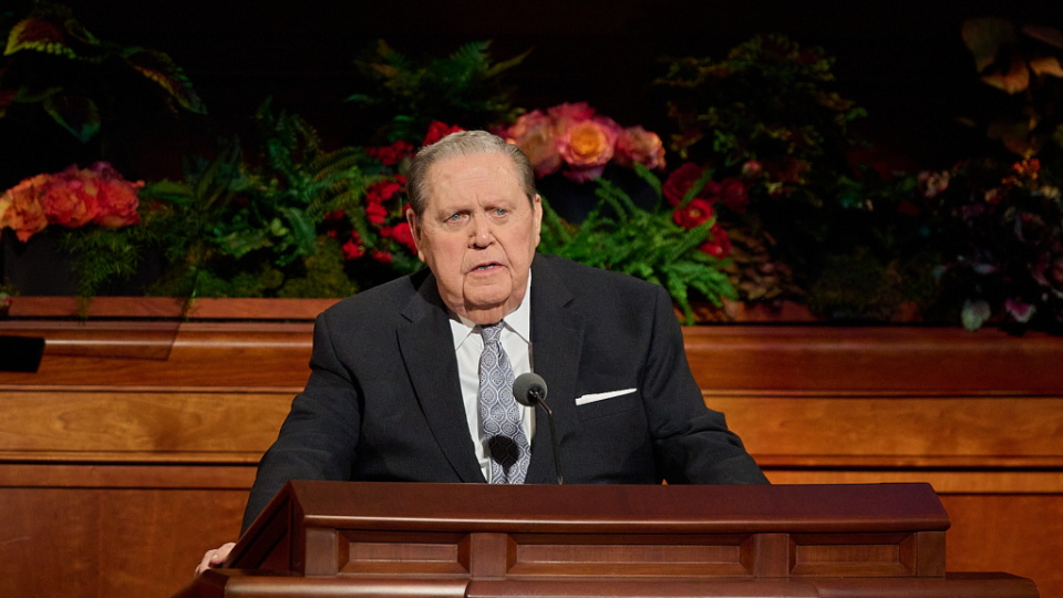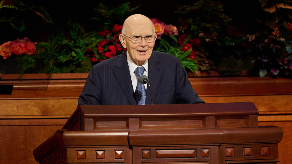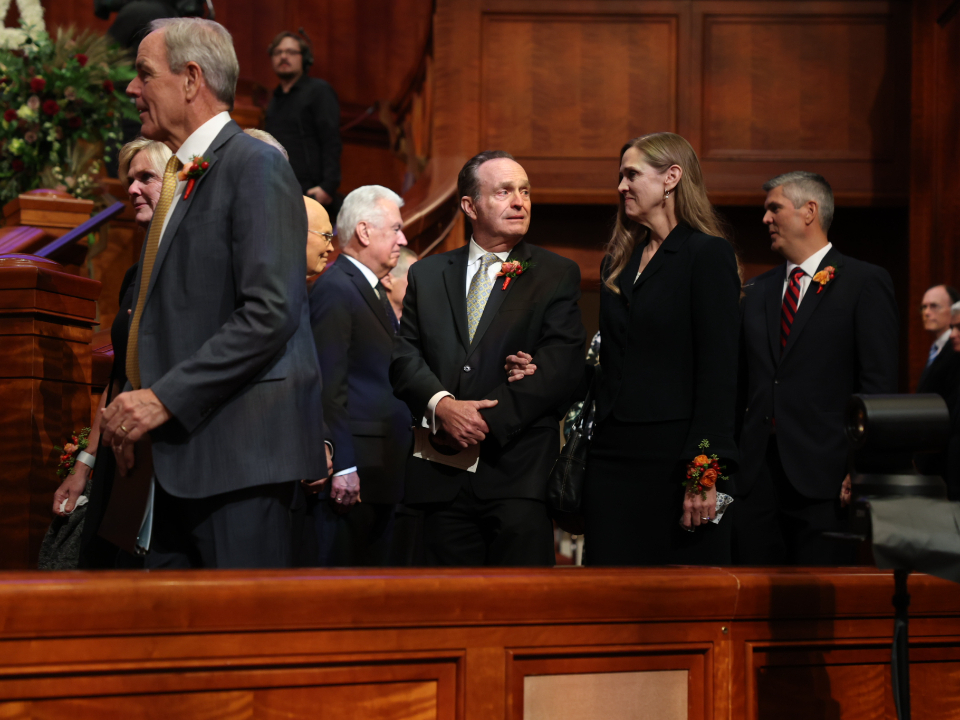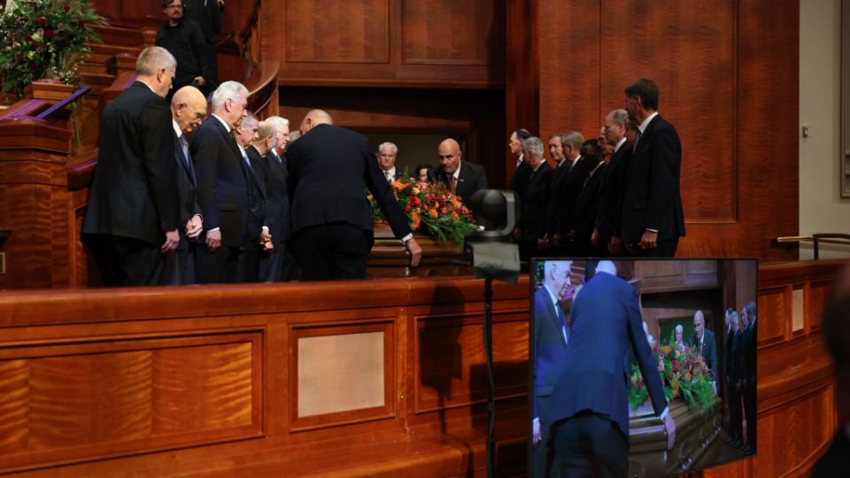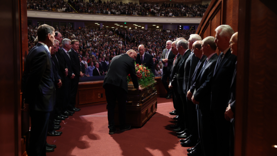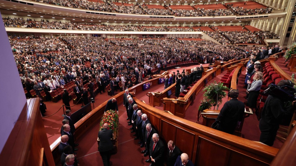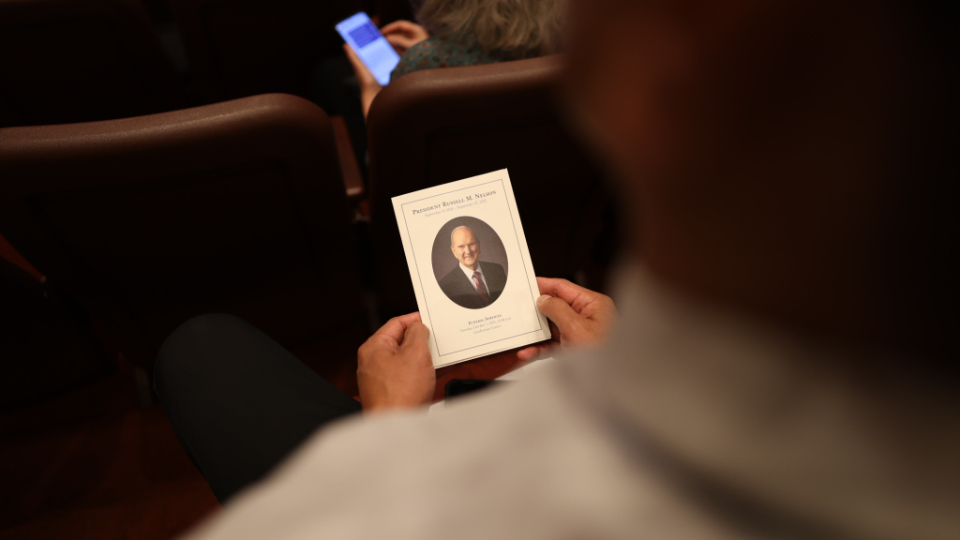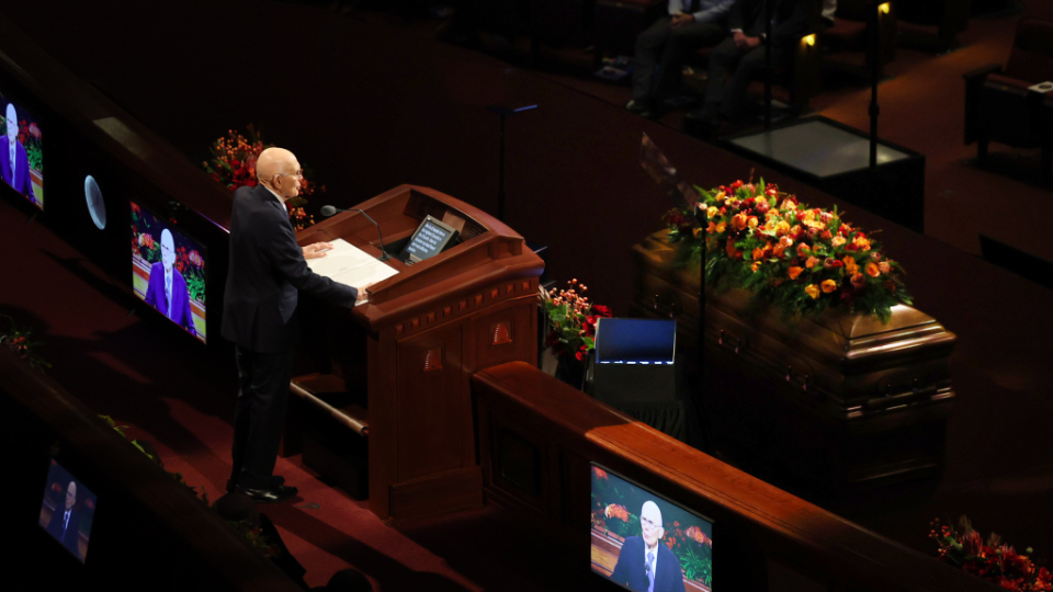 President Oaks and Elder Henry B. Eyring, who served as President Nelson’s counselors, joined two of the prophet’s 10 children — daughter Laurie N. Marsh and son Russell M. Nelson Jr. — and Elder Jeffrey R. Holland of the Quorum of the Twelve Apostles and Relief Society General President Camille N. Johnson to pay tribute to the prophet’s life and teachings. The Tabernacle Choir at Temple Square performed the music, including “Our Prayer to Thee,” which President Nelson wrote.