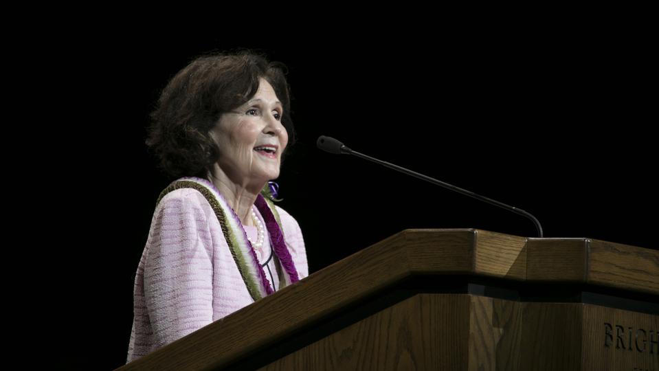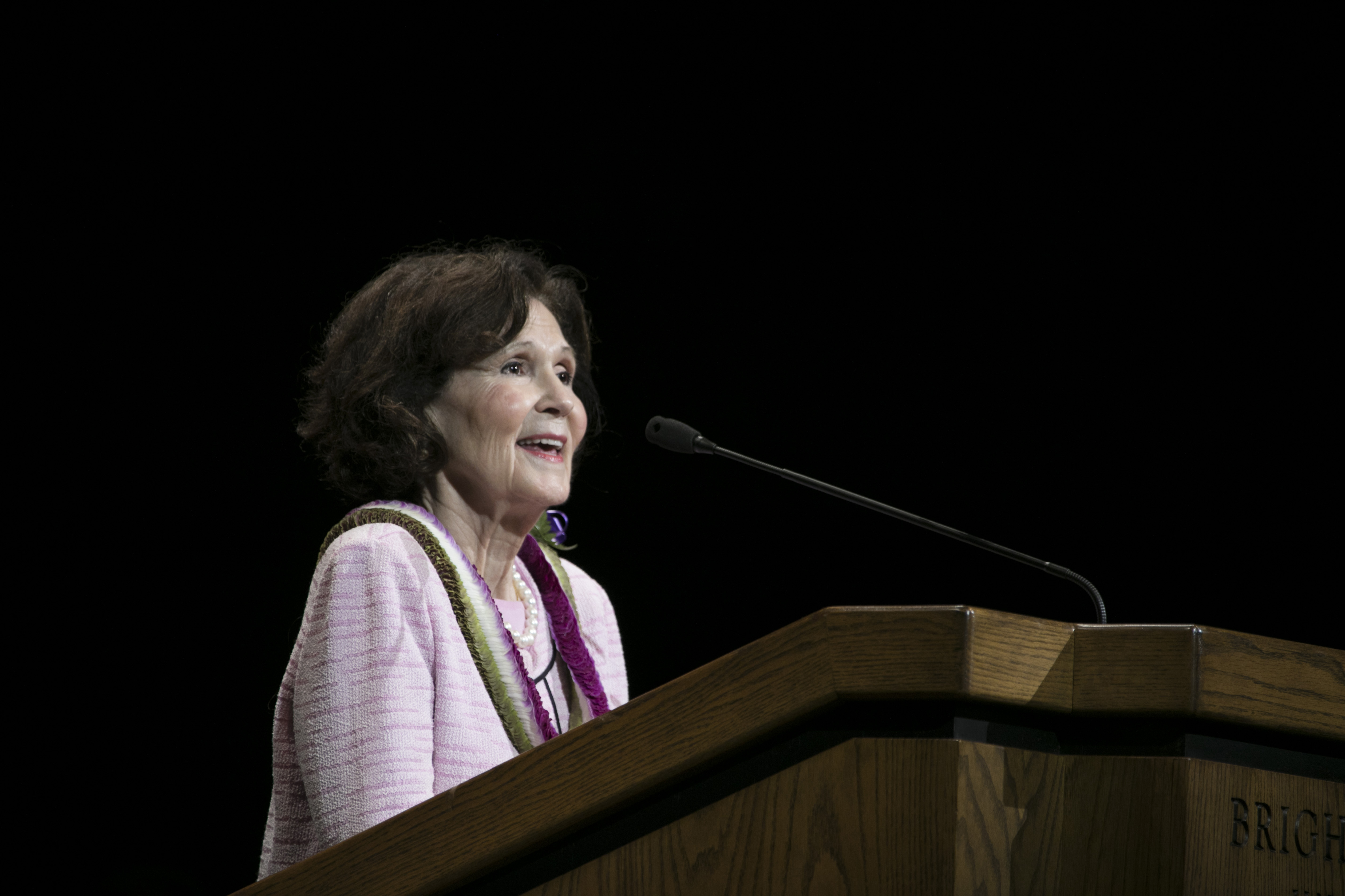 Sister Jean B. Bingham, Relief Society general president, and her husband, Bruce, attended the devotional. Sister Bingham spoke at the university's commencement the previous day.