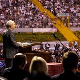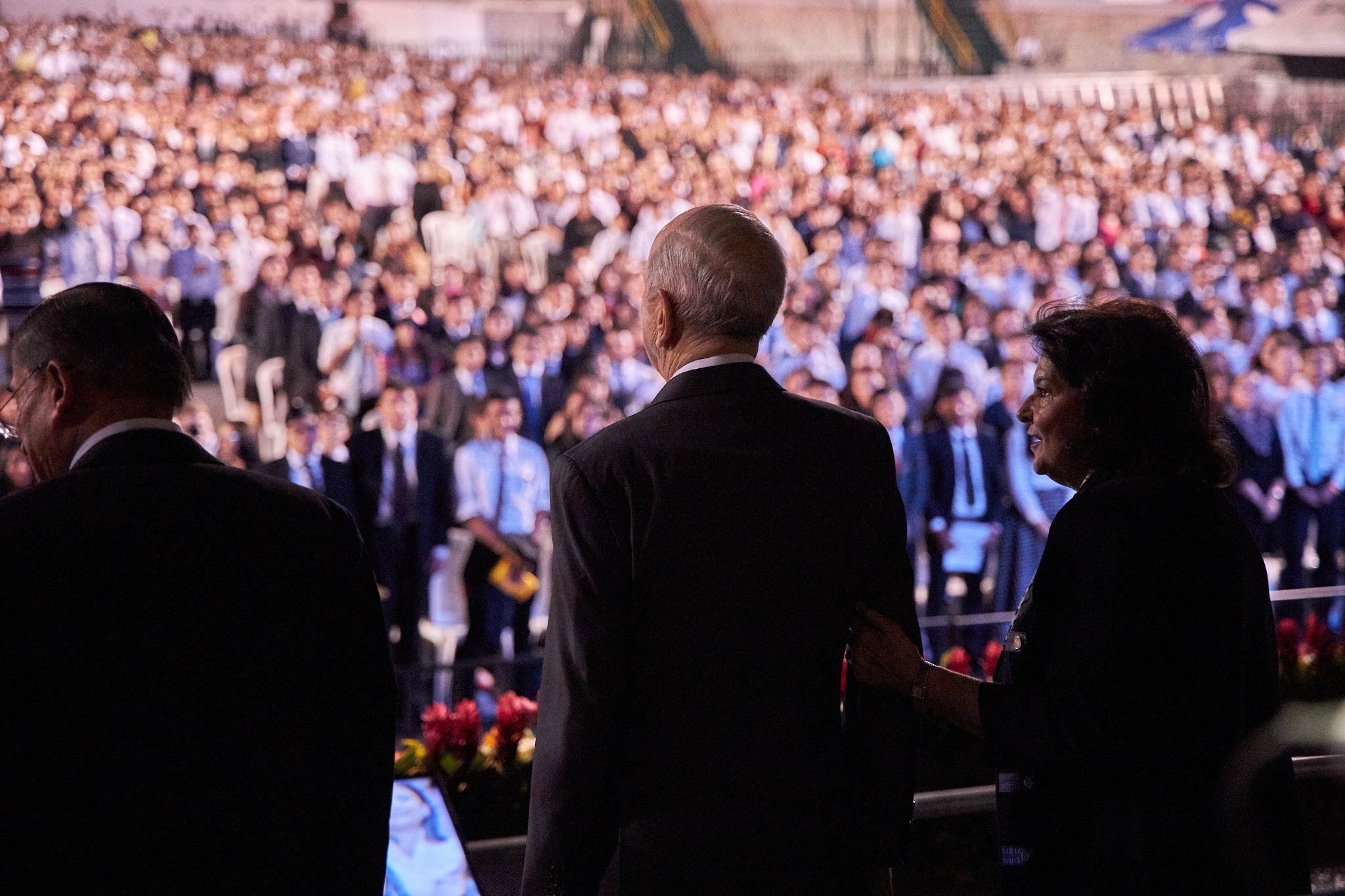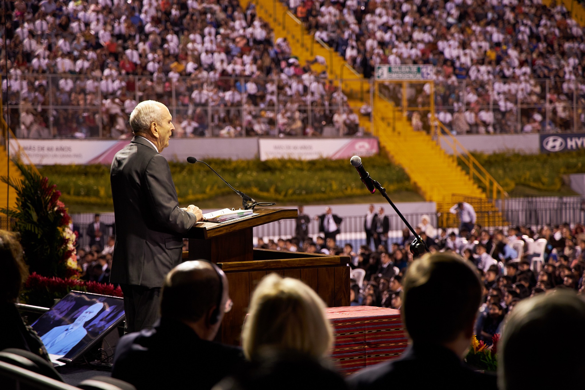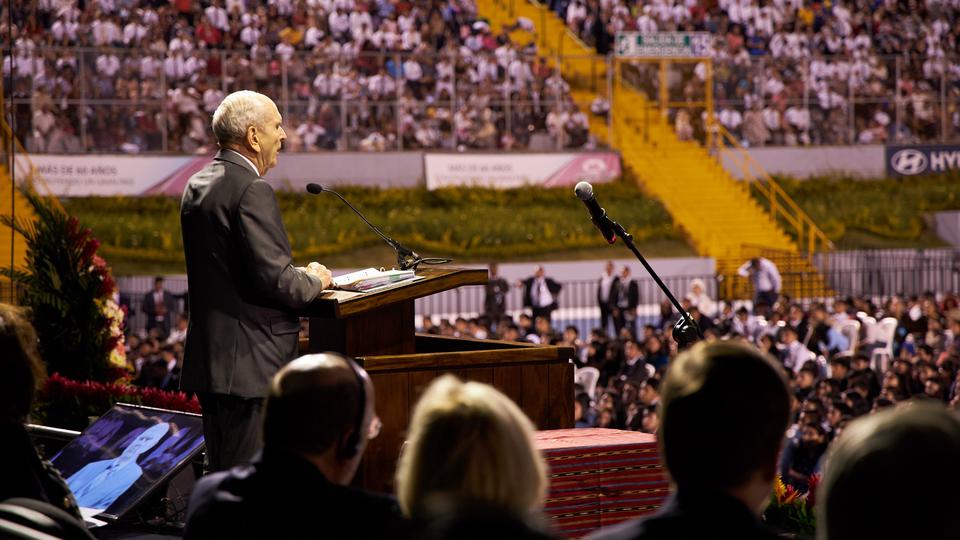 This was the prophet’s ninth visit to Guatemala. His first assignment to the country was in 1989 while serving in the Quorum of the Twelve Apostles. He reflected briefly Saturday night about previous visits to the country, including a visit to this same stadium with President Gordon B. Hinckley (1910–2008) in 1997 and a stop in 1991 with Elder Marvin J. Ashton (1915–1994). Elder Ashton dedicated Guatemala for the blessings of the gospel of the restored Church of Jesus Christ.