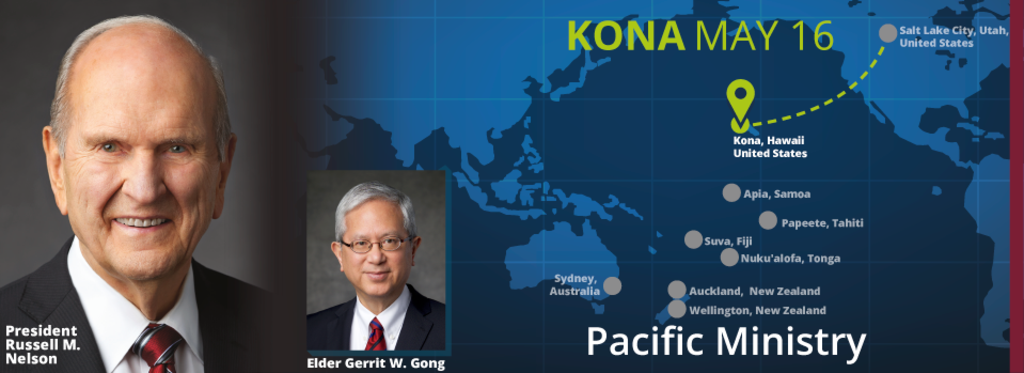 The Pacific ministry runs May 16–25, 2019. The senior Church leaders left Salt Lake City on Thursday for the overnight visit to Kona, Hawaii. Other stops will include Apia, Samoa; Sydney, Australia; Wellington and Auckland, New Zealand; Suva, Fiji; Nuku’alofa, Tonga; and Papeete, Tahiti, where the prophet’s trip will culminate with a 175th anniversary cultural program celebrating the arrival of the first missionaries to French Polynesia.