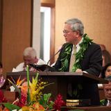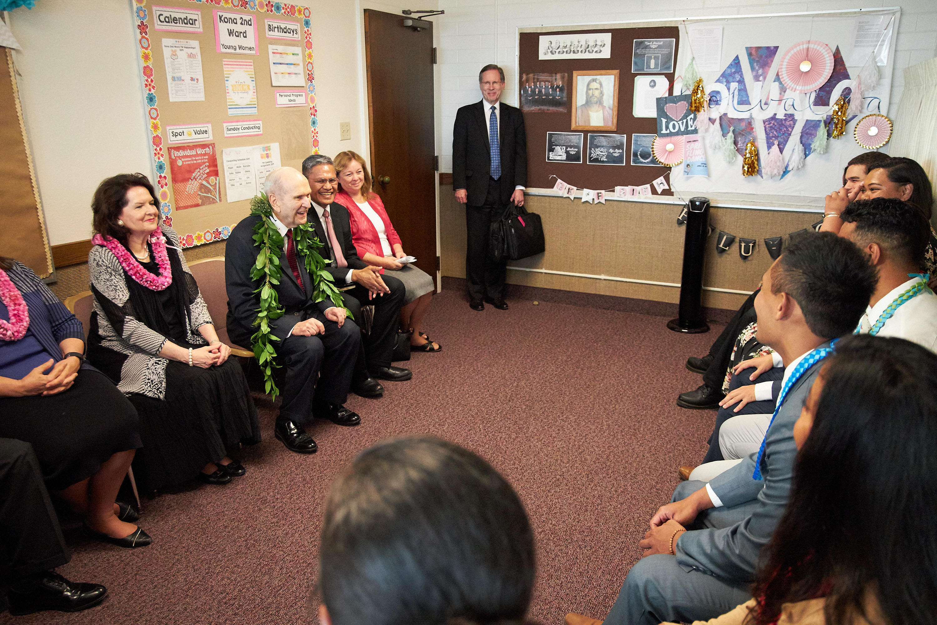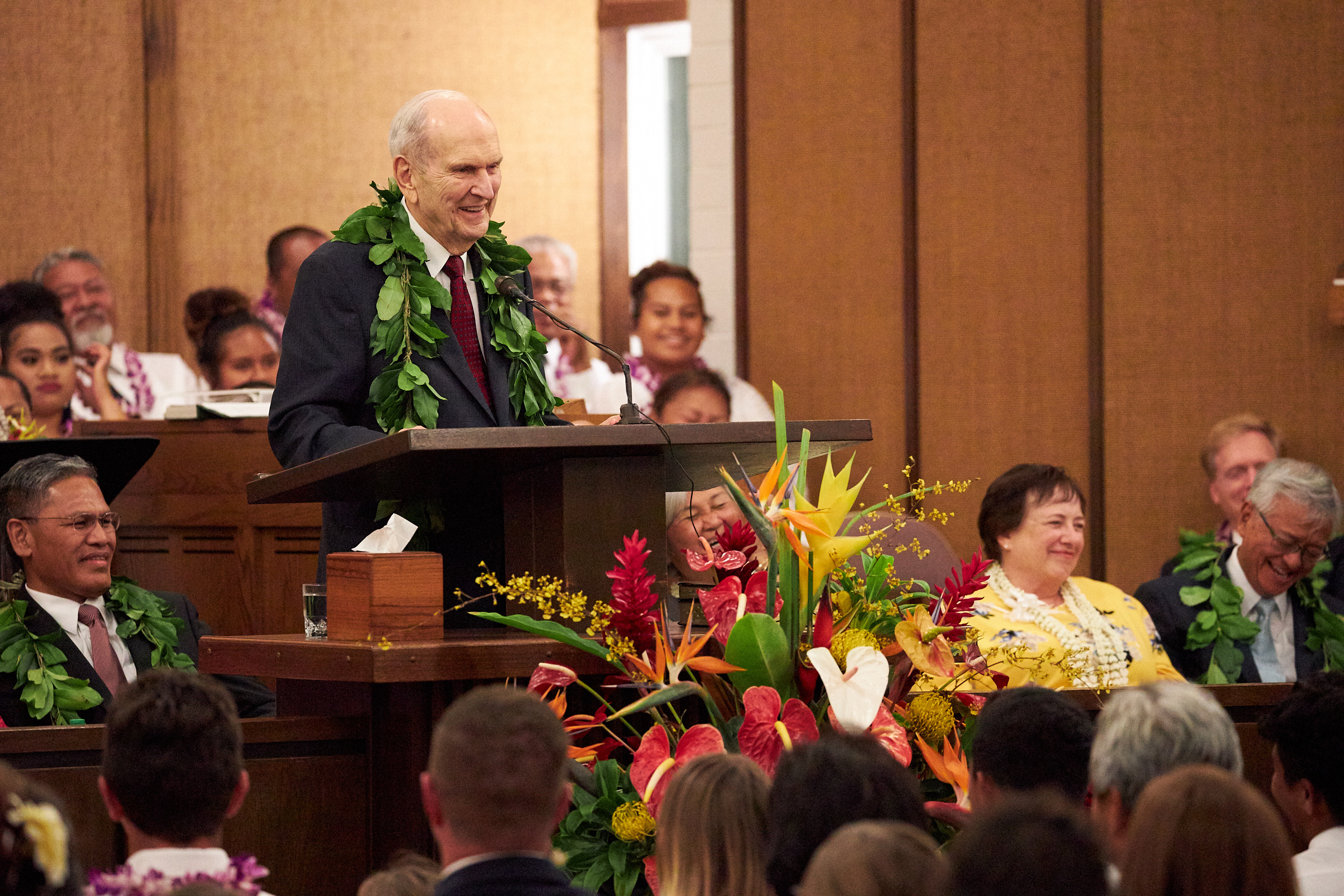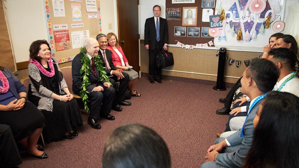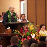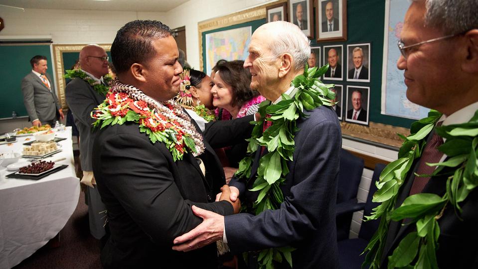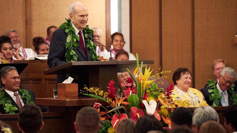 The president of The Church of Jesus Christ of Latter-day Saints, regarded by the faithful as a modern-day prophet, began his nine-day Pacific ministry with a visit to Kona, Hawaii Thursday. Hundreds of Hawaiian Latter-day Saints greeted President Russell M. Nelson and his wife, Wendy, along with Elder Gerrit W. Gong of the Quorum of the Twelve Apostles and his wife, Susan, at a meeting with young single adults, a reception with community leaders, and an evening devotional.