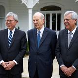 Following their visit with the king, President Nelson, Elder Gong and Elder Haleck spoke with members of Church media on the lawn outside the palace.