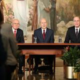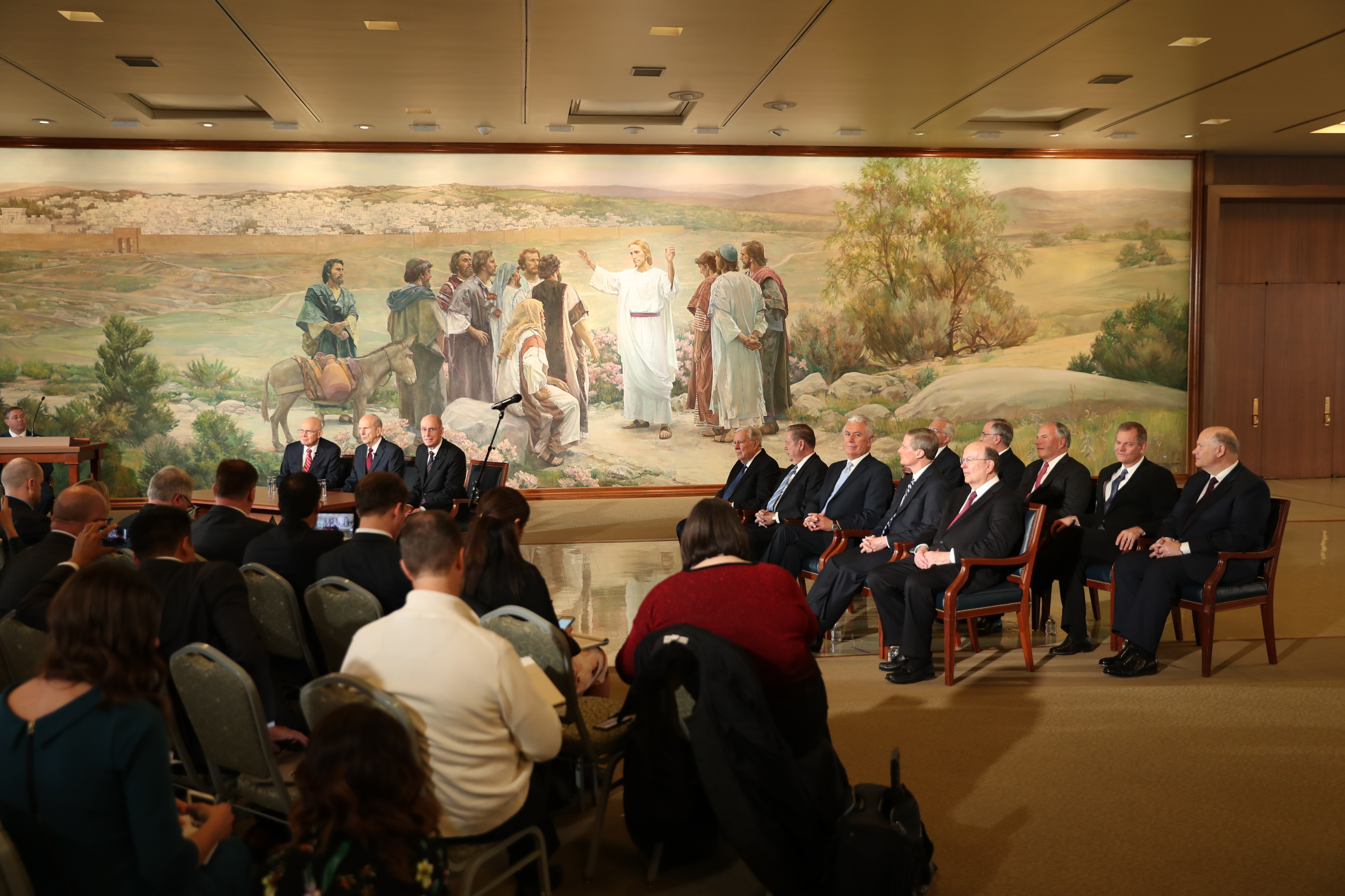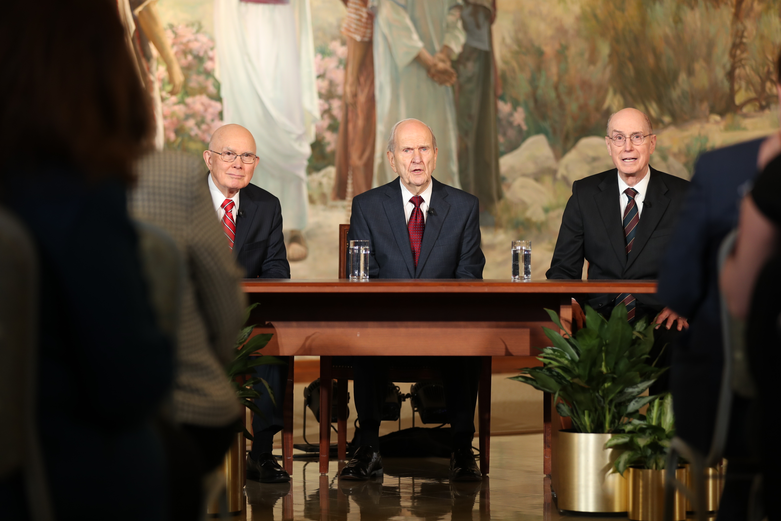 President Nelson and his counselors fielded questions from the media in the Church Office Building in Salt Lake City following a live message to members announcing the new First Presidency. His two counselors are President Dallin H. Oaks, 85, first counselor and president of the Quorum of the Twelve Apostles, and President Henry B. Eyring, 84, second counselor. The rest of the members of the Quorum of the Twelve Apostles were also in attendance, including newly announced acting quorum President M. Russell Ballard, as well as other senior leaders.
