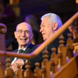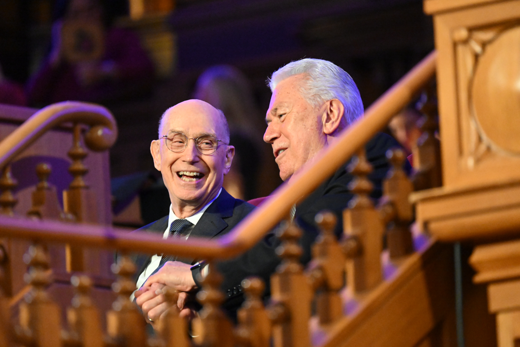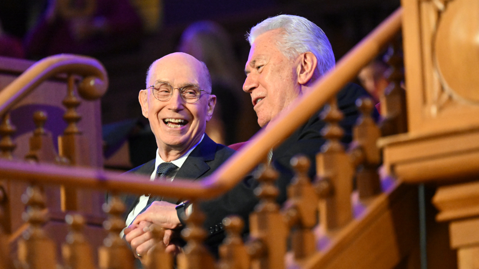 Elder Henry B. Eyring and Elder Dieter F. Uchtdorf of the Quorum of the Twelve Apostles of The Church of Jesus Christ of Latter-day Saints join hands and smile during "A Tribute to Russell M. Nelson" broadcast in the Salt Lake Tabernacle on Temple Square on Wednesday, October 1, 2025.2025 by Intellectual Reserve, Inc. All rights reserved.“With this gift, he had the ability to make each person feel loved,” Elder Eyring said. “When a group of Church officials or staff came into First Presidency meeting to make a presentation, he called all of them by name. When the meeting ended, as they were leaving, he would thank each of them, again calling them by name.”