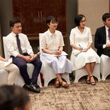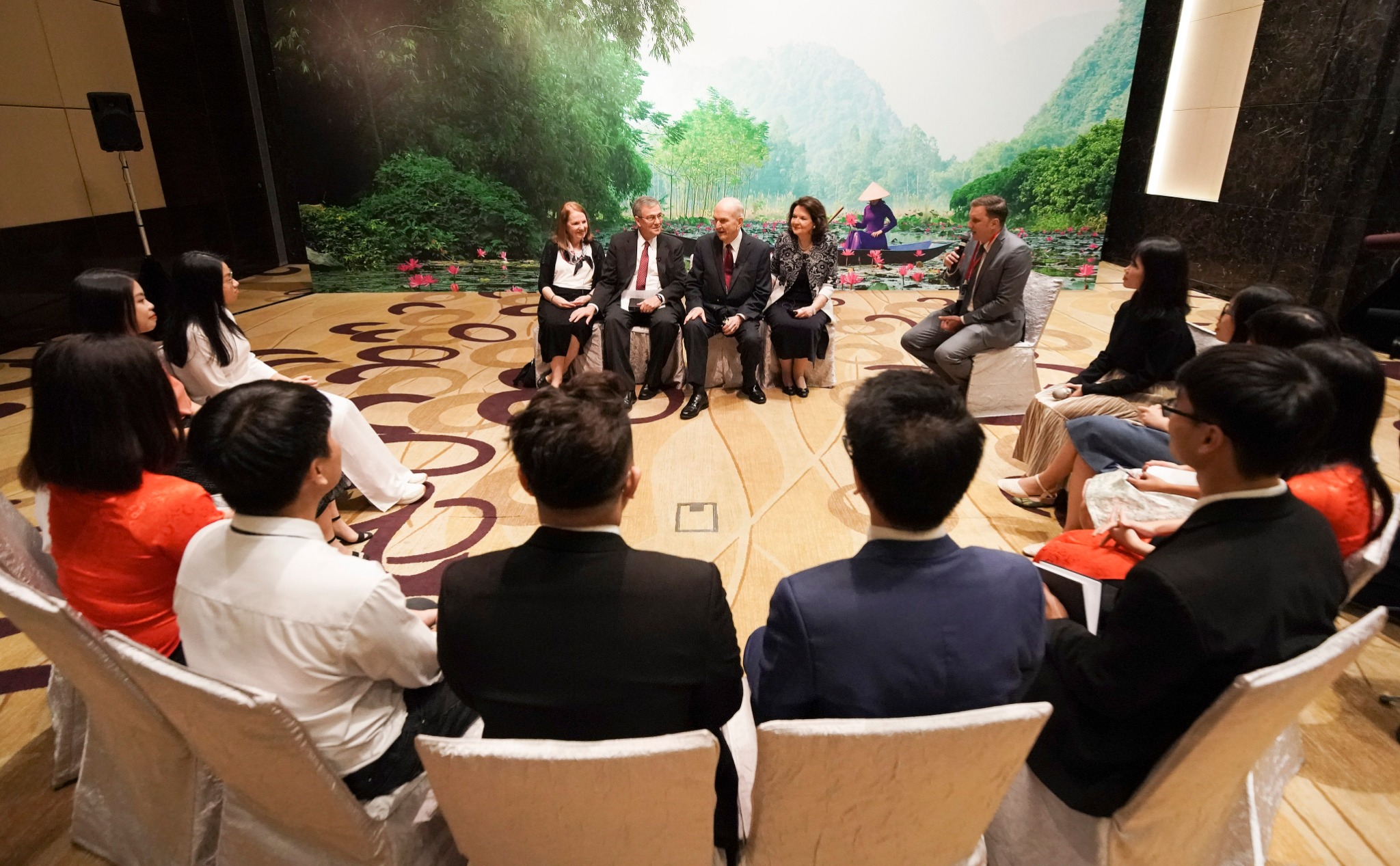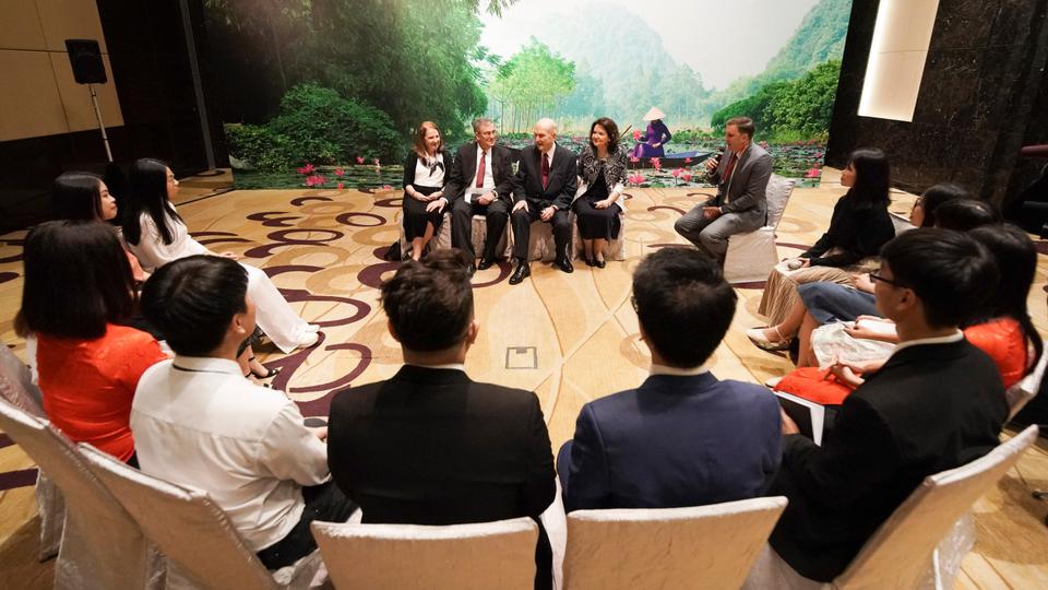 At a reception prior to the Sunday evening devotional in Hanoi, President Nelson and Elder Christofferson met Mr. Vu Chien Thang, chairman of the government Committee for Religious Affairs, as well as Hanoi mayor Mr. Nguyen Duc Chung and other prominent government leaders. On Monday, before traveling to Ho Chi Minh City, the Church leaders met again with Mayor Chung. He gave President Nelson and Elder Christofferson flowers and a miniature model of the Temple of Literature, the first university in Vietnam 1,000 years ago — a symbol of the importance of education. The Church leaders gave the mayor a small statue of a child’s first steps from mother to father to symbolize the faith’s attention to the family.