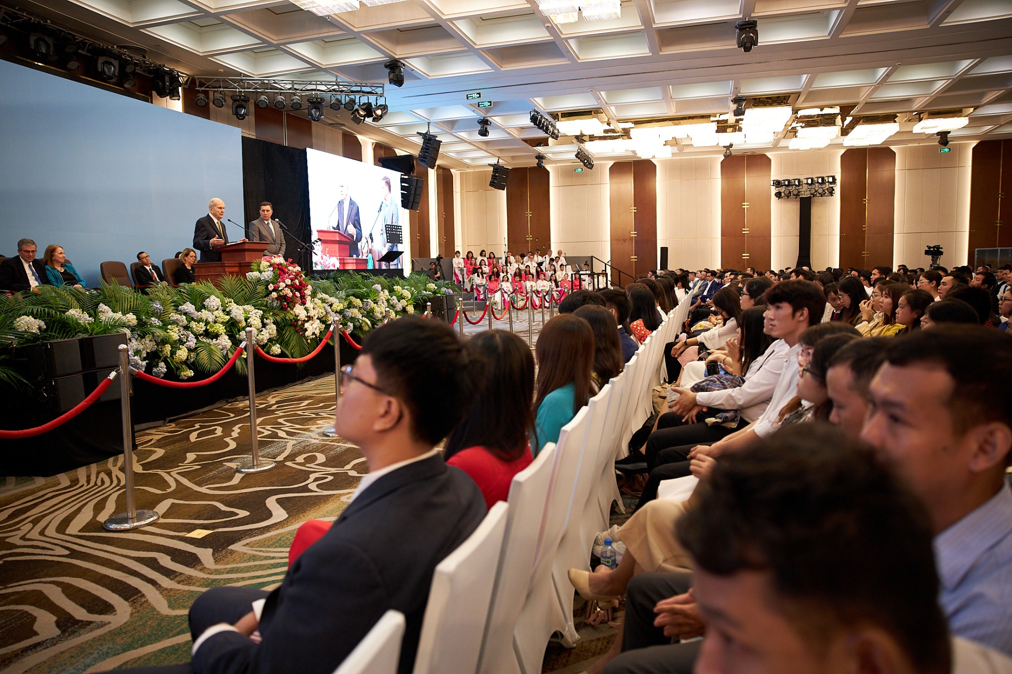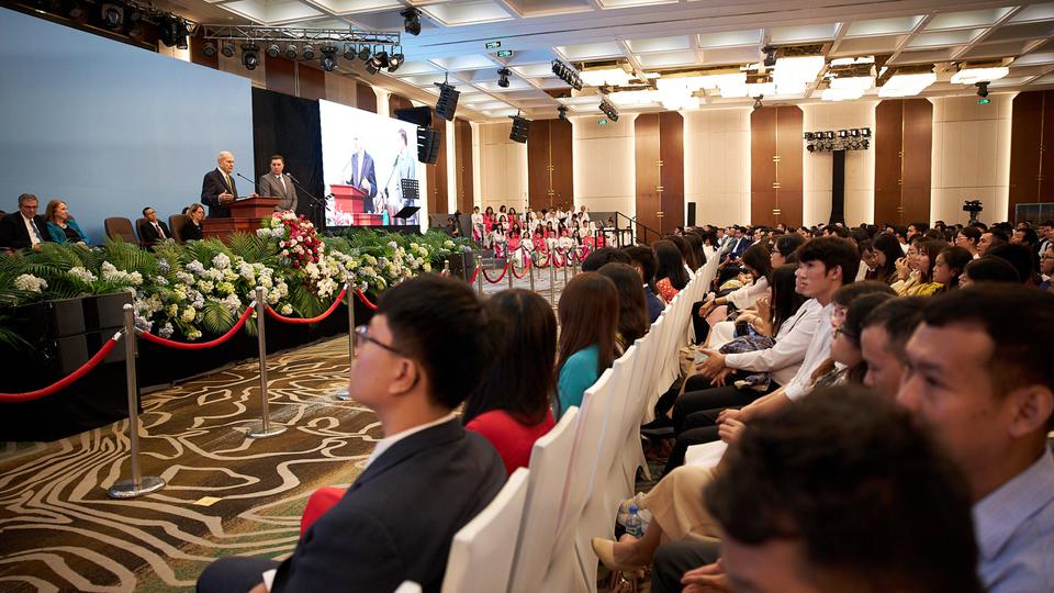 The global leader of The Church of Jesus Christ of Latter-day Saints spoke Sunday to assembled Saints in Hanoi’s JW Marriott Grand Ballroom and then Monday in Ho Chi Minh City’s Vinpearl Grand Ballroom. In both instances, he expressed his gratitude to the government for the privilege to gather and worship.