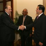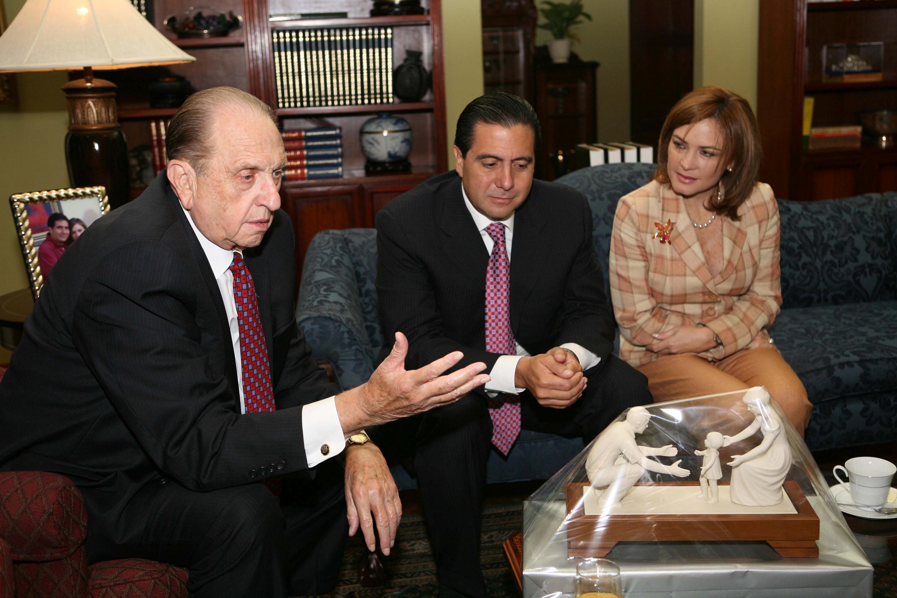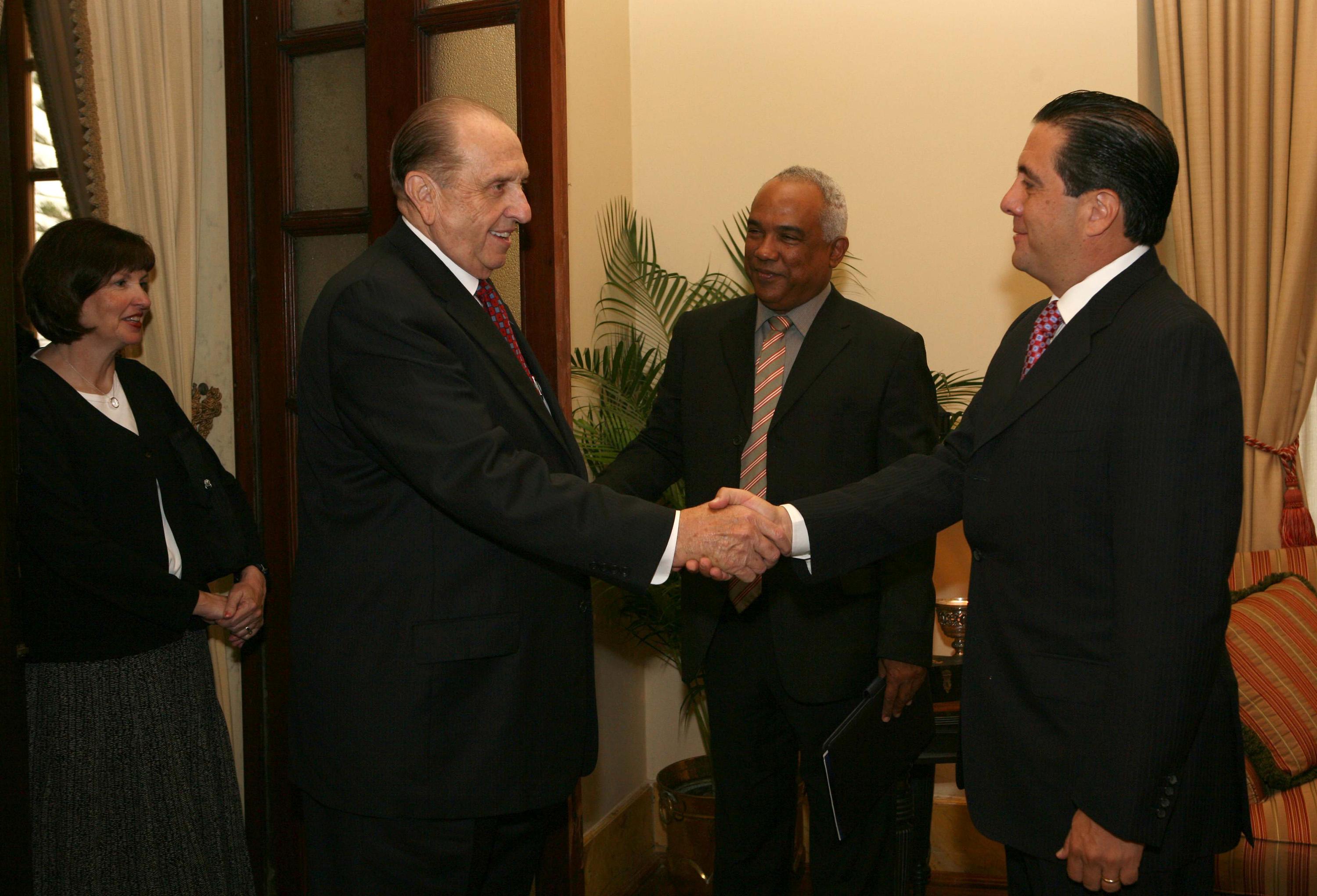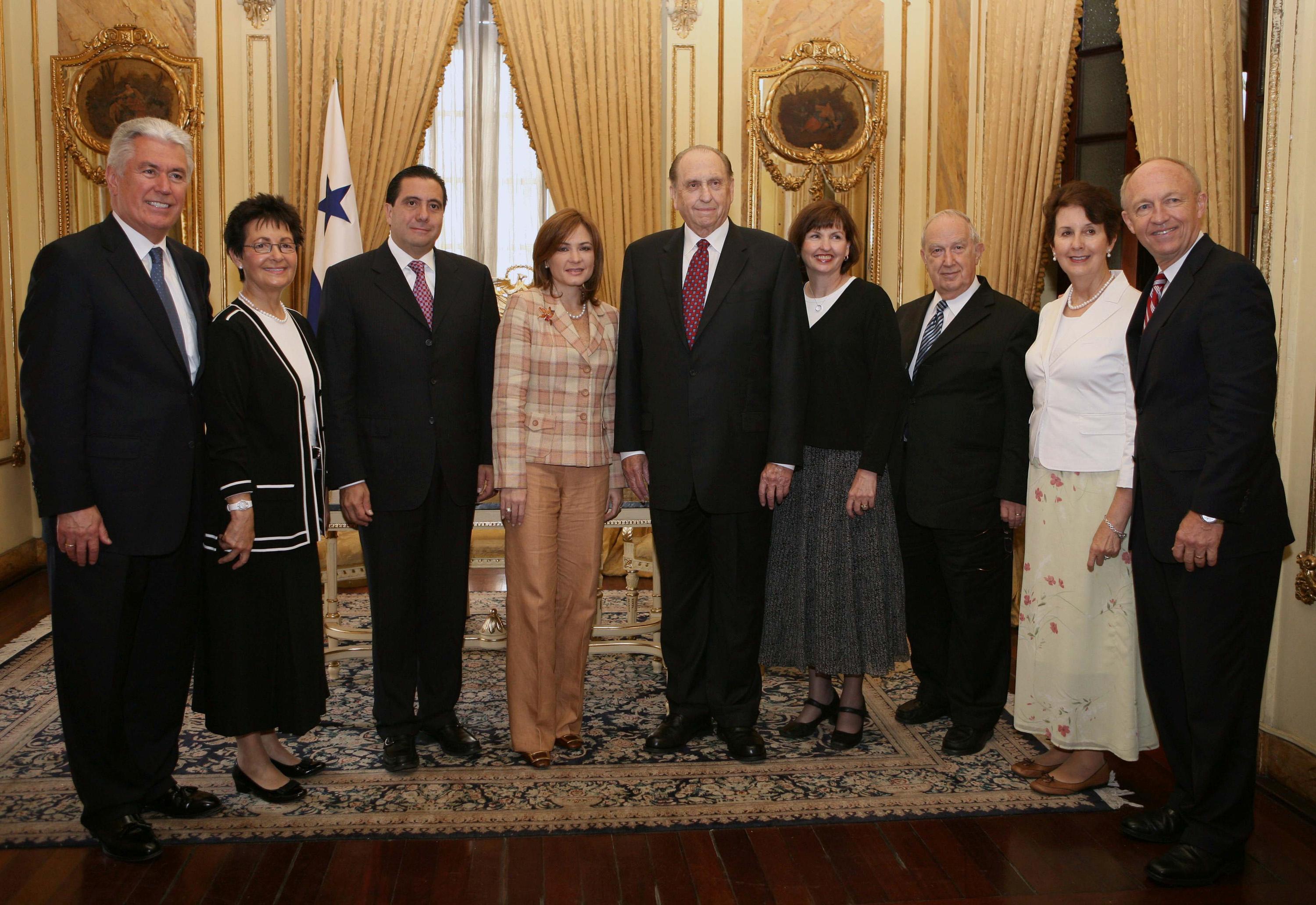 Following the Sunday dedicatory service of the Panama City Panama Temple of The Church of Jesus Christ of Latter-day Saints, Church President Thomas S. Monson joined with other Church leaders in a Monday meeting with Panamanian President Martín Torrijos and his wife, Vivian Fernández de Torrijos.