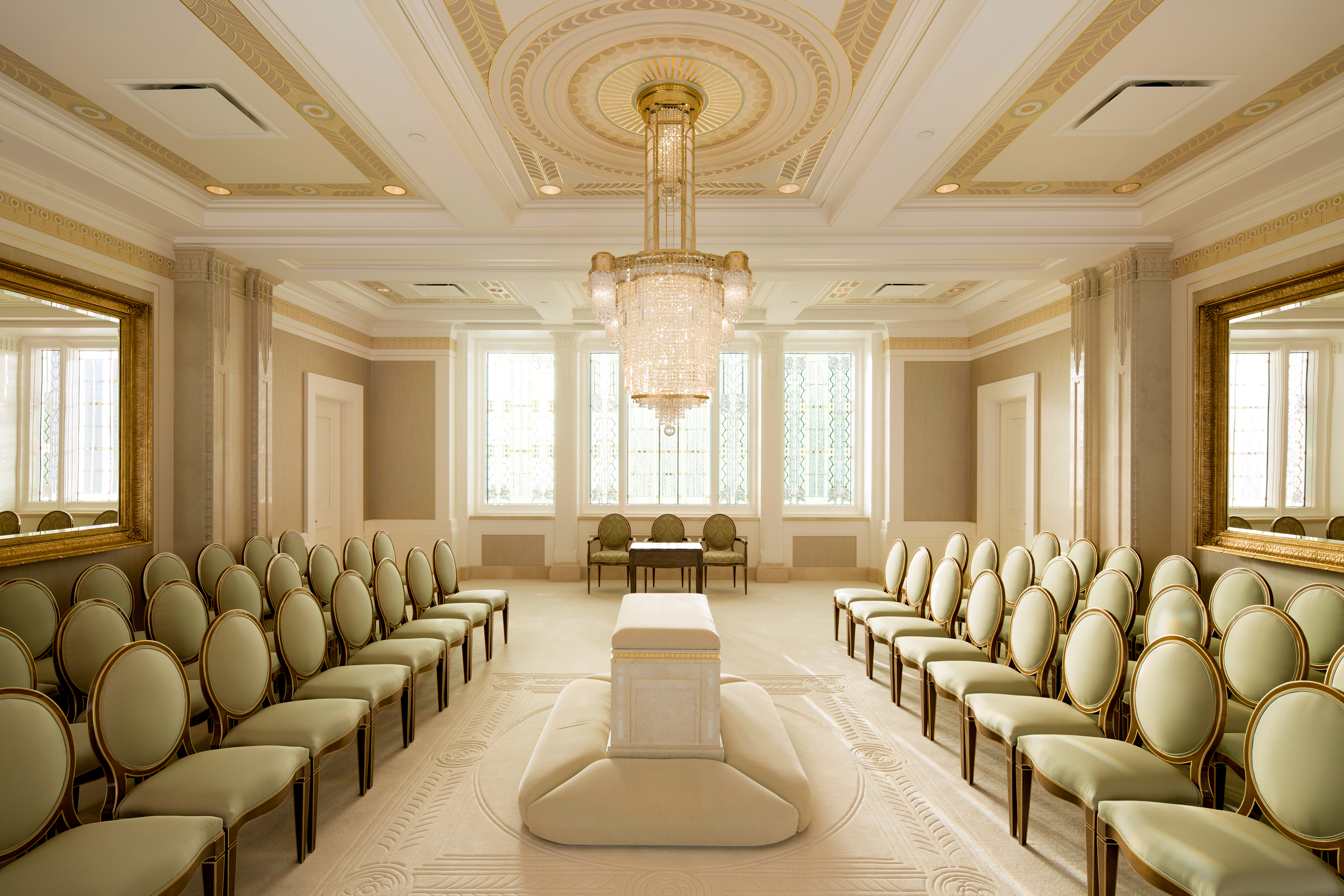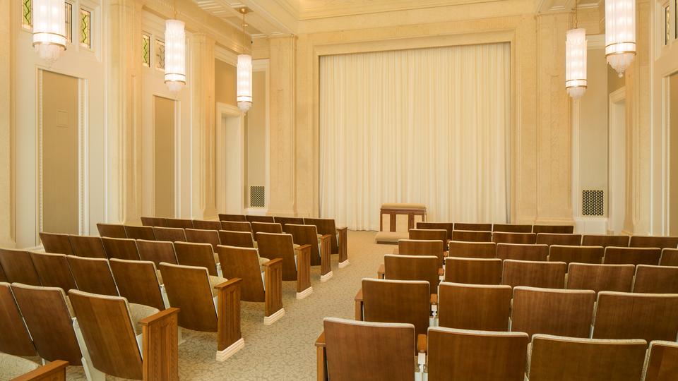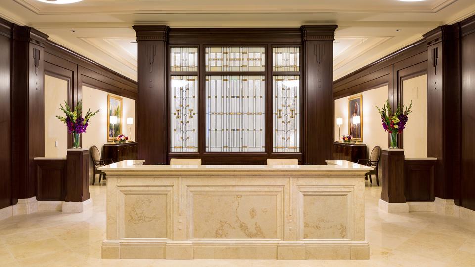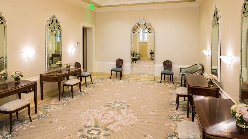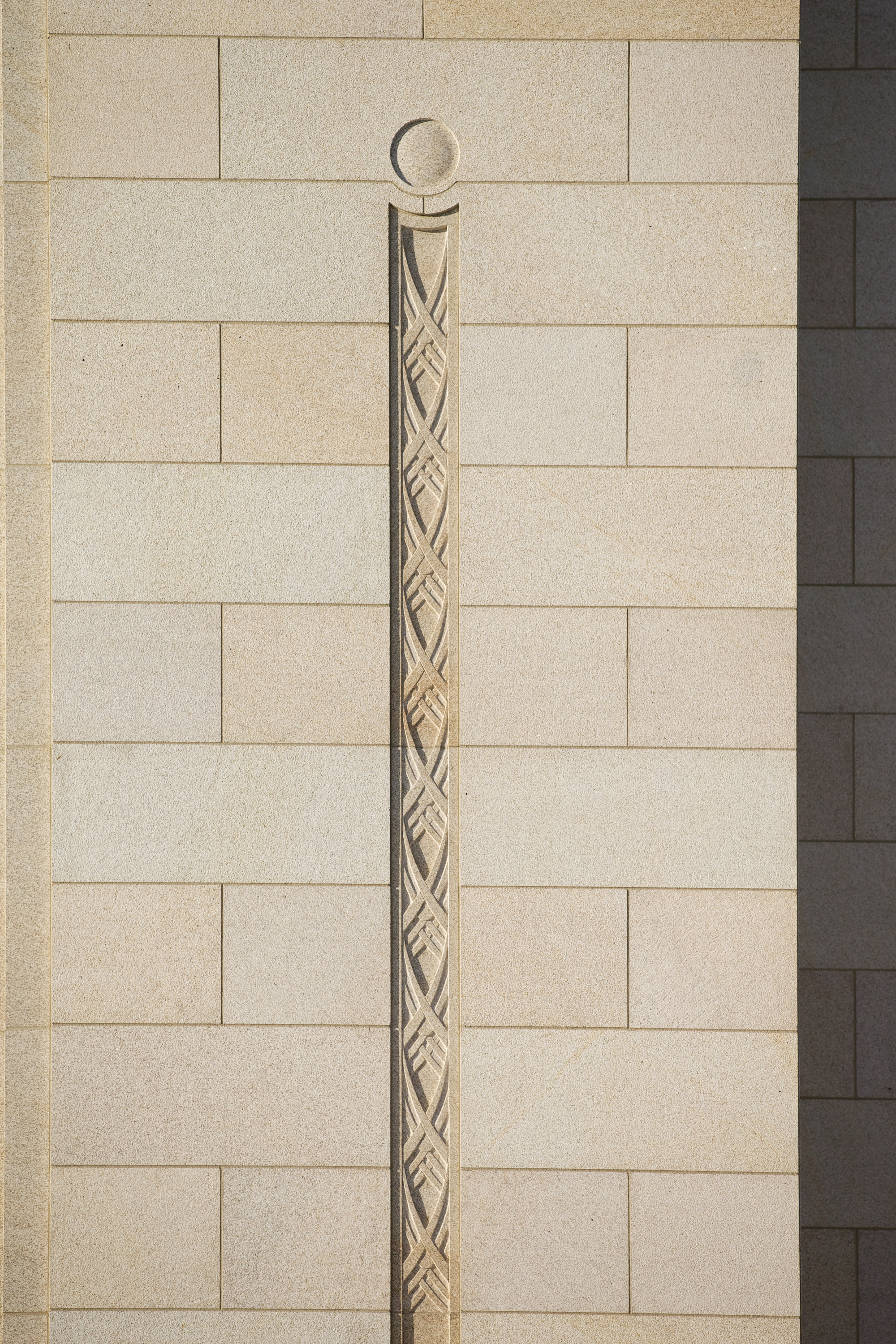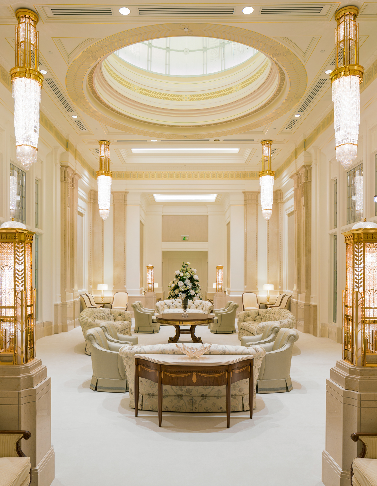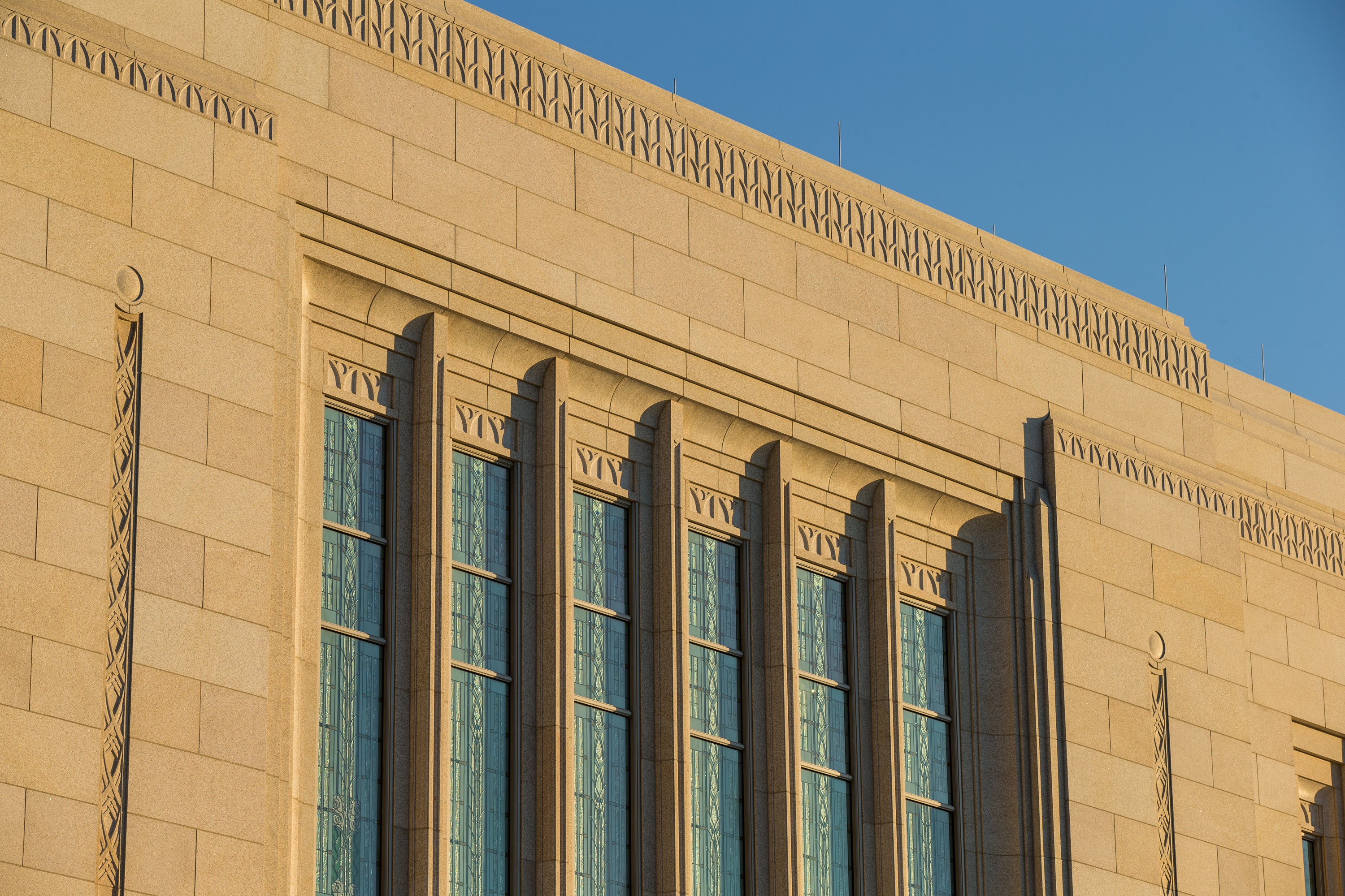 As part of the renovation, the temple’s entire exterior has been reshaped with new stone and art glass. The temple’s main entrance was moved from the west side to the east side, where it faces Washington Boulevard, one of the city’s main streets. The renovation of the temple also includes reconfigured rooms and new energy-saving electrical, heating, and plumbing systems. Other notable improvements include adding underground parking, new landscaping of the temple block, and the addition of a major water feature.
