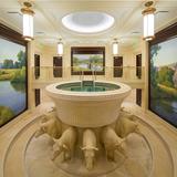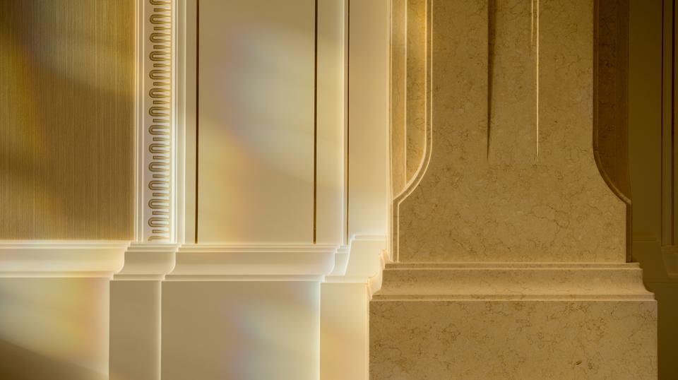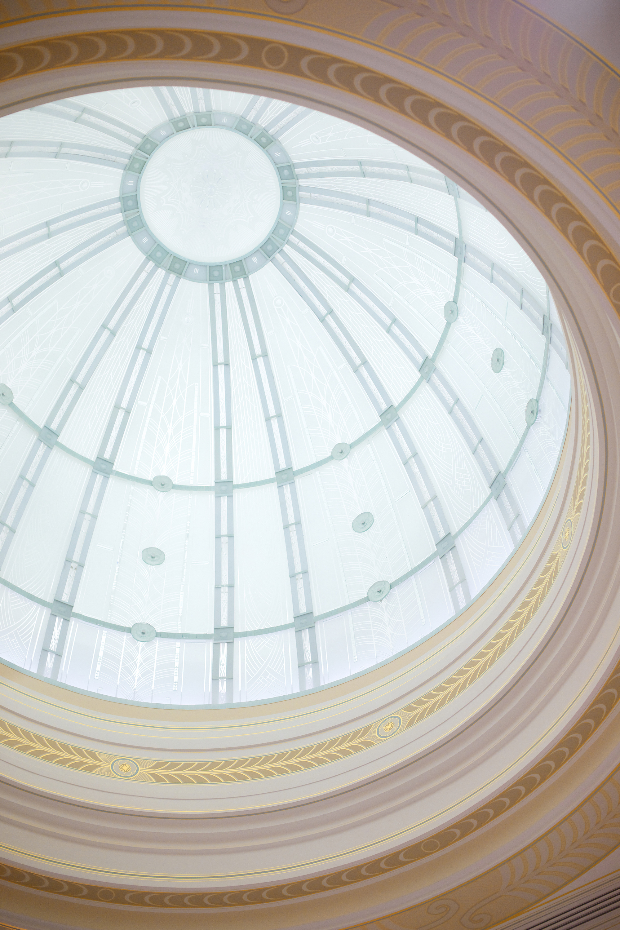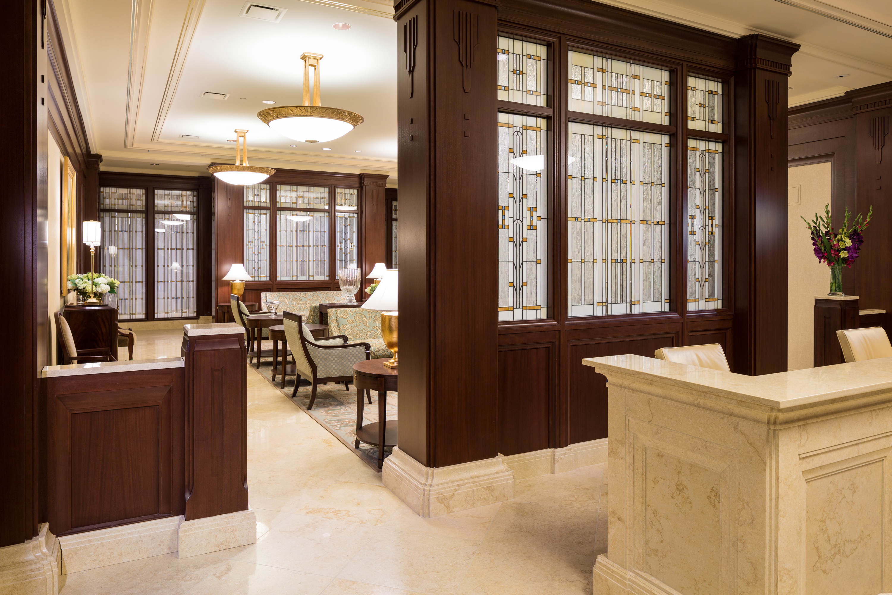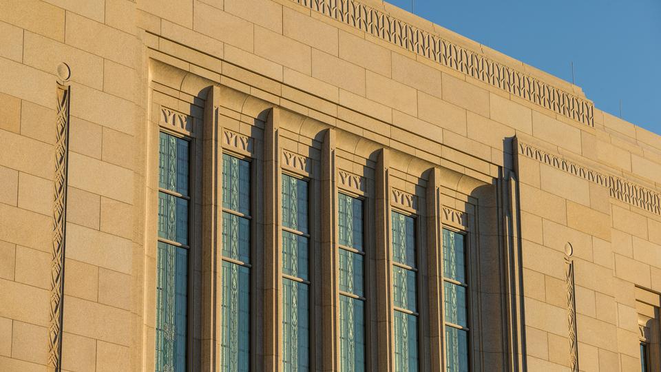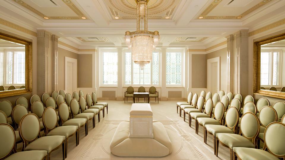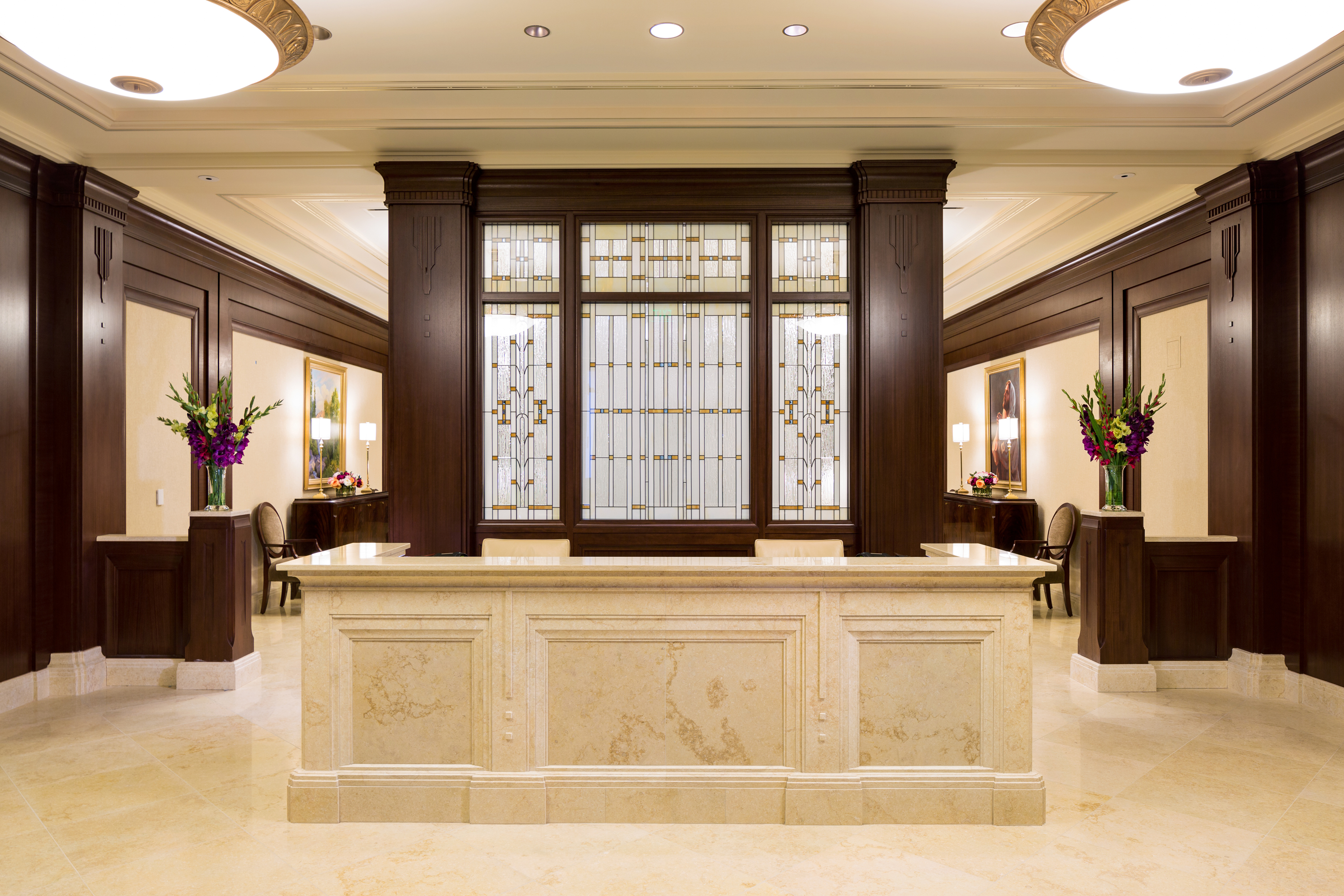 As part of the renovation, the temple’s entire exterior has been reshaped with new stone and art glass. The temple’s main entrance was moved from the west side to the east side, where it faces Washington Boulevard, one of the city’s main streets. The renovation of the temple also includes reconfigured rooms and new energy-saving electrical, heating, and plumbing systems. Other notable improvements include adding underground parking, new landscaping of the temple block, and the addition of a major water feature.