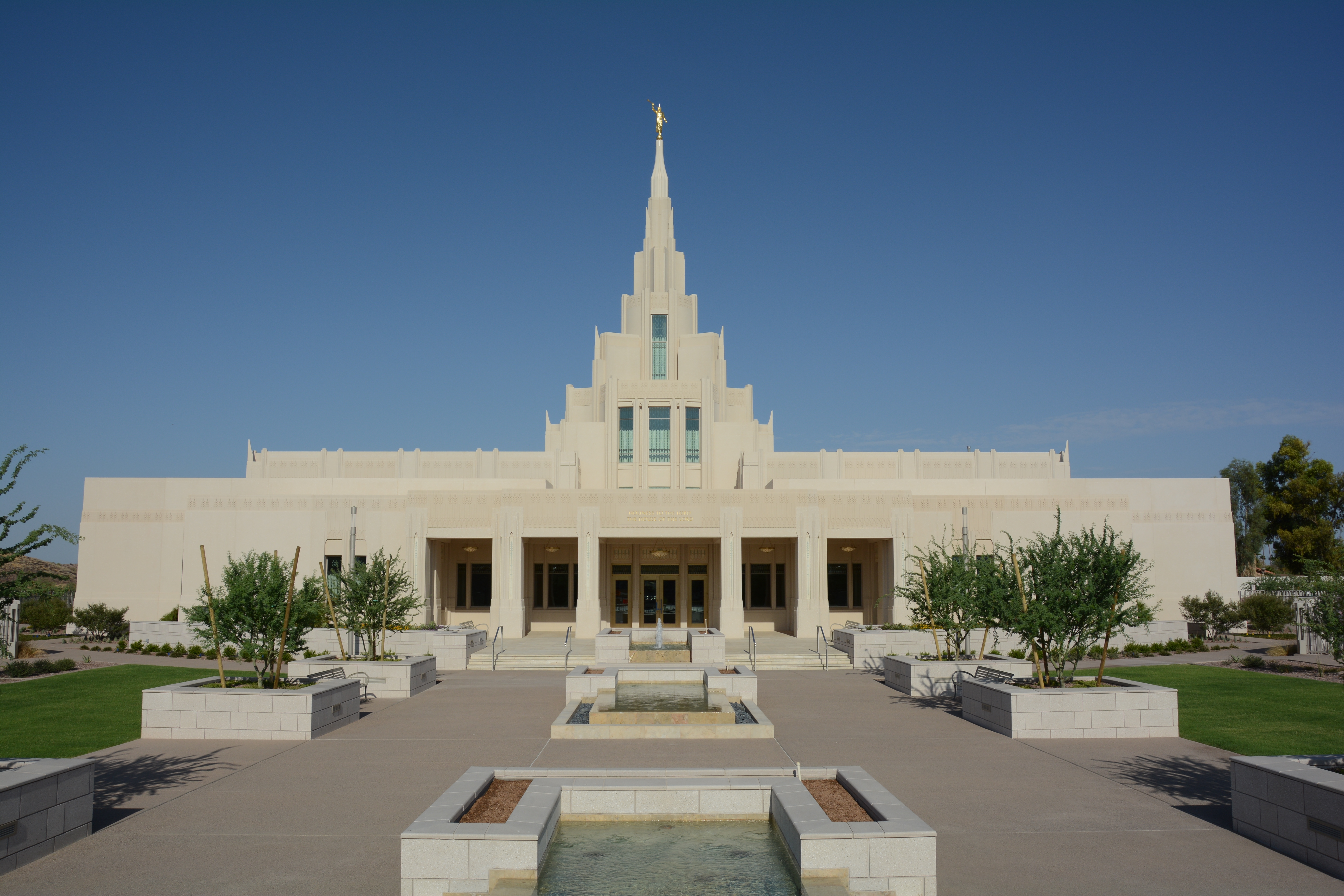 The Phoenix Temple sits on just over five acres adjacent to an existing meetinghouse located at the intersection of Pinnacle Peak Road and 51st Avenue. It is a single-story building and has a footprint of 27,423 square feet with a full basement and a 90-foot spire. The materials and workmanship are of the highest quality, and the grounds are created and maintained to bring a sense of peace and tranquility to those who enjoy the grounds and the surrounding community.