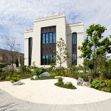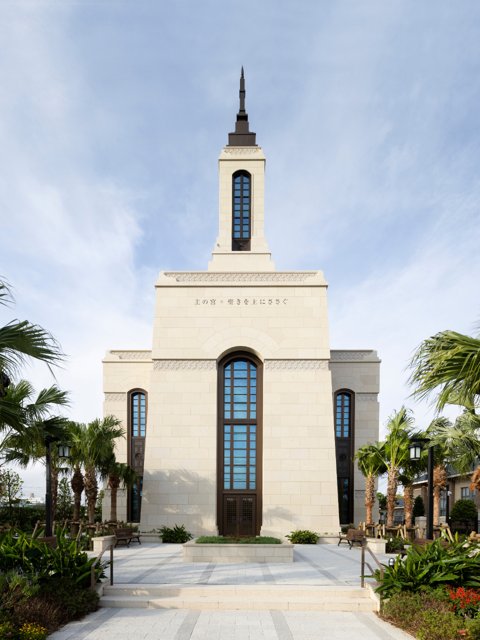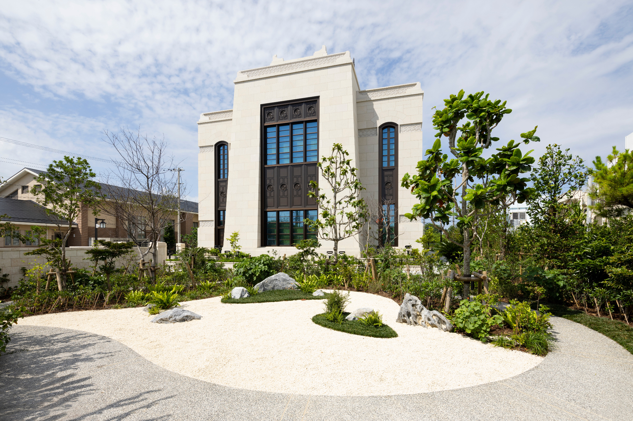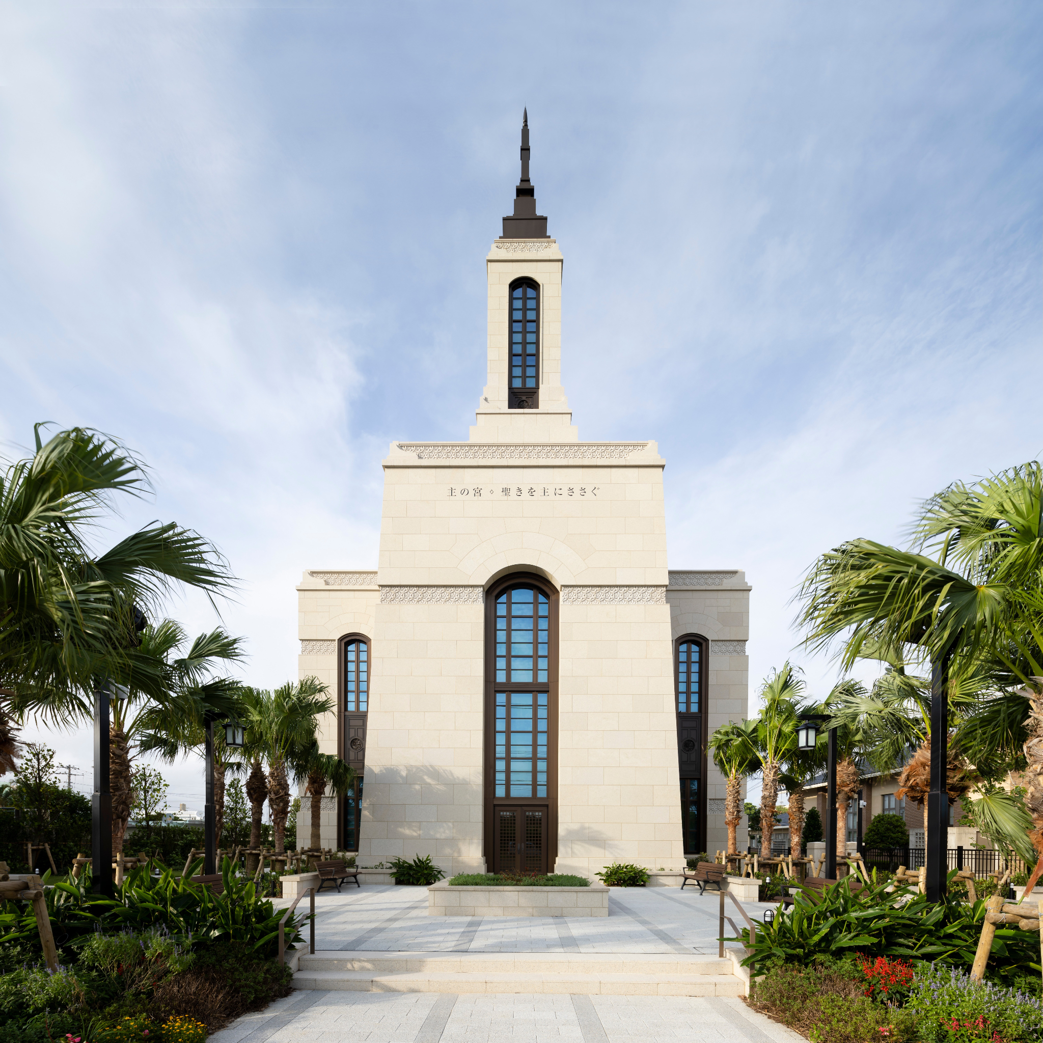The two-story, 10,000-square-foot temple is on a half-acre site at 7-11-32 Matsumoto, Okinawa-shi, in Okinawa-ken, Japan. A patron waiting area has been added to the adjacent meetinghouse that was completed in 2013.