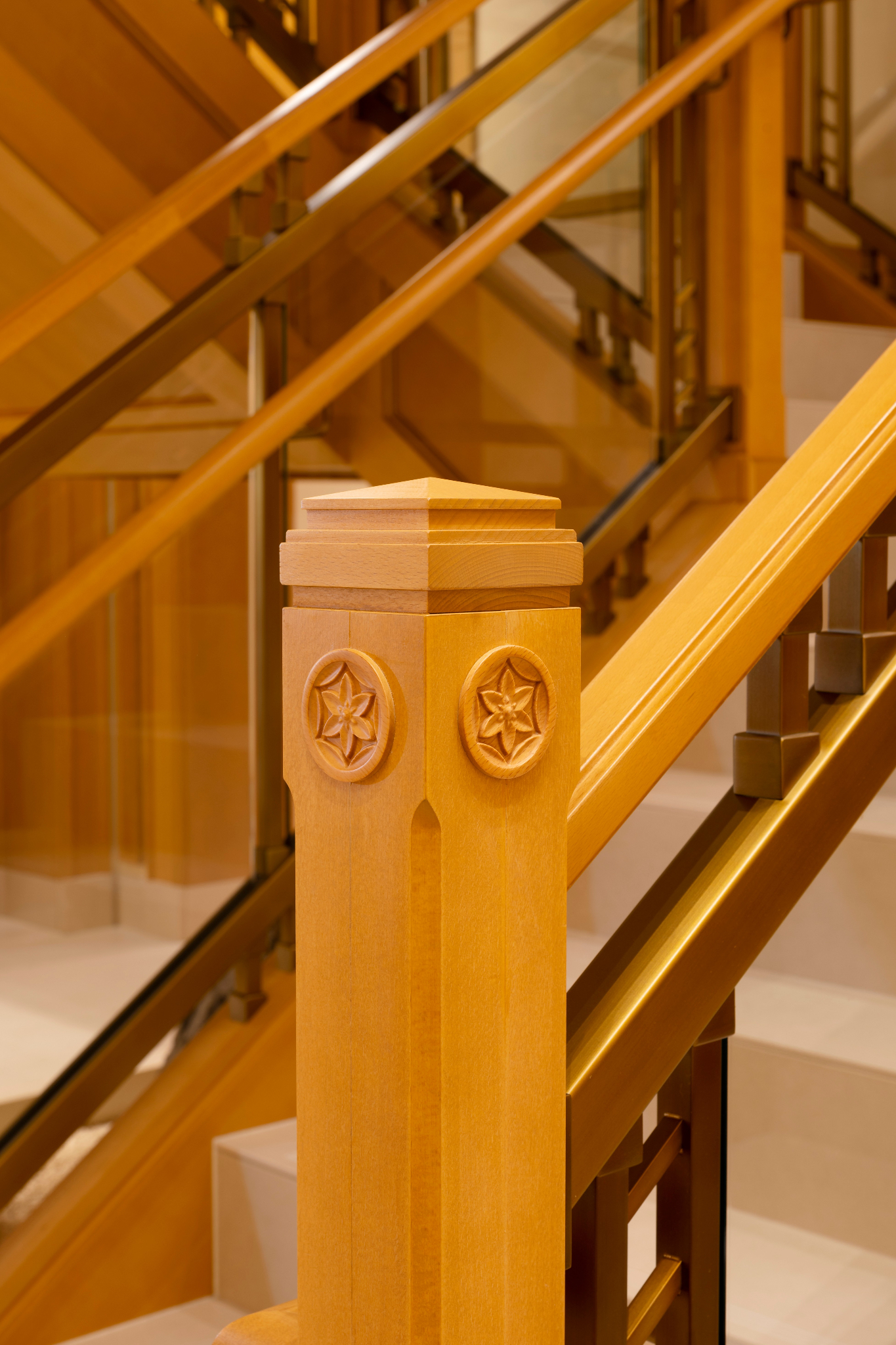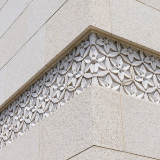 The stone is Sunset Gold Chinese granite from Wenshang, Shandong Province. The art glass design is inspired by Okinawan bingata stencils and patterns. Many native plants adorn the temple, such as fountain palms, sago palms and Chinese hibiscus.